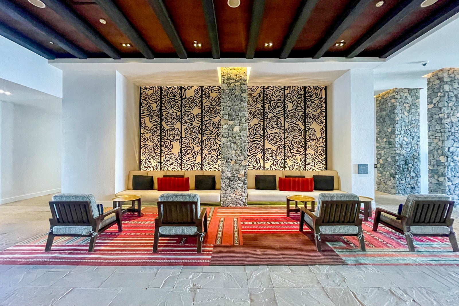 Upon arrival at the hotel, guests are greeted by an expansive lobby and directed to the comfortable lounge area.