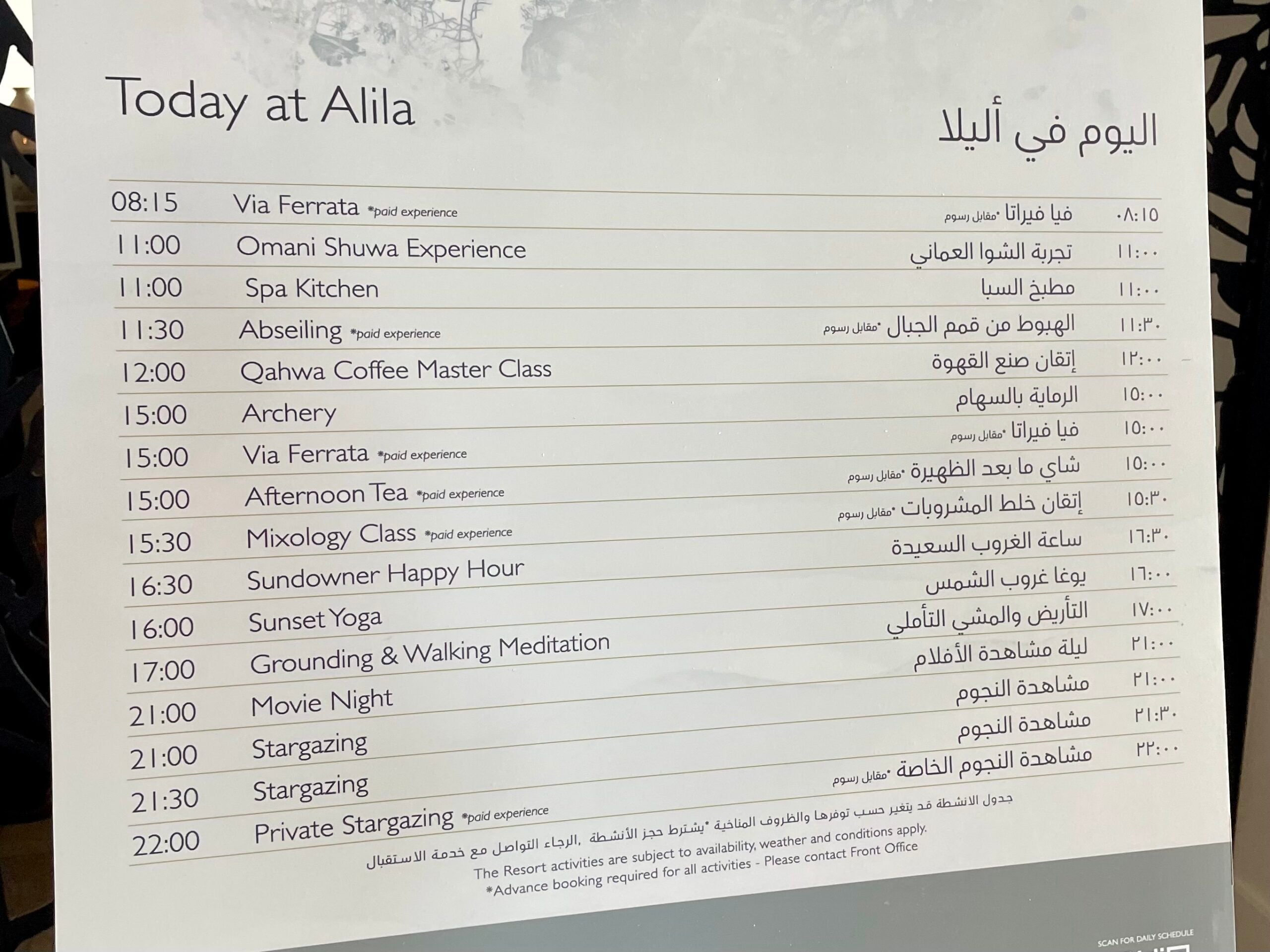A daily activities schedule is posted in the lobby and includes about half complimentary and half paid options, denoted by an asterisk. The offerings included a coffee class, archery, climbing along a via ferrata and stargazing, among other choices.