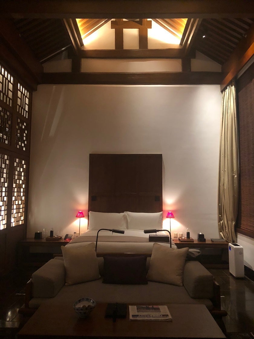 The suite decor was beautiful but very minimalist— the wooden carvings, bamboo blinds and hanging scripts with Chinese writing gave the room a regal feel. Aman didn't miss a detail — fresh orchids and complimentary water bottles were carefully placed around the suite. To enter, you needed to cross through a beautiful courtyard garden, and it was all so serene.