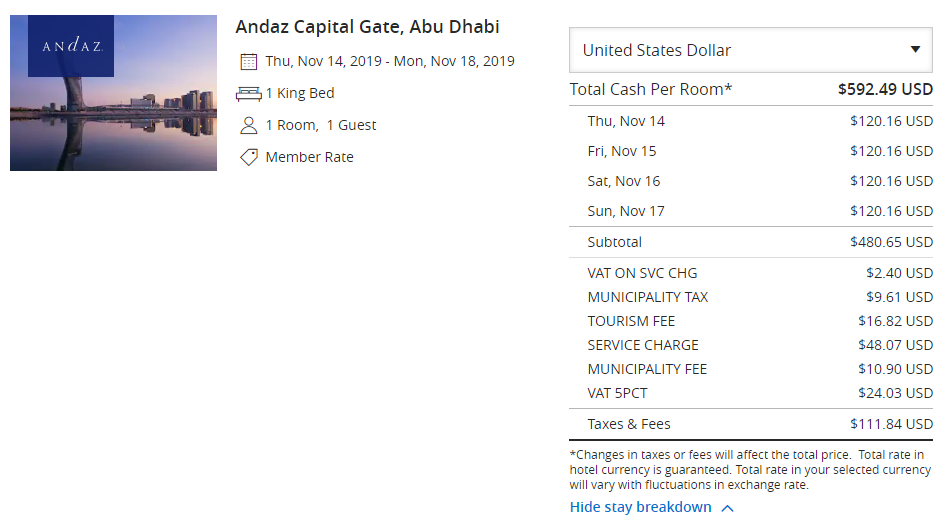 I needed to stay for four nights in Abu Dhabi between two flight reviews. I likely would've stayed at the Holiday Inn Abu Dhabi Downtown for $91 or 25,000 IHG points per night if this hadn't been a work trip, but TPG decided I should review the Andaz Capital Gate Abu Dhabi for $148 (after taxes and fees) or 8,000 World of Hyatt points per night. At TPG's valuations, 8.000 Hyatt points are worth about $136, so we were able to get slightly higher than 1.7 cents per point on this redemption.