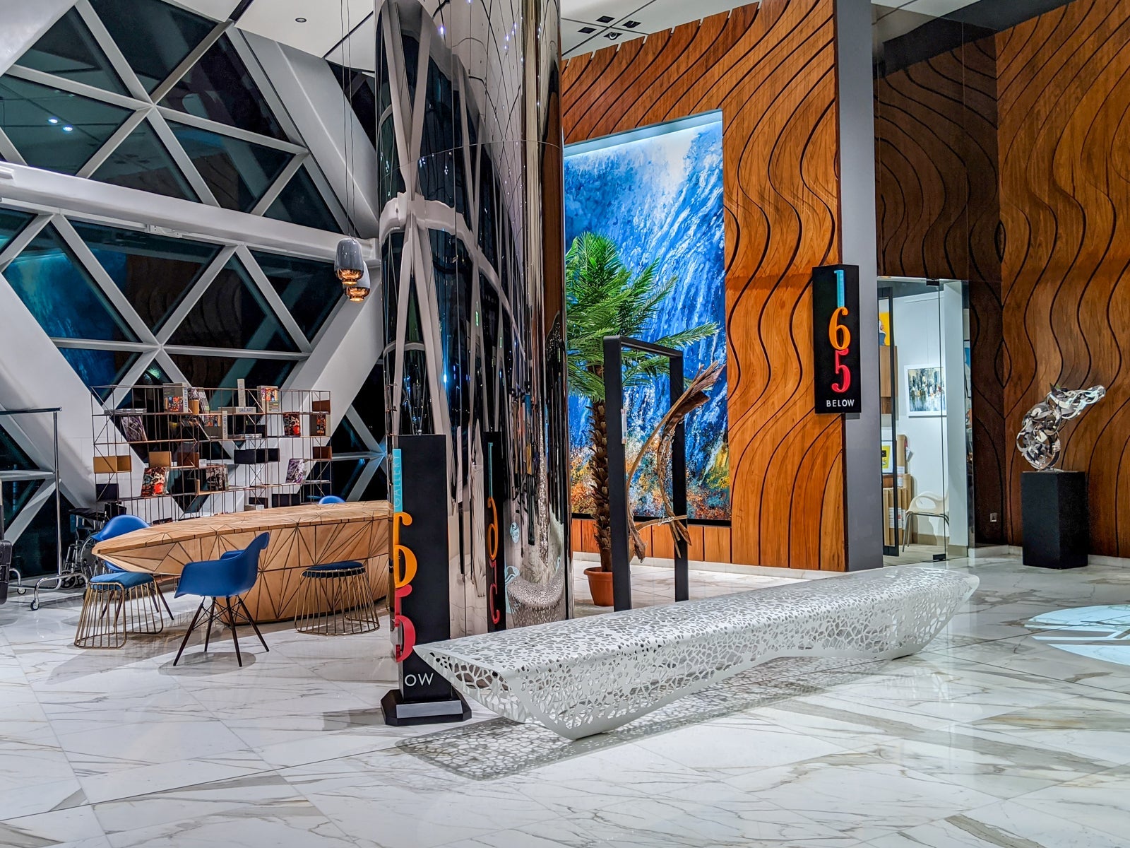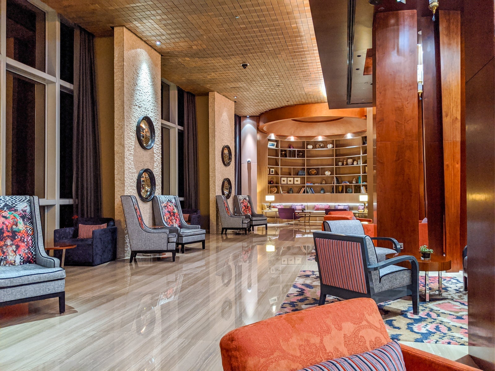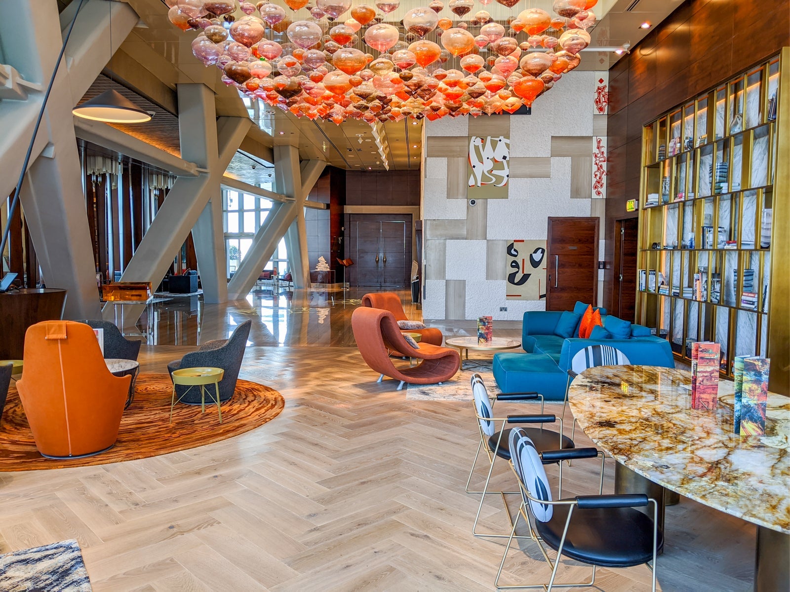 My flight arrived just after 1 a.m., and I arrived at the hotel around 2 a.m. My Uber dropped me off at the hotel's main entrance, but the ground floor lobby -- which was set up as an art gallery -- was completely empty besides a roaming security guard. I initially wasn't sure what to do, but then I noticed elevators and remembered the hotel lobby was on the 18th floor.