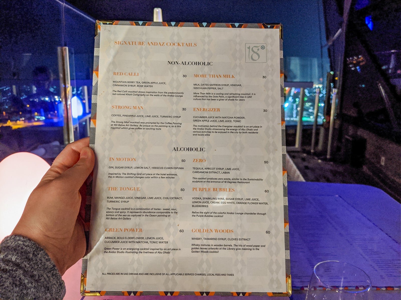 There were two primary dining options at the Andaz Capital Gate: the Andaz Lounge and 18 degrees. 18 degrees was the main restaurant on site.