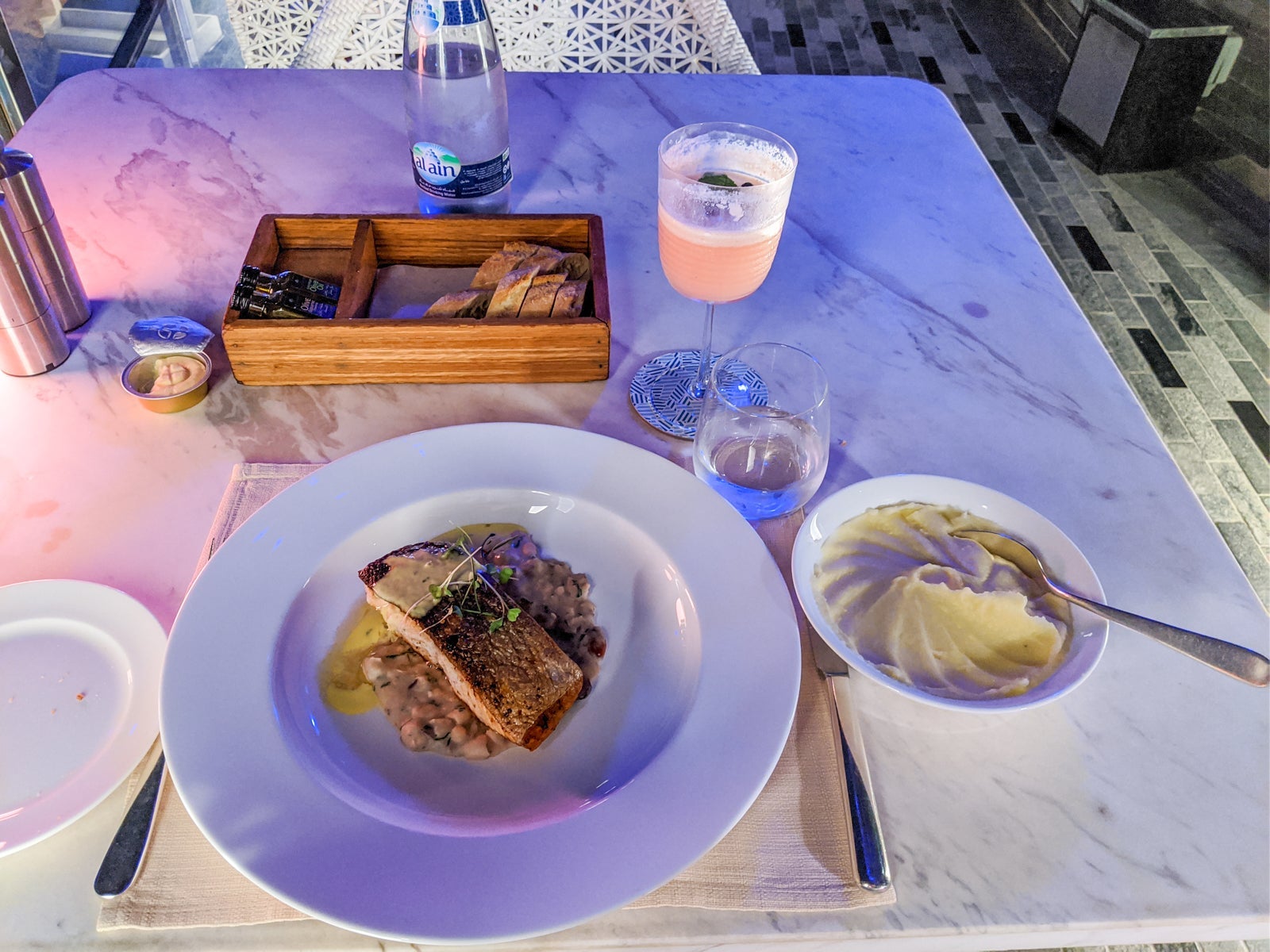 For dinner at 18 degrees, I ordered the salmon steak for 102 dirhams (a little under $30) and a side of mashed potatoes for 31 dirhams ($8). The salmon was moist and perfectly cooked, but I would have preferred some seasoning on the fish. The salmon was served on top of a white bean mash, which complemented the fish. The mashed potatoes were creamy and lightly seasoned, making them an appealing comfort food.