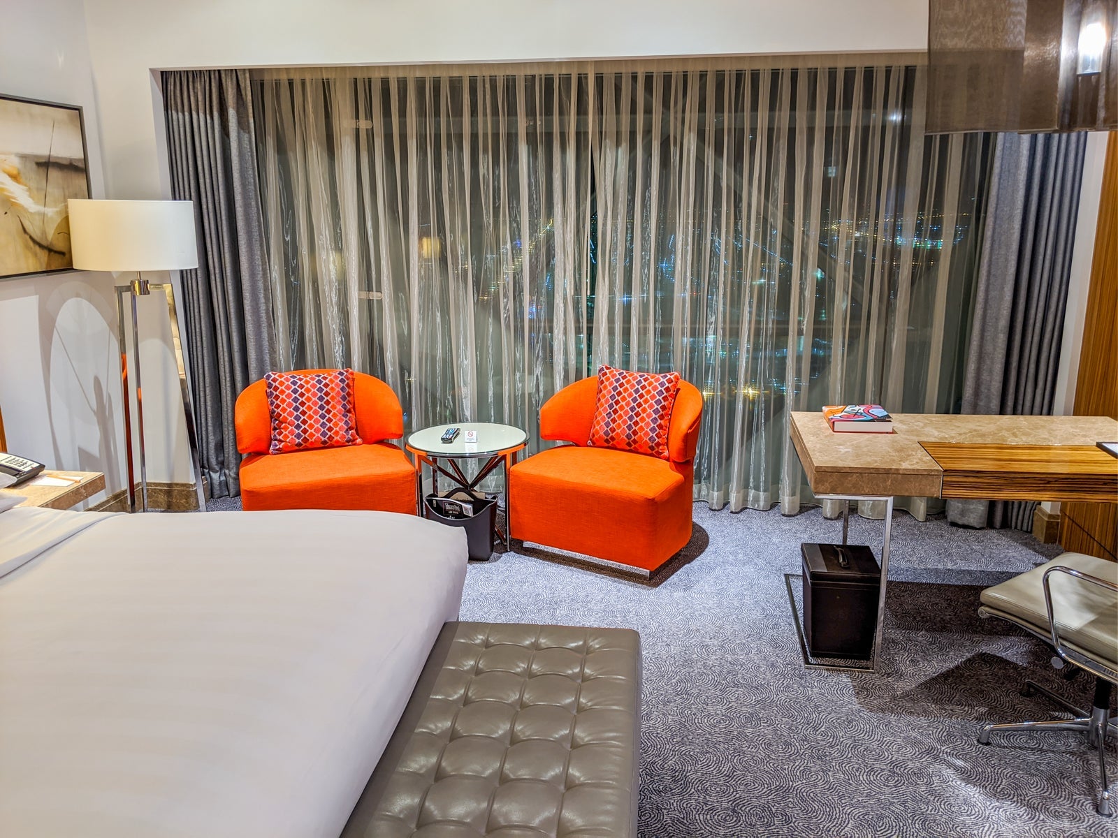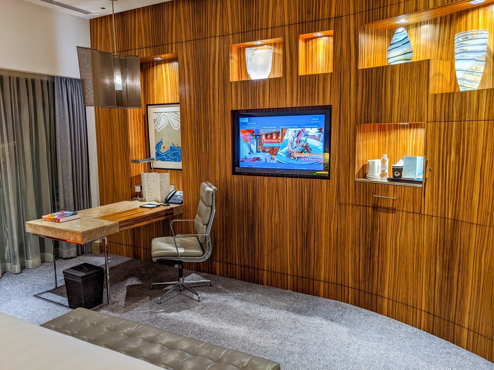 Next to the chairs was a desk that faced the windows. It was great to look out across Abu Dhabi while working. The desk chair didn't have wheels, though, so I had to actively work to slide it in toward the desk.