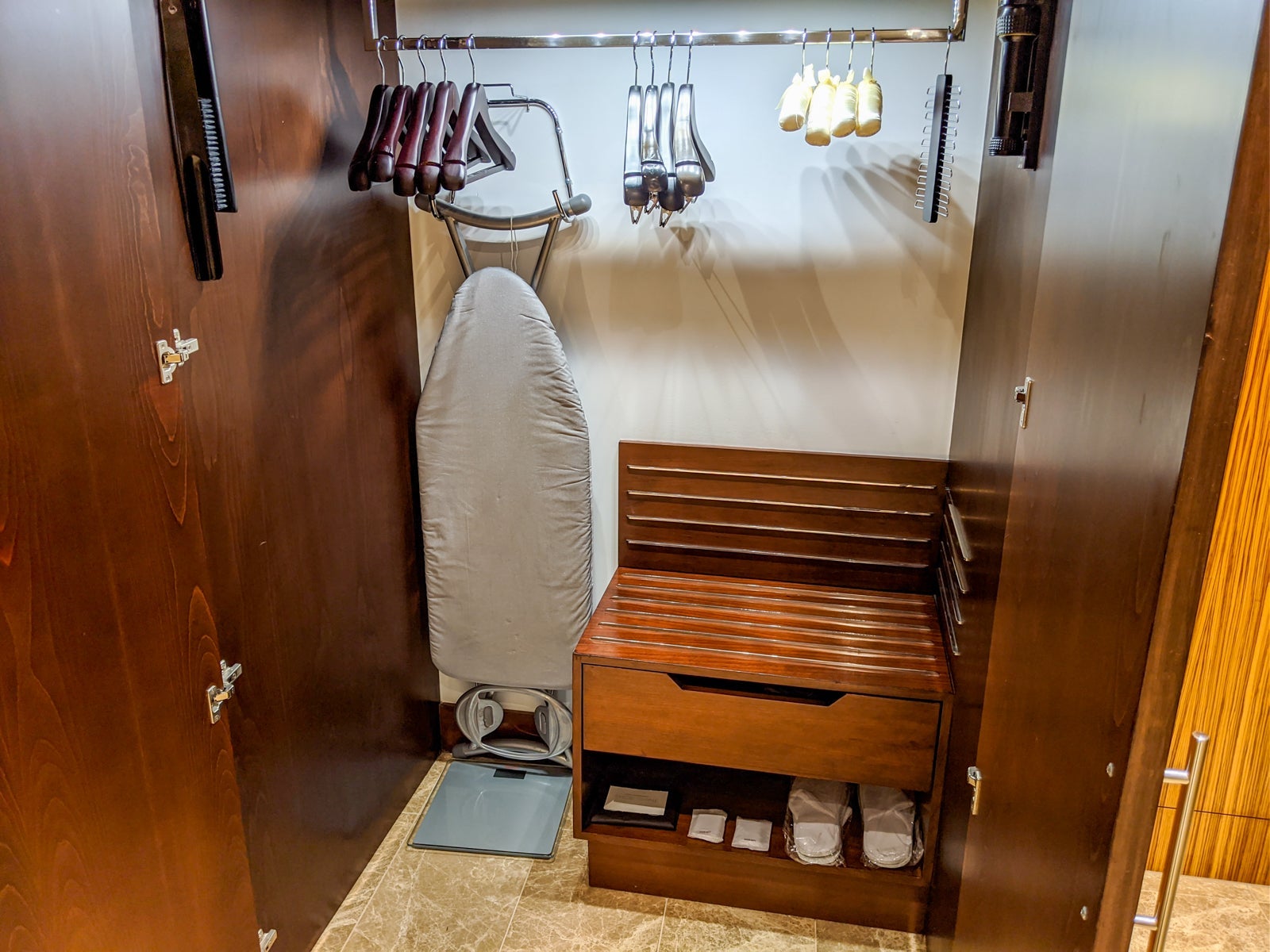 The other two closet doors opened to a lighted closet with 13 hangers, a luggage shelf, an iron and ironing board, a bag for complimentary shoe polishing, two pairs of slippers, a scale and information about the laundry service.