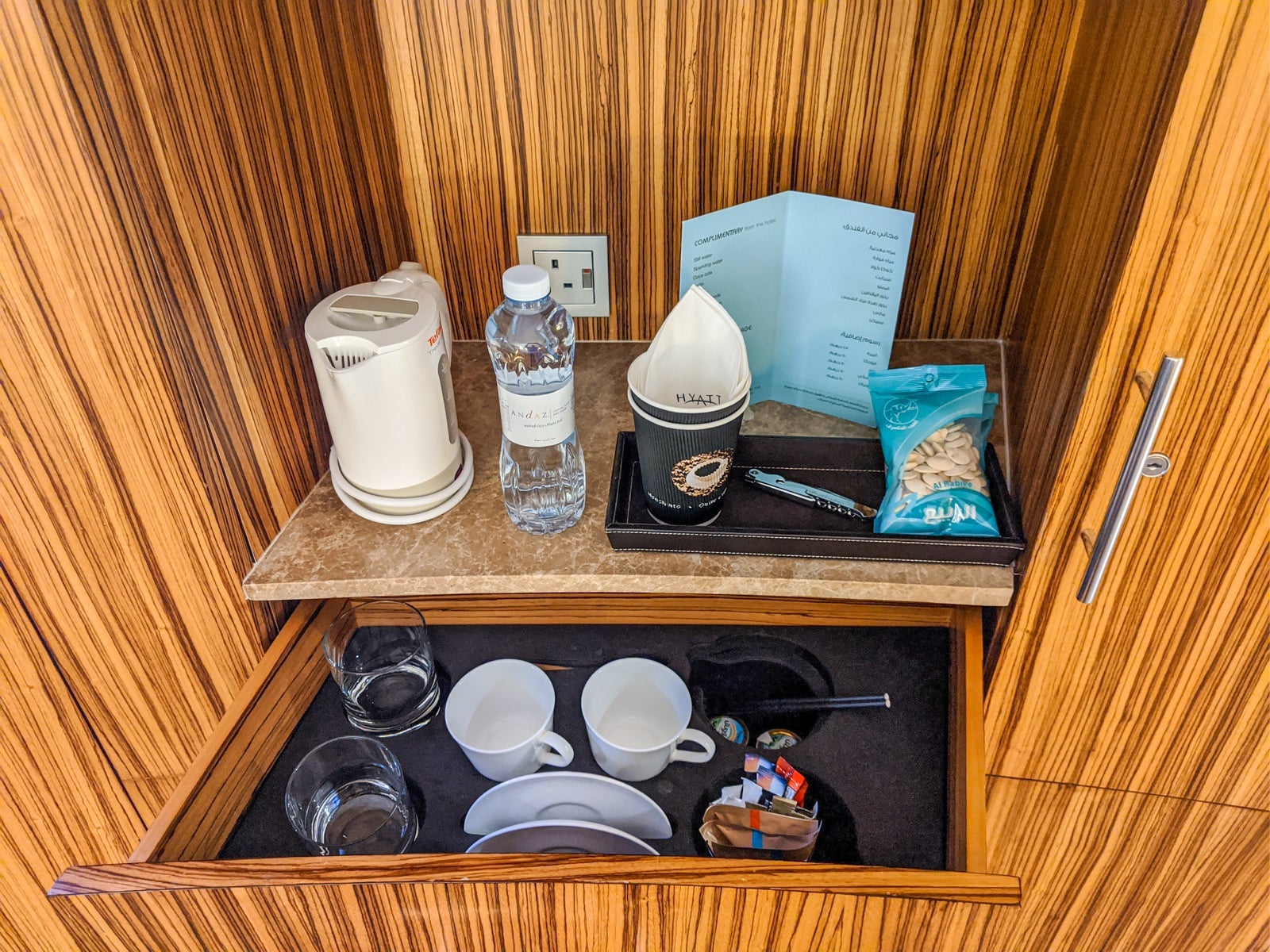 Next to the television was a small nook with a small teakettle, water bottles and a minibar.
