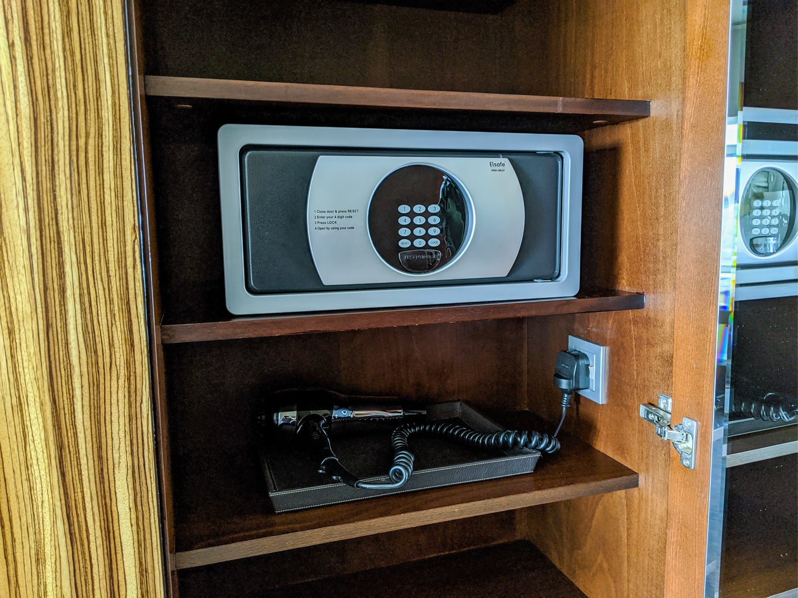 Across from the green robe were three closet doors. The first door opened to nine shelves, one of which contained a safe and another with a tray with a hairdryer.