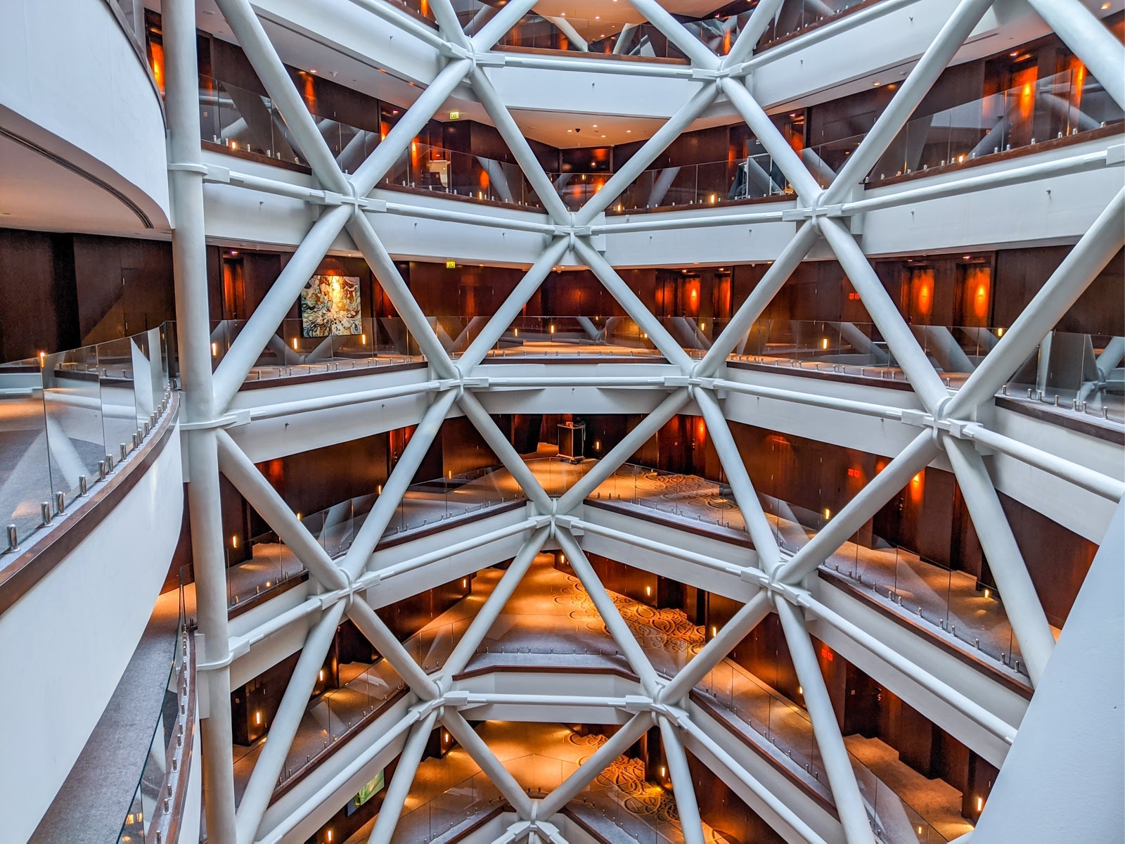 The guest rooms were along the edges of the building, with a hollow center atrium. The support structure in the atrium was beautiful, although pictures didn't properly capture the feel.