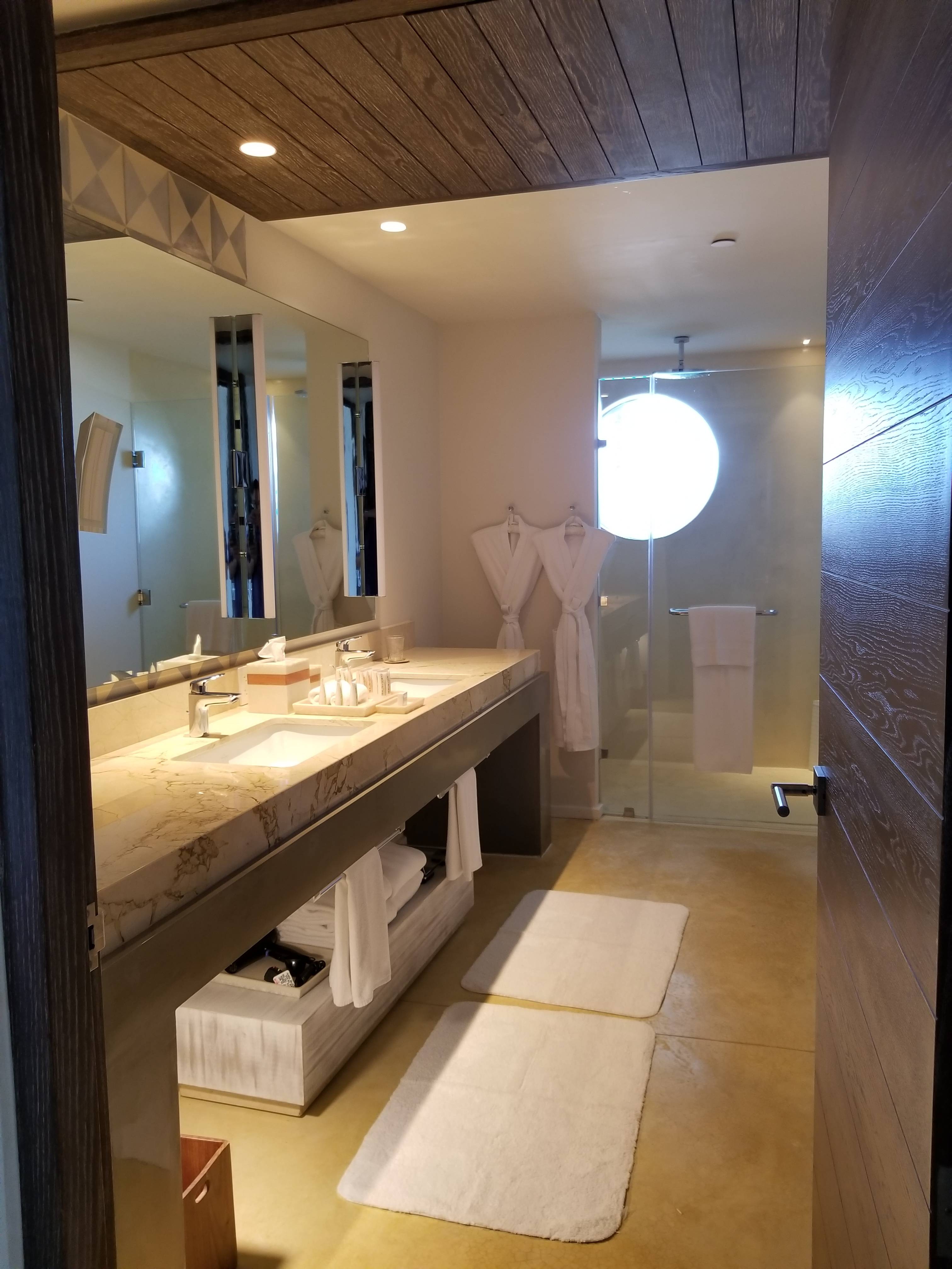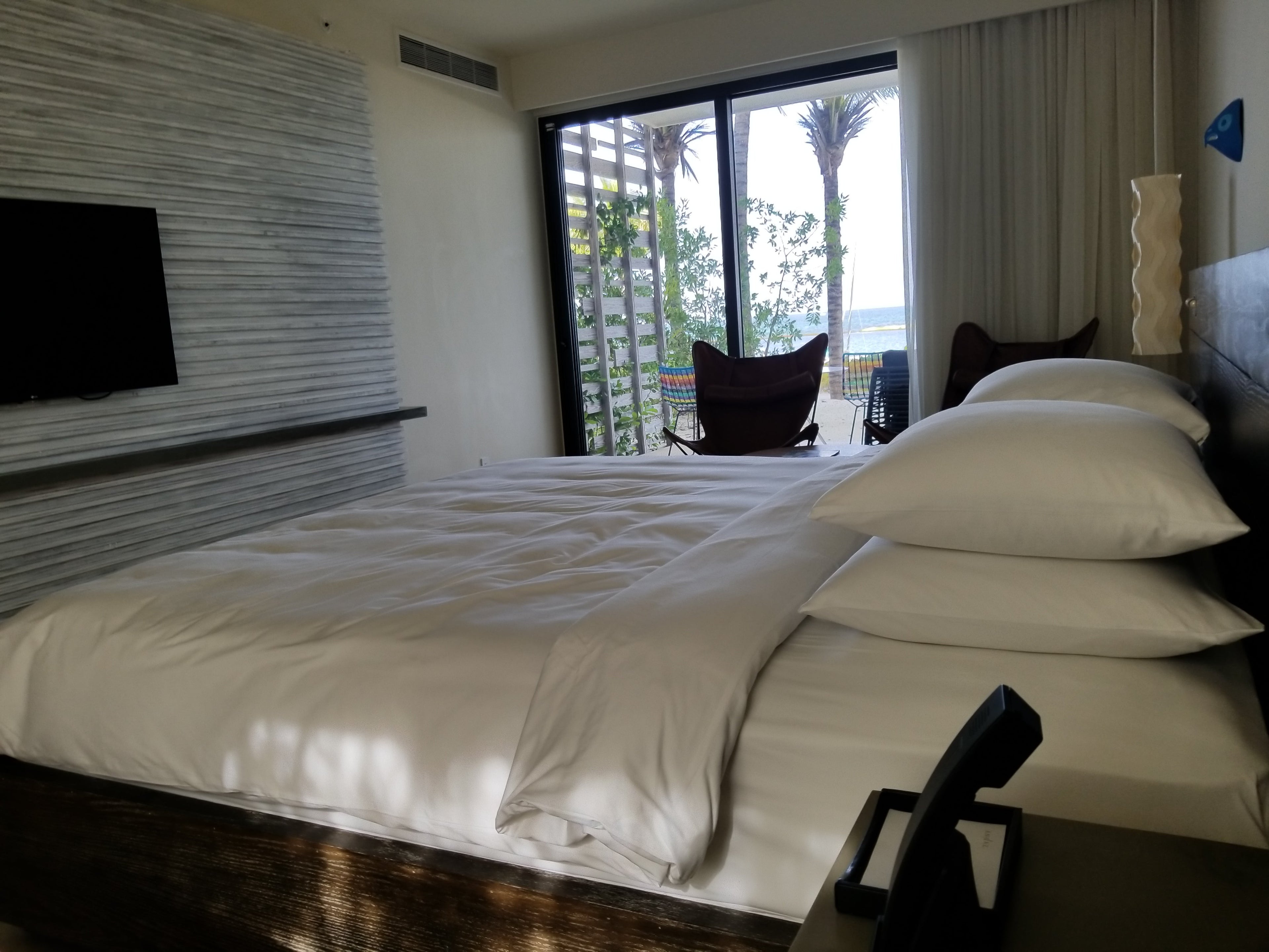 Entering into the living room, I could immediately see the beach and turquoise Caribbean beyond through the large patio windows. The 1,100-square-foot suite had a separate bedroom with a comfortable king bed and its own patio. The walk-in closet featured a safe, robes and flip-flops of various sizes (guests could keep the flip-flops). The bathroom had plenty of space to scatter one's stuff across two sinks, a large rainfall shower with a separate handheld wand and a partially frosted window overlooking the beach. A selection of Malin+Goetz toiletries added an elegant touch, and there was an ample supply of fluffy white towels. The toilet and a third sink were in a separate room. Our daughter slept on the large sofa and her friend on a rollaway in the living room, and there was still plenty of space to walk around.