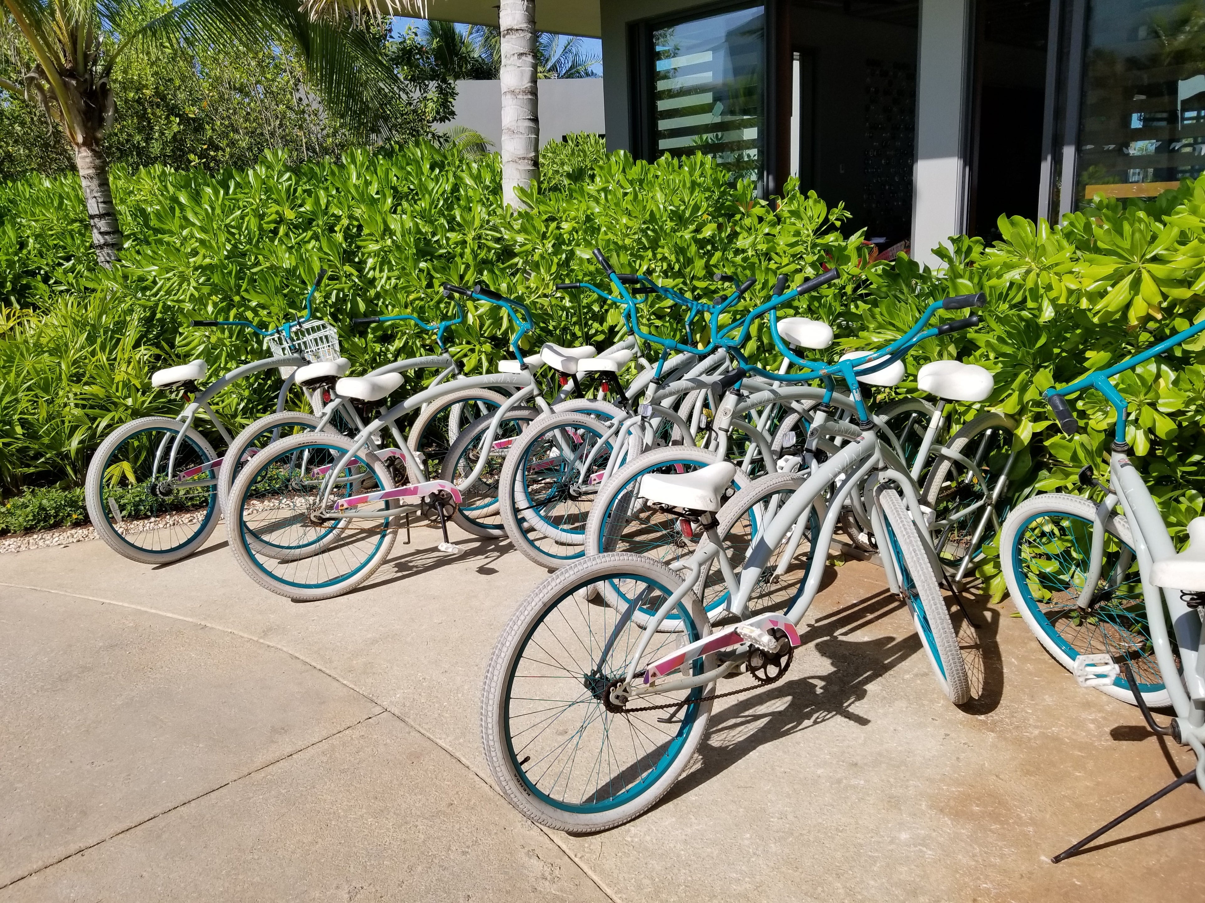 Available for use were a large number of single-speed bicycles near all the rooms, which you could use anytime and take most anywhere on the very scenic property. It was about a mile between the beach and the lagoon areas, and it was an easy ride. I'm not a big biking guy, but there was a wonderful little paved nature trail that connected the four resorts and a little shopping village with nifty shops and a chapel. There was also a place where you could take local cooking classes. When we stopped at the lobby of each of the other resorts, we were welcomed with bottles of cold water from almost all of them.