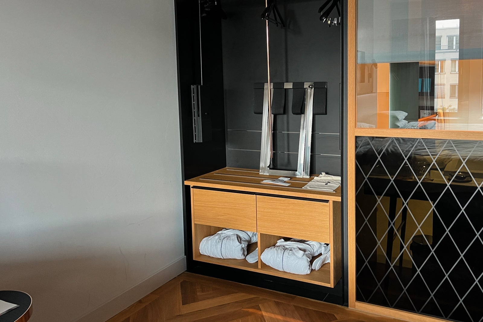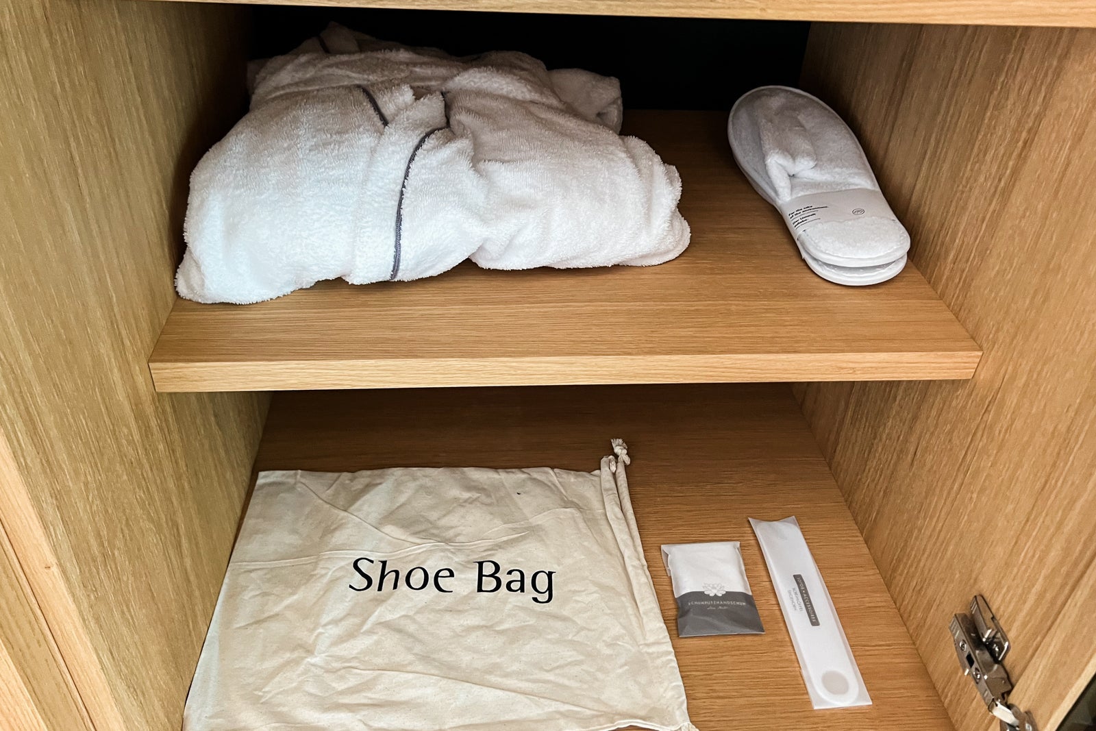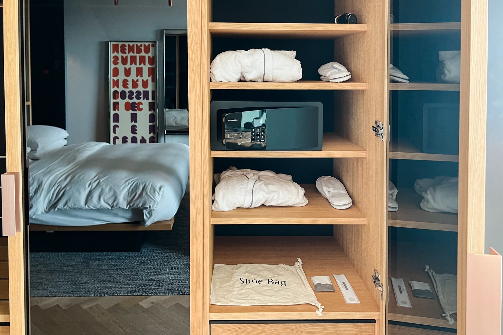 My room was equipped with a large, rotating flat-screen 65-inch TV, a hair dryer, plush robes and slippers, blackout curtains, Nespresso-style coffeemaker and electric kettle, iron and ironing board. There were several large closets along one of the walls with plenty of room for hanging garments and storing luggage. The closets also lit up at night, which created a cool effect in the room.