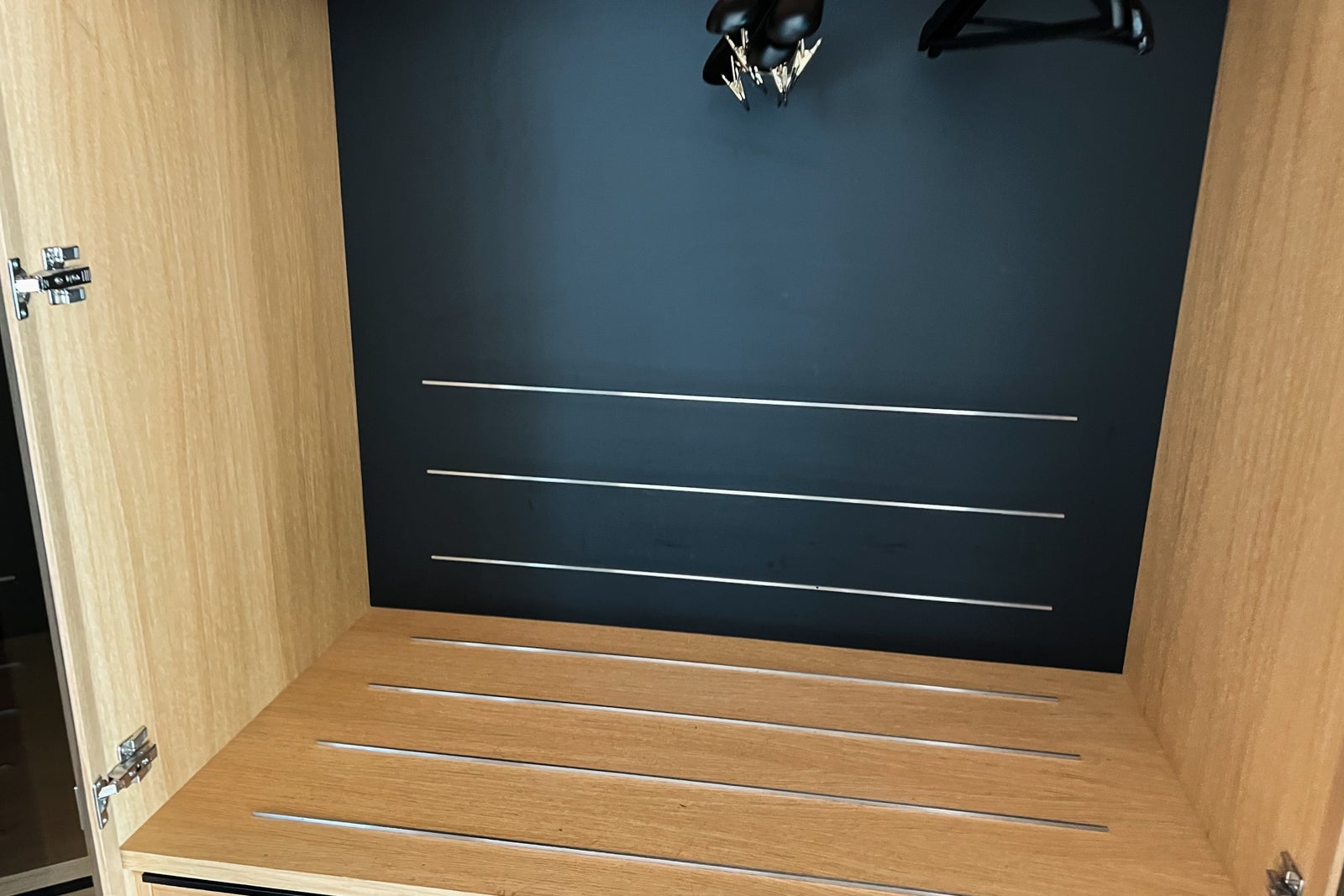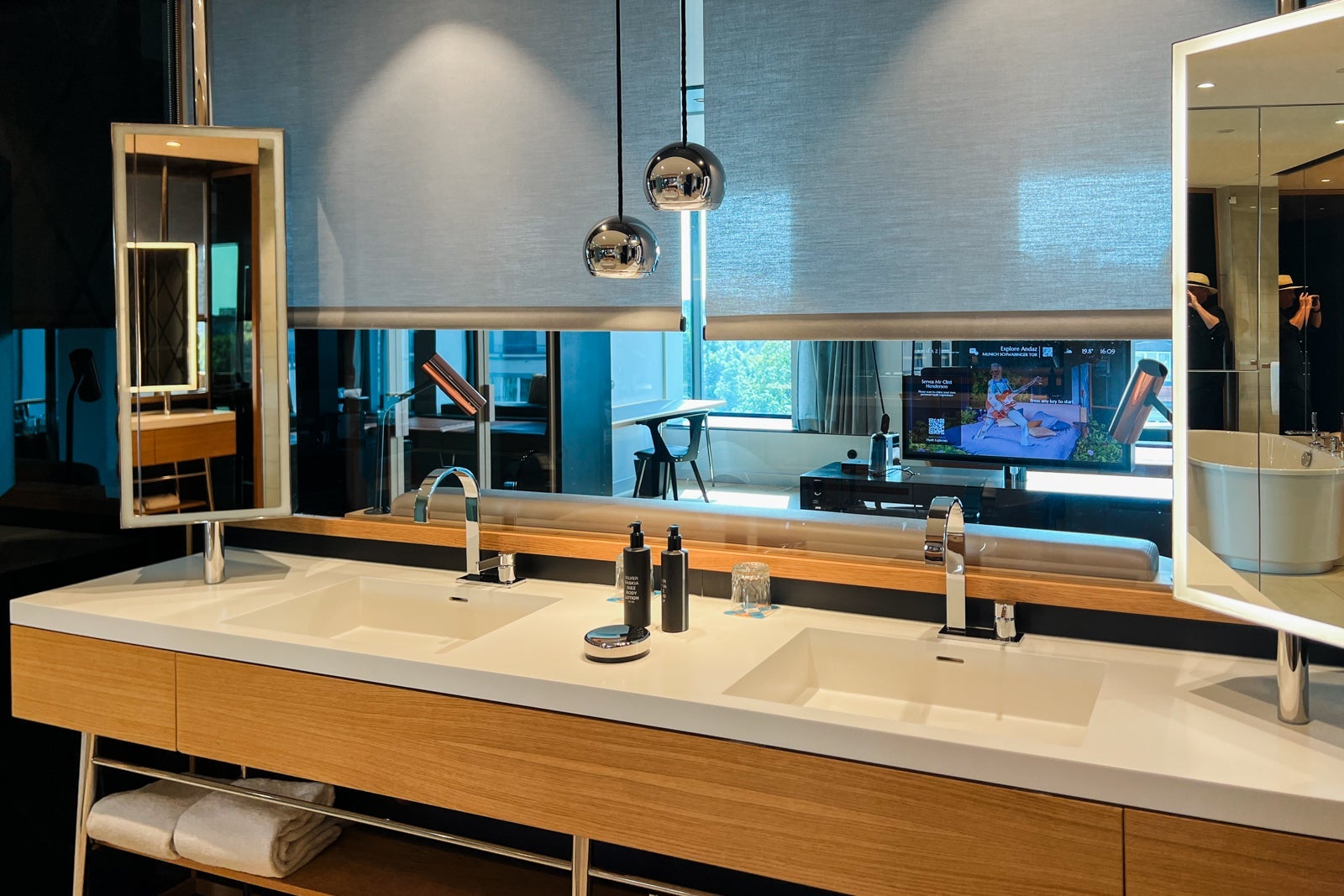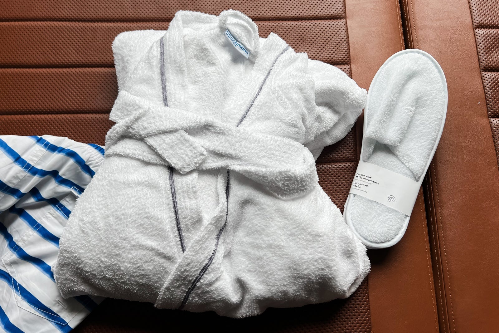 My room was equipped with a large, rotating flat-screen 65-inch TV, a hair dryer, plush robes and slippers, blackout curtains, Nespresso-style coffeemaker and electric kettle, iron and ironing board. There were several large closets along one of the walls with plenty of room for hanging garments and storing luggage. The closets also lit up at night, which created a cool effect in the room.