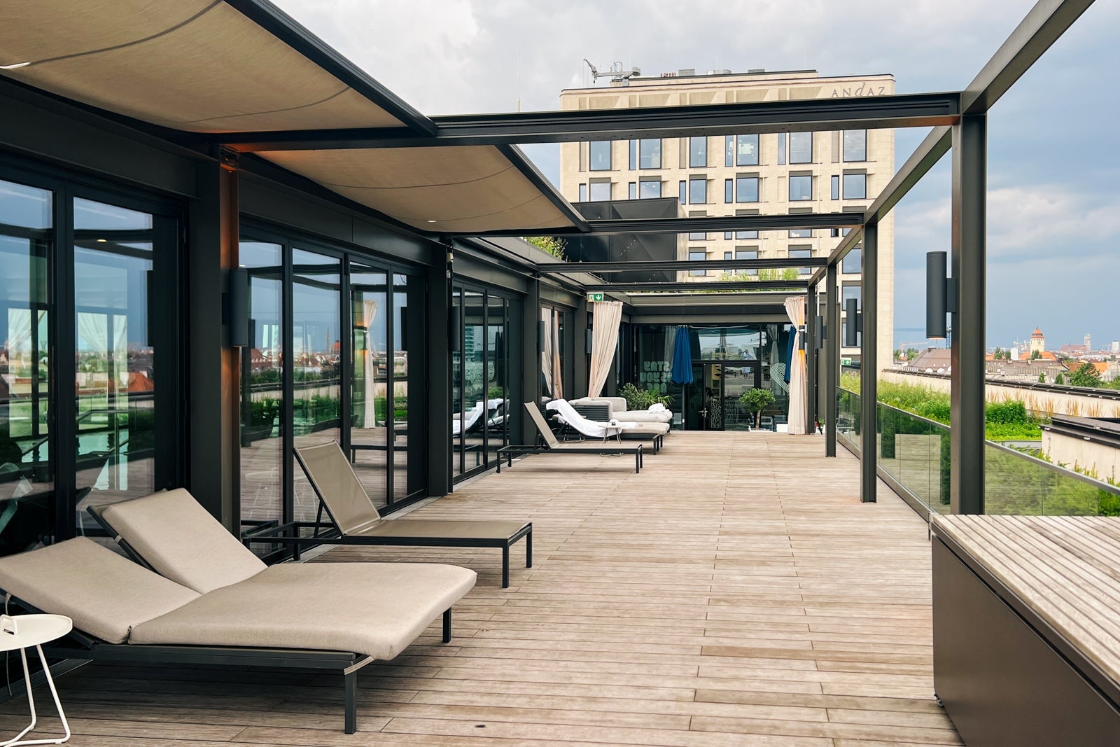 According to the hotel, the 22,000-square-foot spa at Andaz Munich is the largest in the city, with two levels, a swimming pool and a wraparound rooftop terrace with 360-degree views of the city.