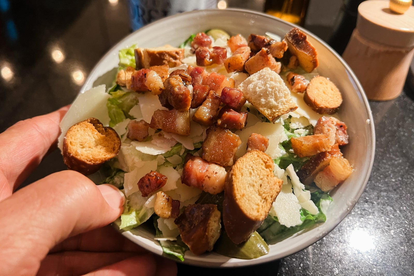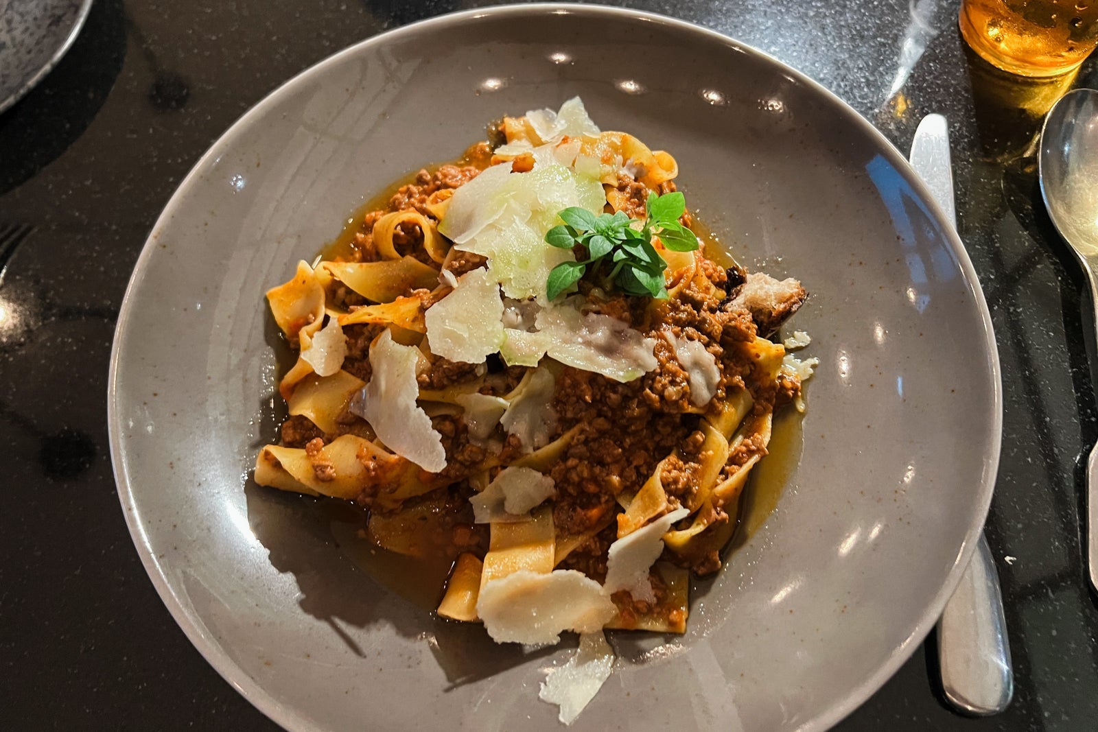 Dinner was wonderful with friendly and efficient service despite the restaurant being full. They brought warm bread with butter and olive oil to the table. I had a small Caesar salad ($16.50) topped with pretzel croutons. For my main dish, I ordered the pappardelle bolognese for $23. The pasta was slightly al dente with a delicious meat sauce. I dunked a few pieces of bread in because it was so good.