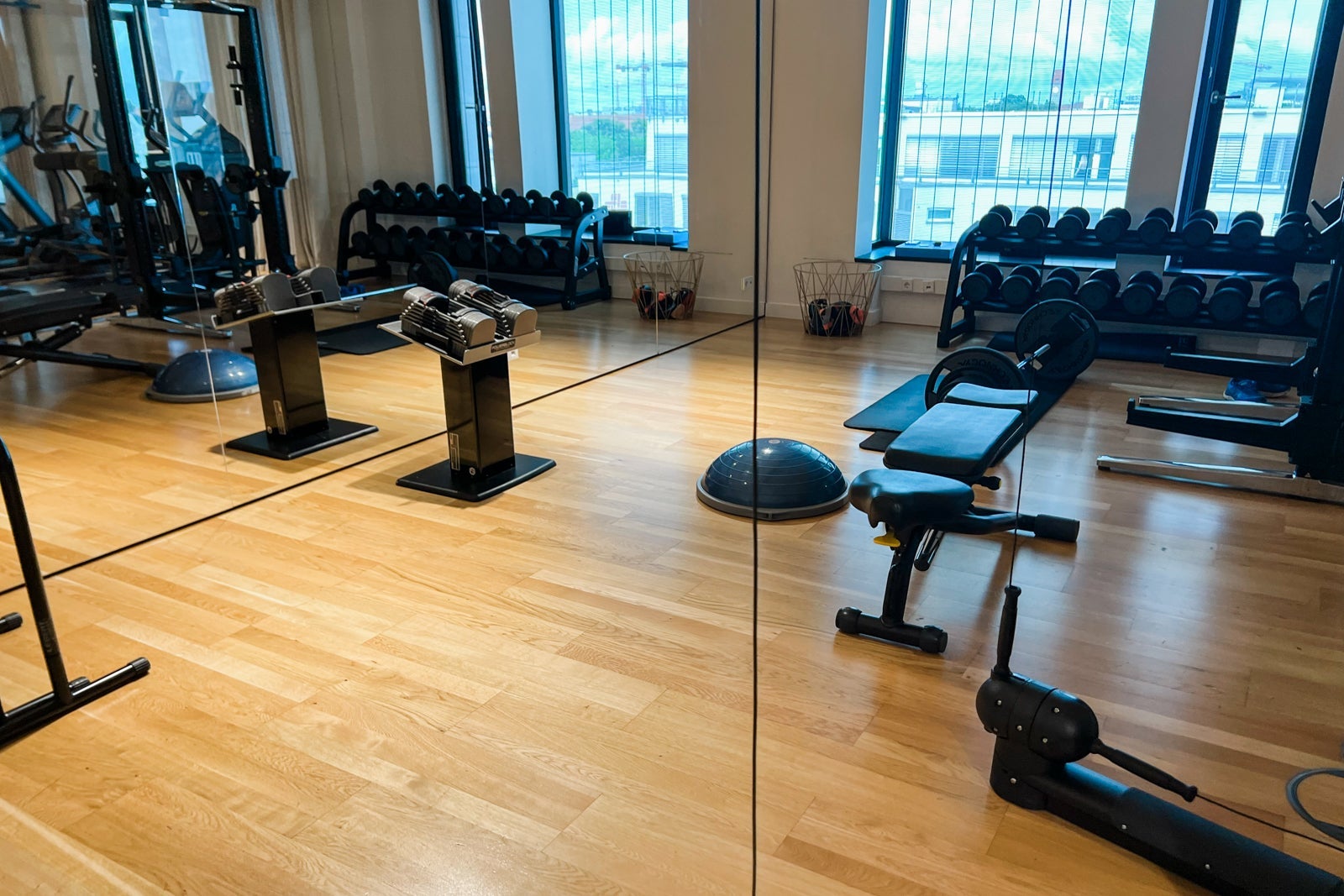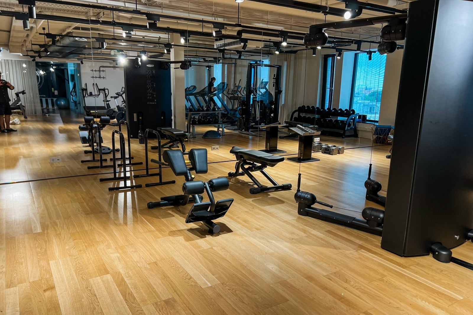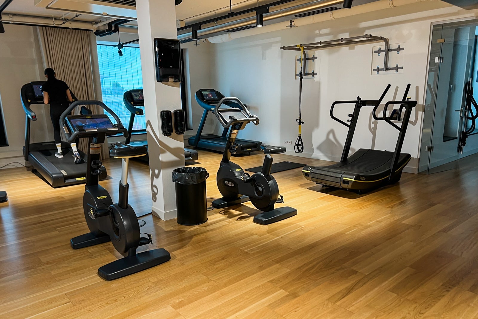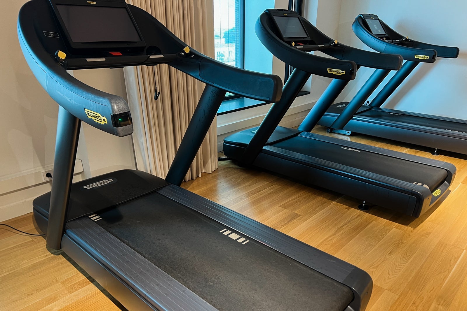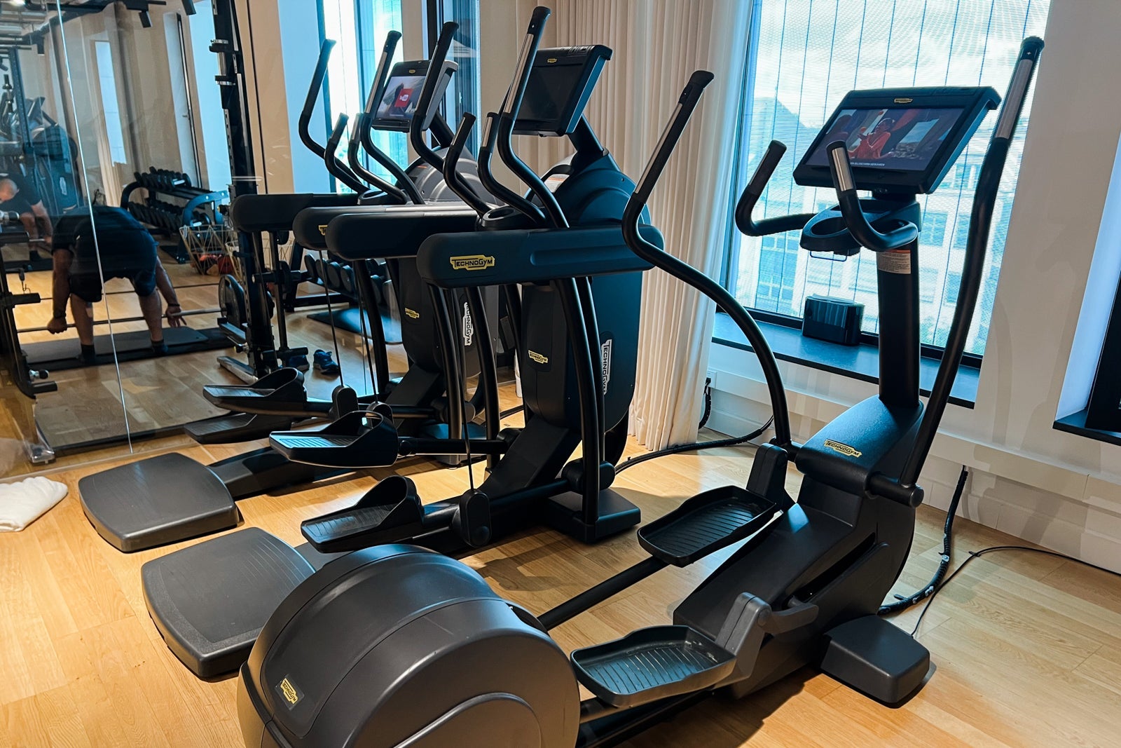 The gym back down on the fifth floor was spread across two rooms and had several TechnoGym treadmills and elliptical machines. There was also a Peloton bike, which wasn't working during my visit. There was a rack of free weights and a few machines, but I wasn't very impressed with the selection of workout equipment.