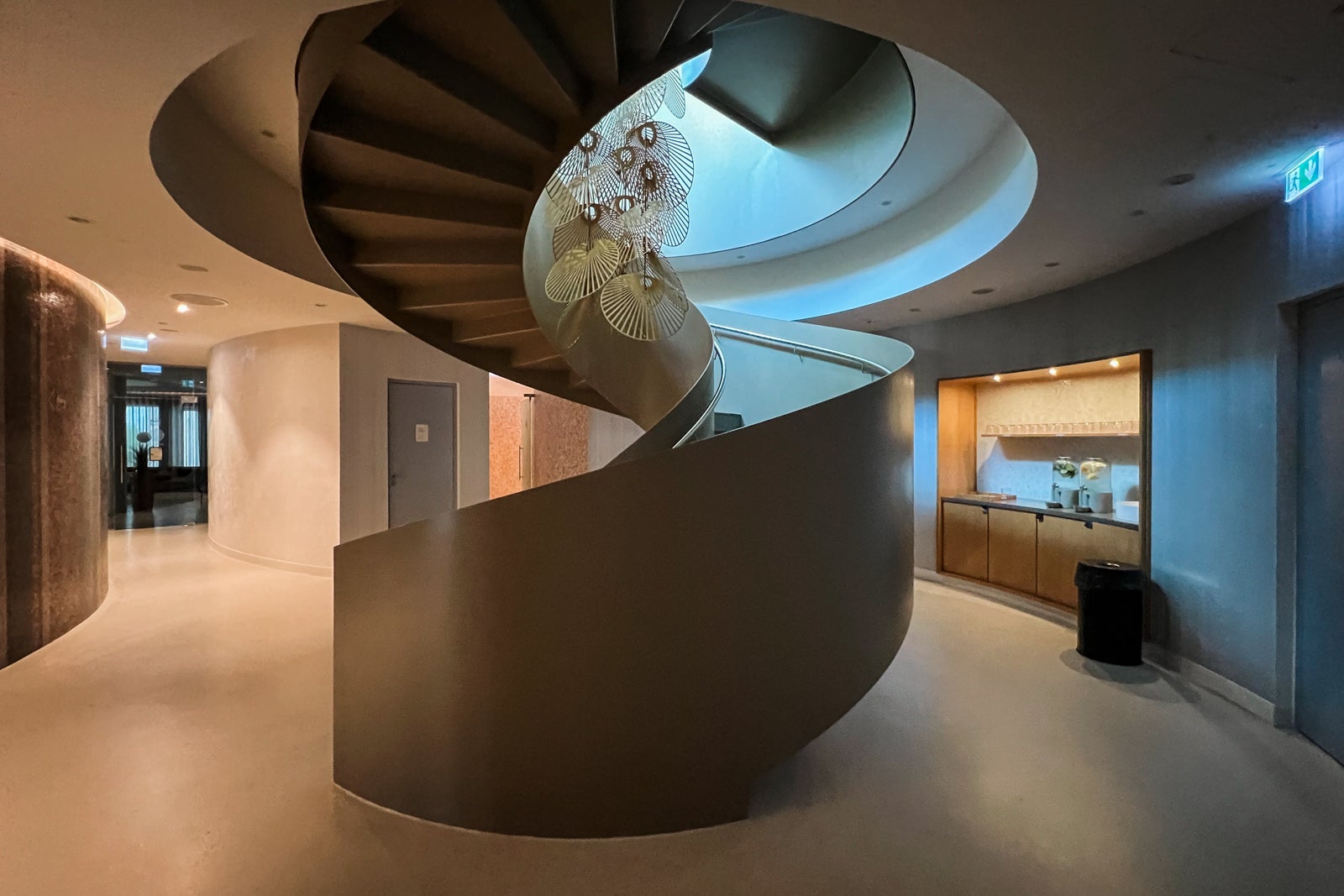 The dramatic curved stairway leading up to the rooftop terrace and pool was the centerpiece of the fifth floor.