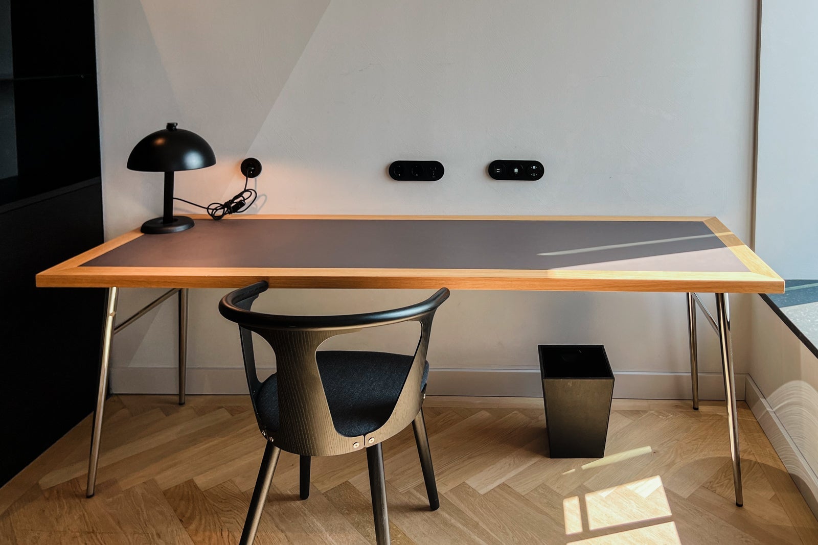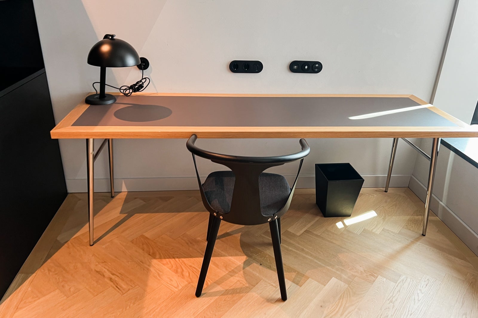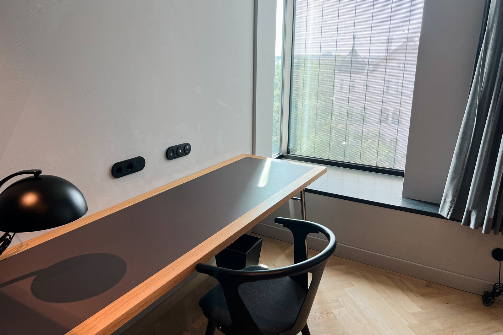 I enjoyed the stark desk with plenty of outlets that gave me a clean space to get some work done with a cityscape view just off to the right.