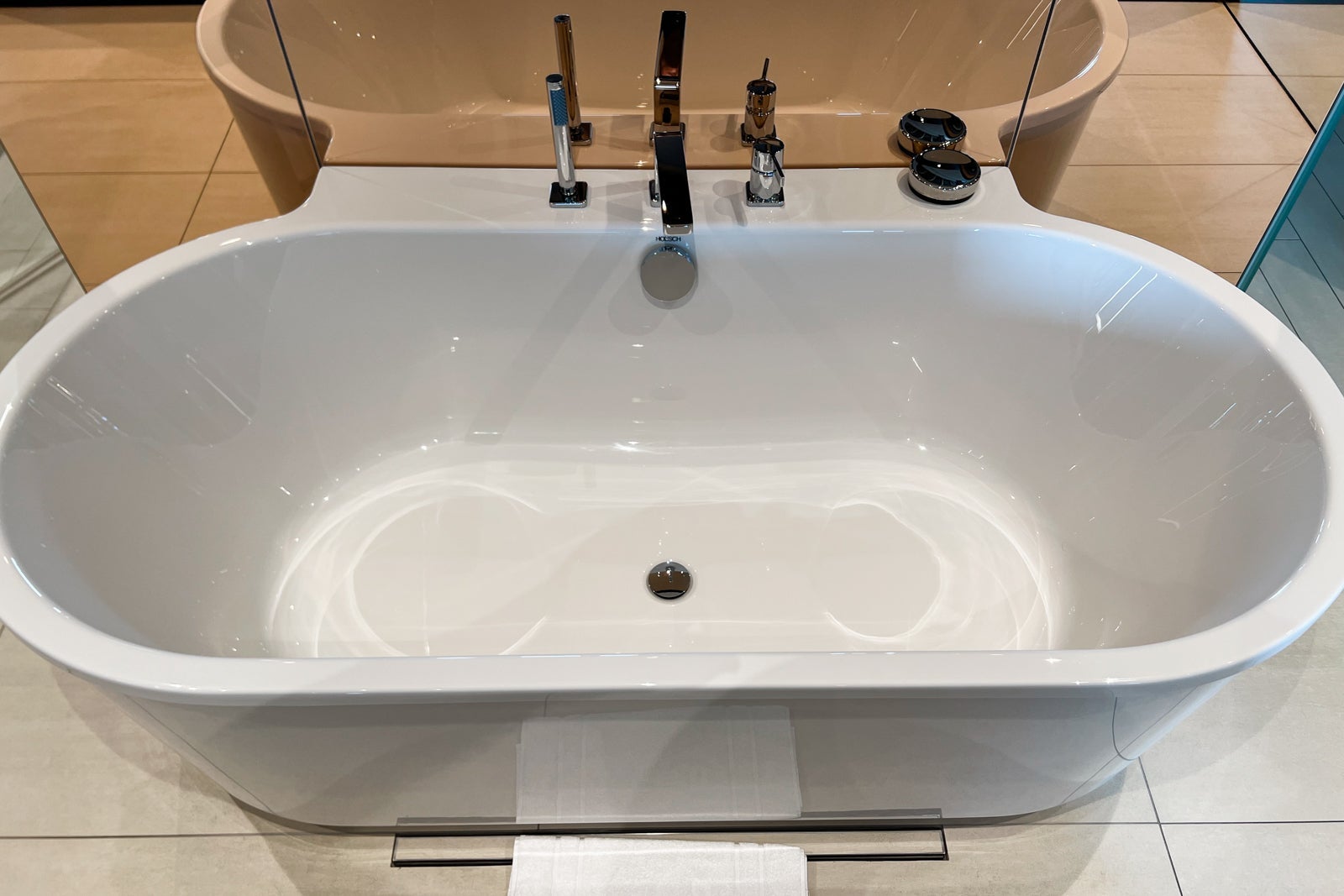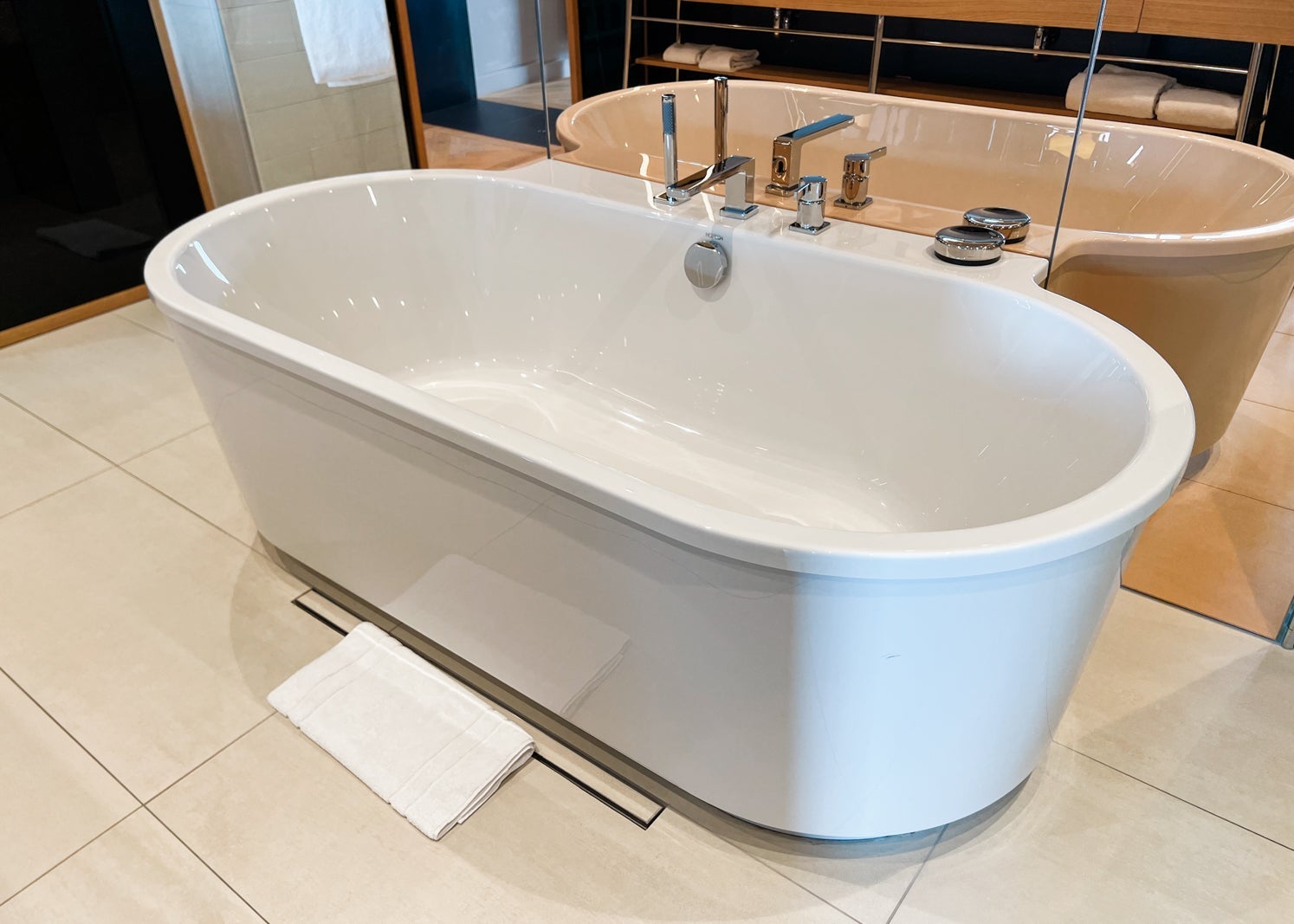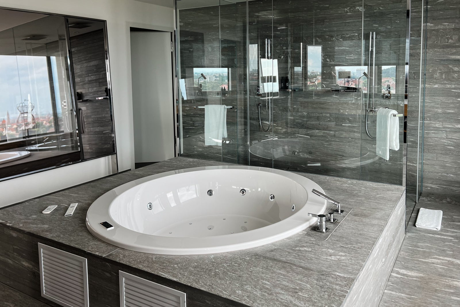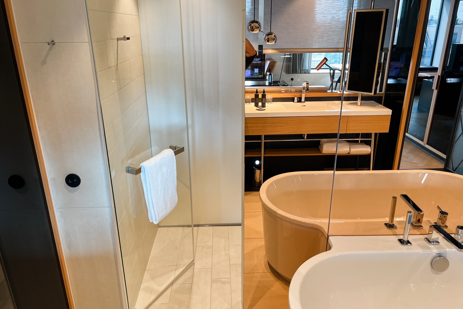 I didn't have time to soak, but the free-floating tub was the bathroom's centerpiece and looked inviting. While the bathroom was open to the room, it could be closed off with a sliding door.