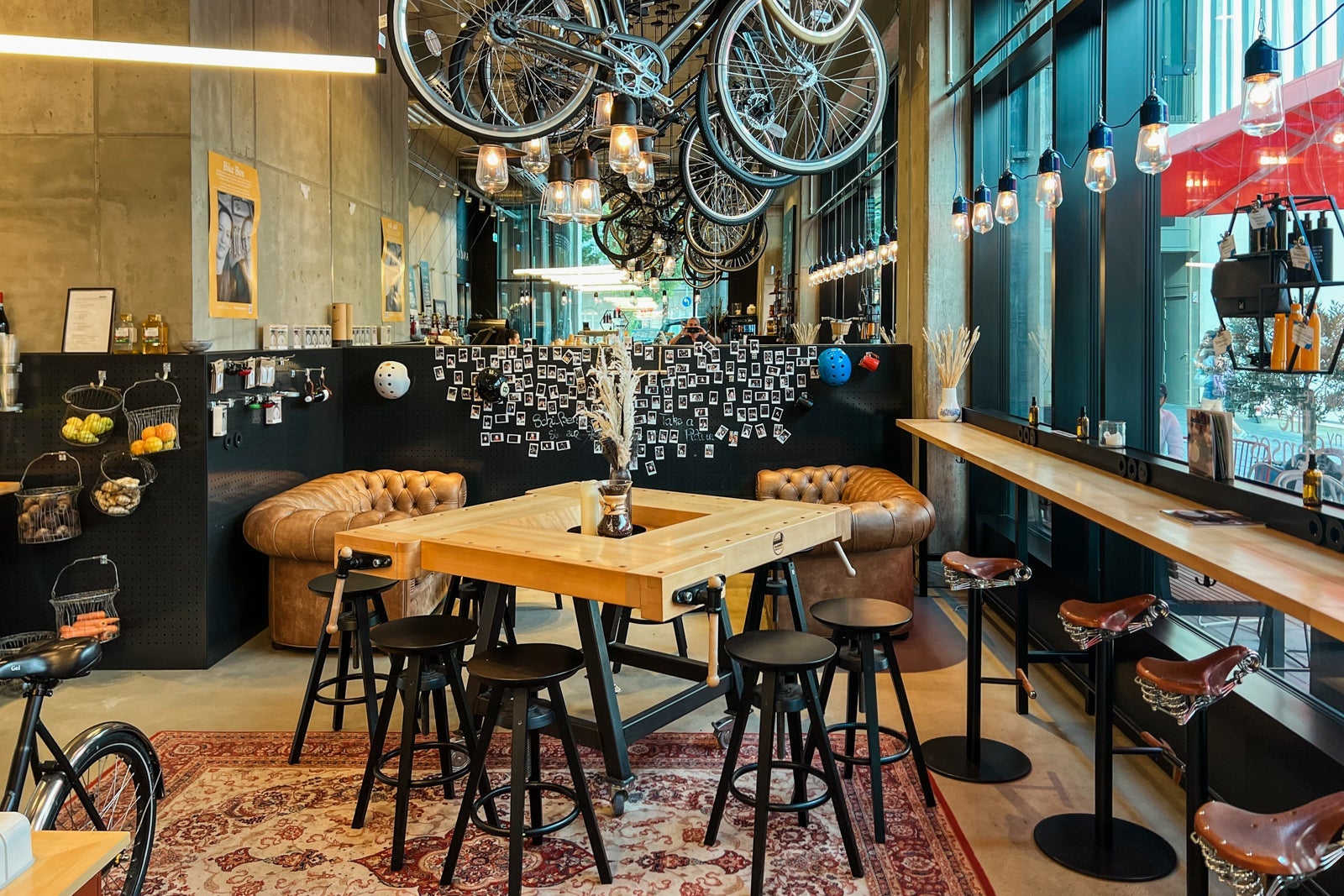 The aforementioned coffee bar, Bicicletta & Terrace, is in the lobby, with entrances to the street or to the hotel. The bicycle theme is carried over to the seating and terrace area. From 8 a.m. to 8 p.m. each day, they offer coffee, wine and beer, sandwiches and desserts. Smoothies start around $8, and an espresso costs $2.50.