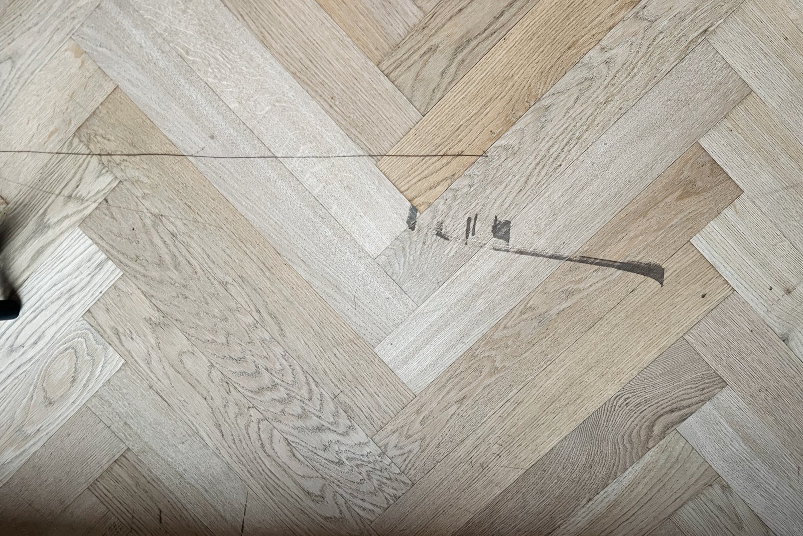 My room had beautiful blond herringbone patterned plank floors offset by an area rug under the bed.