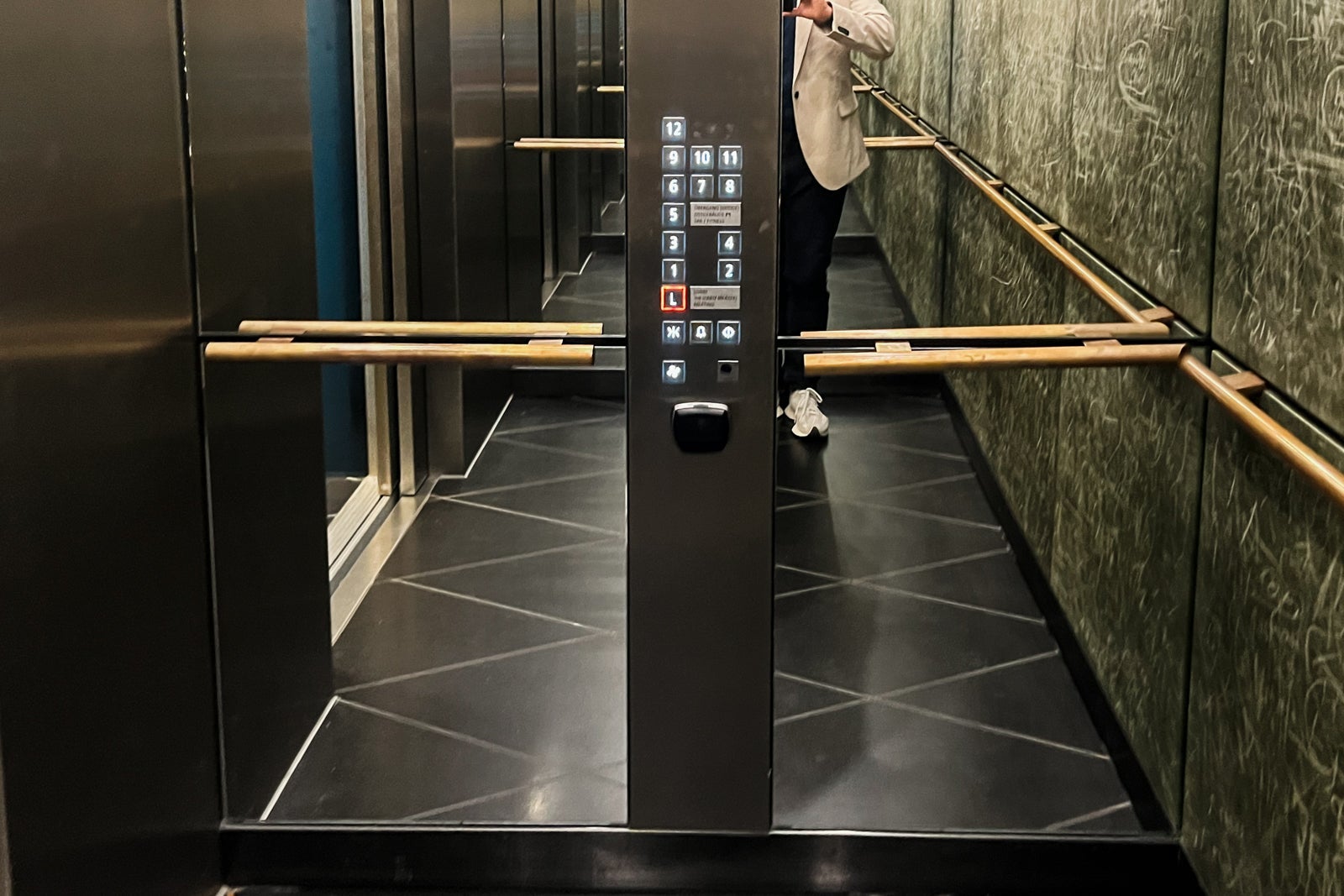 Elevators are wide enough to accommodate a full-sized wheelchair, with grab bars and buttons at waist level.
