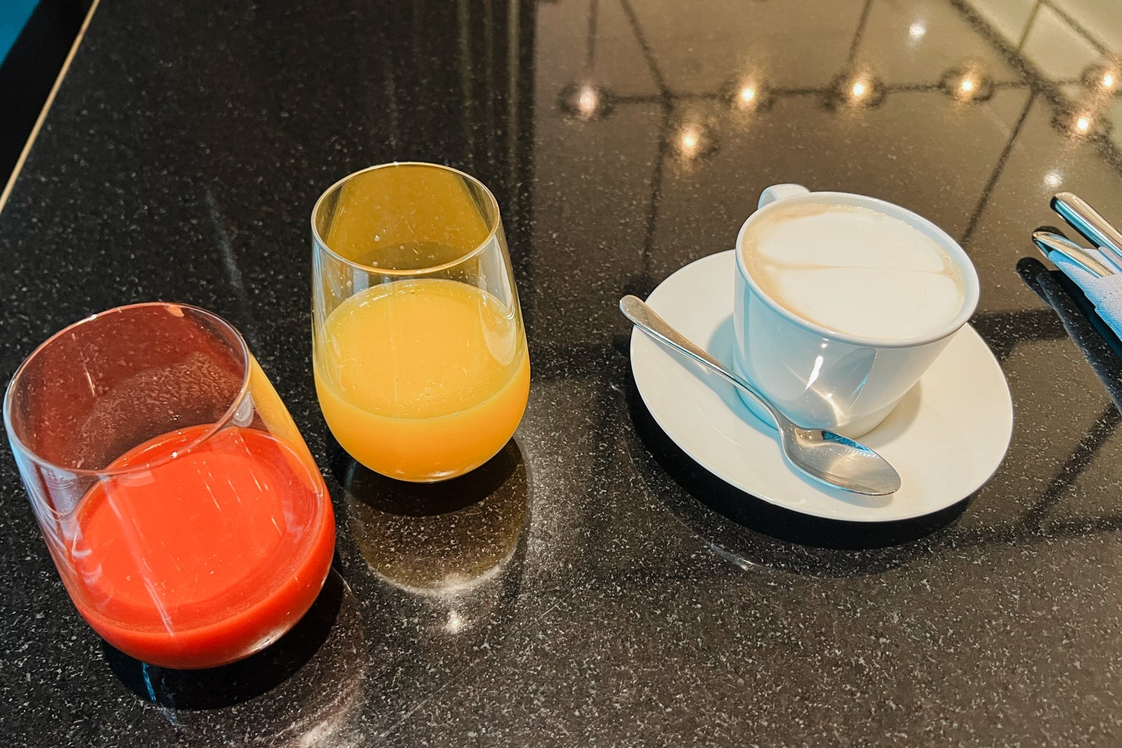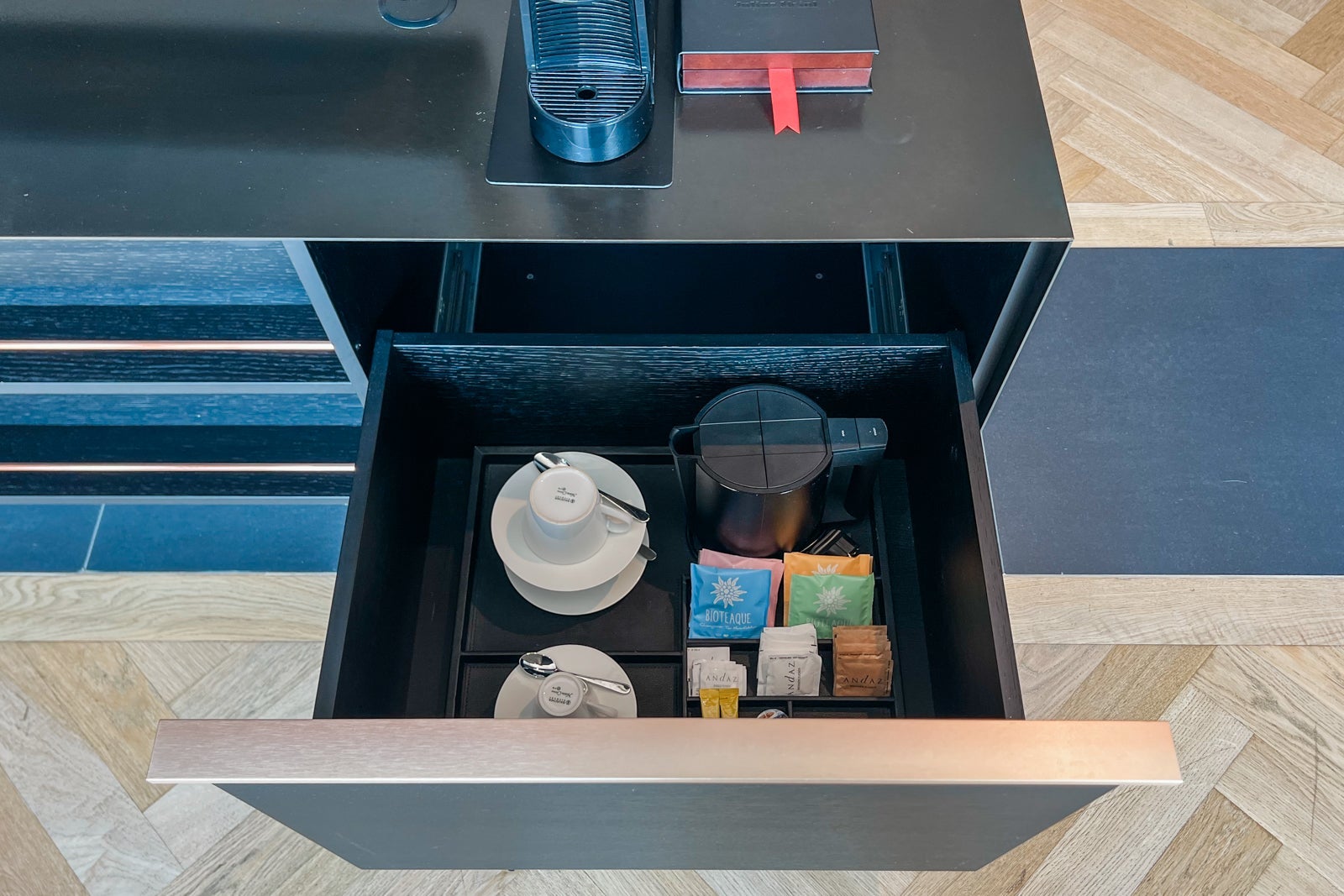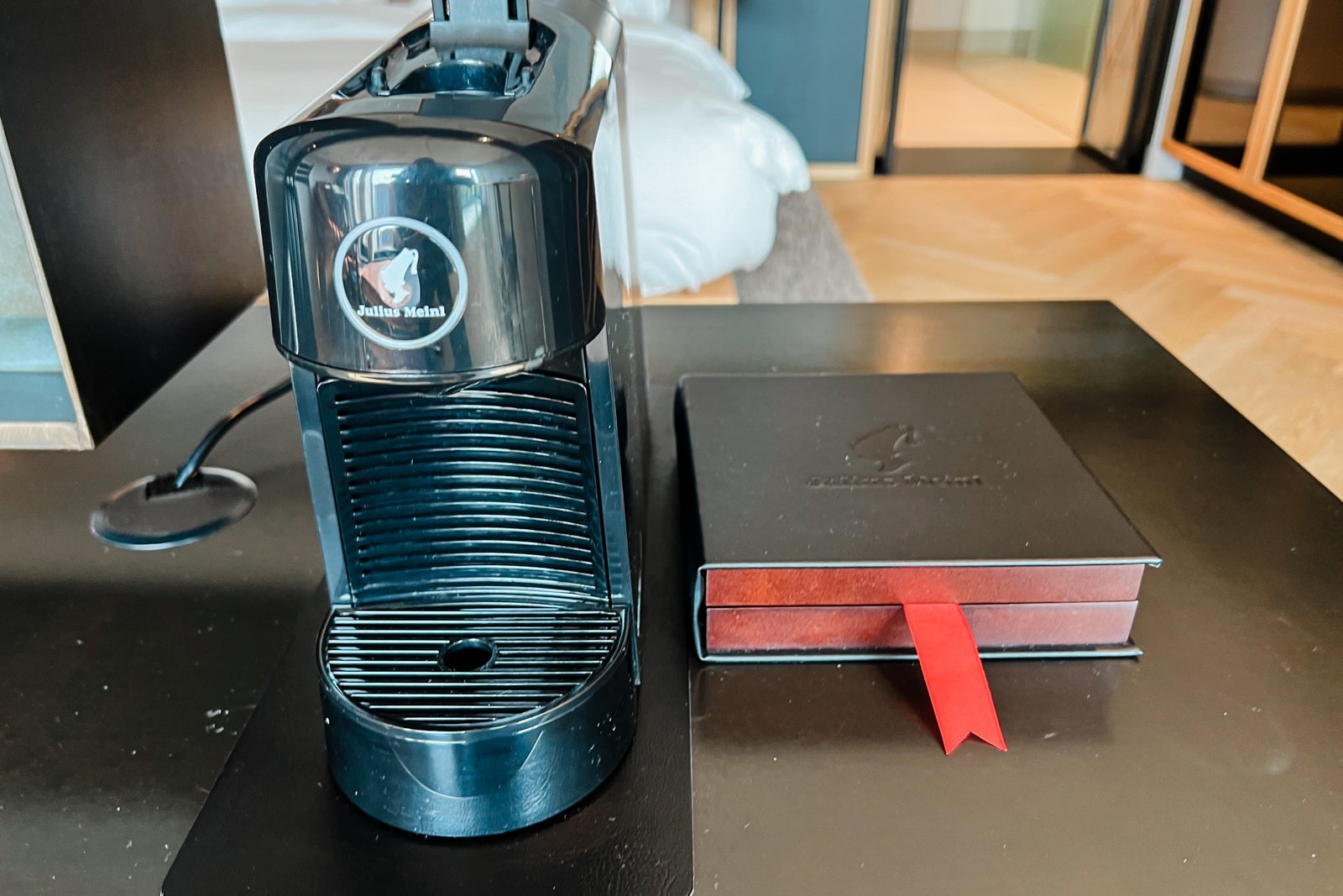 The coffee and tea bar was at the other end of the console, with all the ingredients for tea or coffee. I asked for more pods for the coffee machine a few times, and the refills were brought quickly. The coffee machine and pods were by the premium coffee brand Julius Meinl from Vienna. They were good, though I still prefer Nespresso.