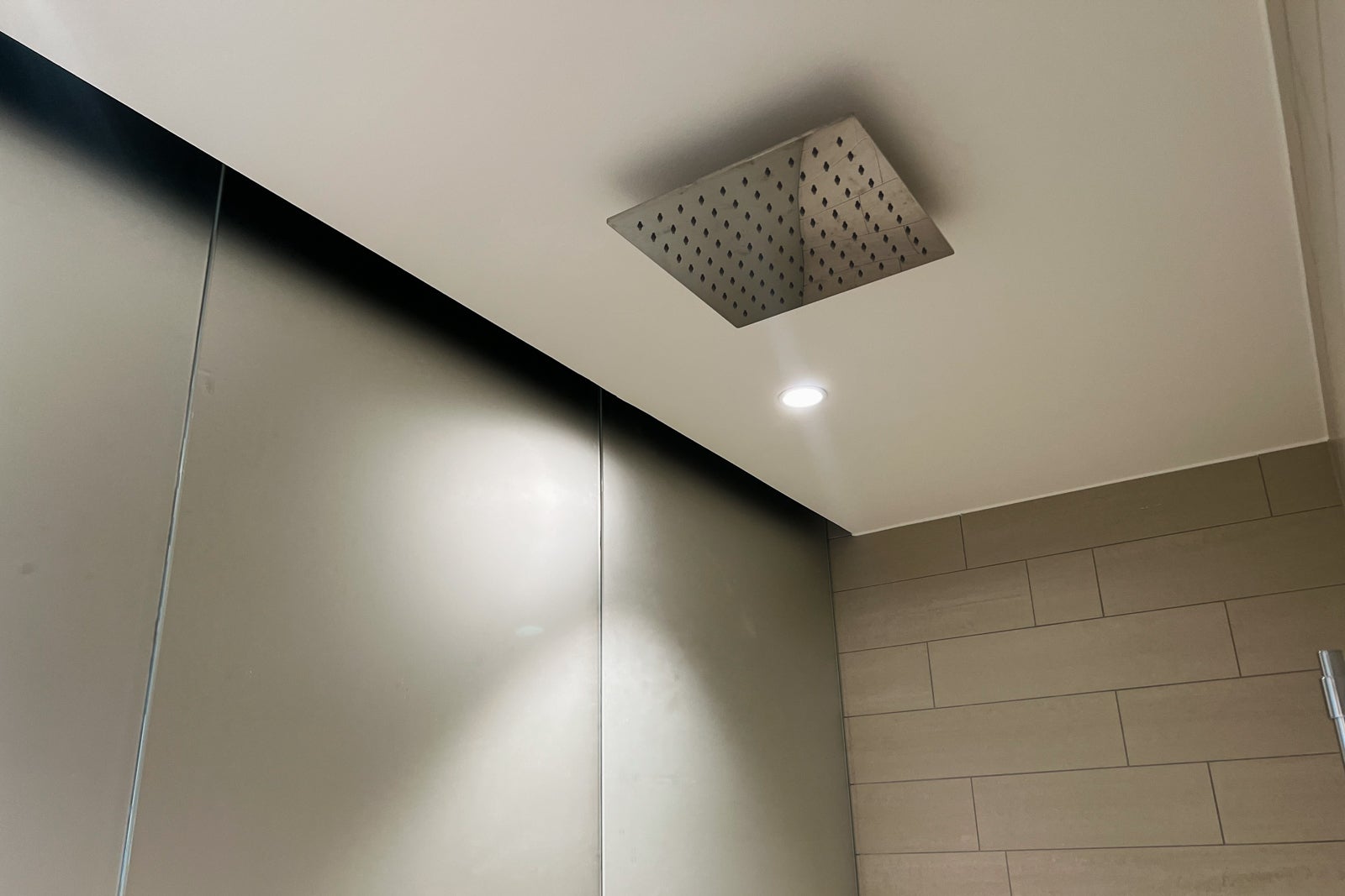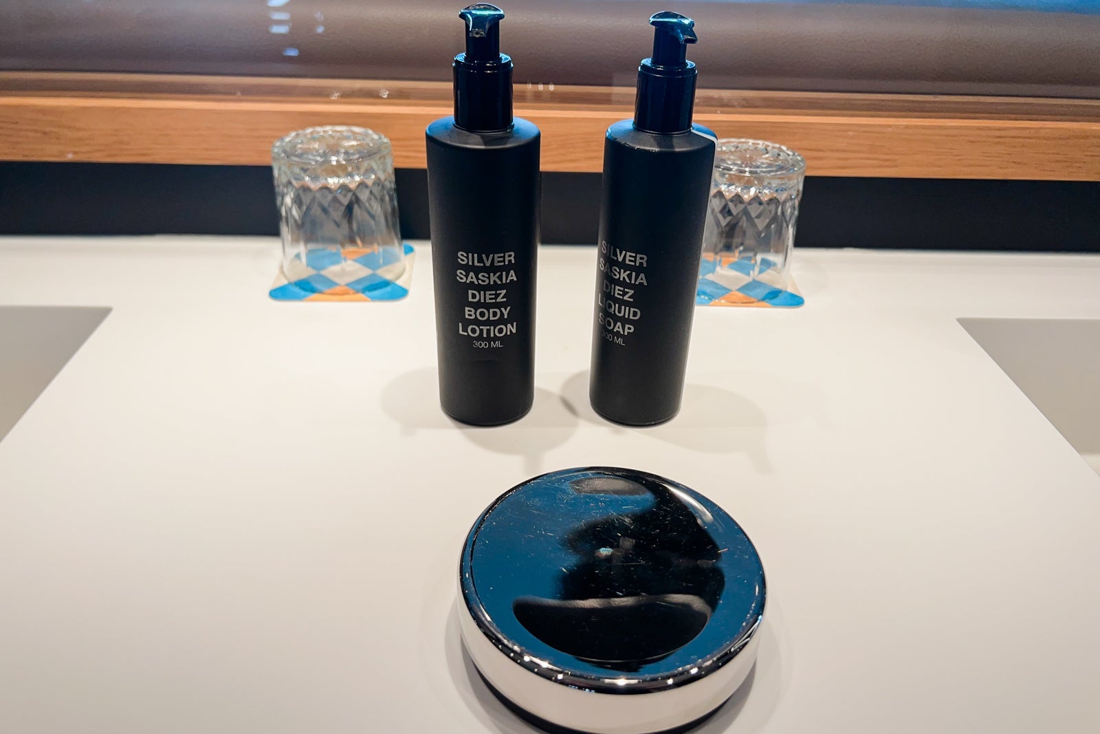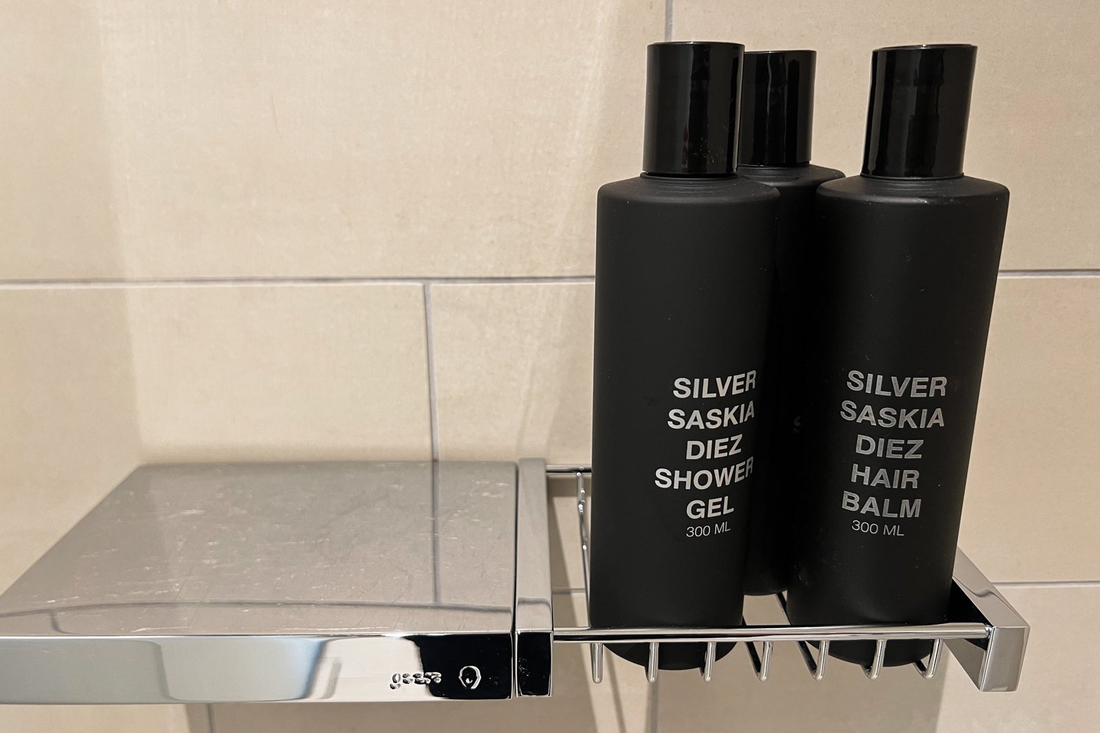 As I entered the room, the bathroom was immediately on the right. It was very roomy, with a water closet on one side with a simple toilet. On the other side of the bathroom was a large shower with a wand-type shower head and a rain-style head in the ceiling. Large loose toiletries by Silver Saskia Diez were on a shelf in the shower and near the sink.