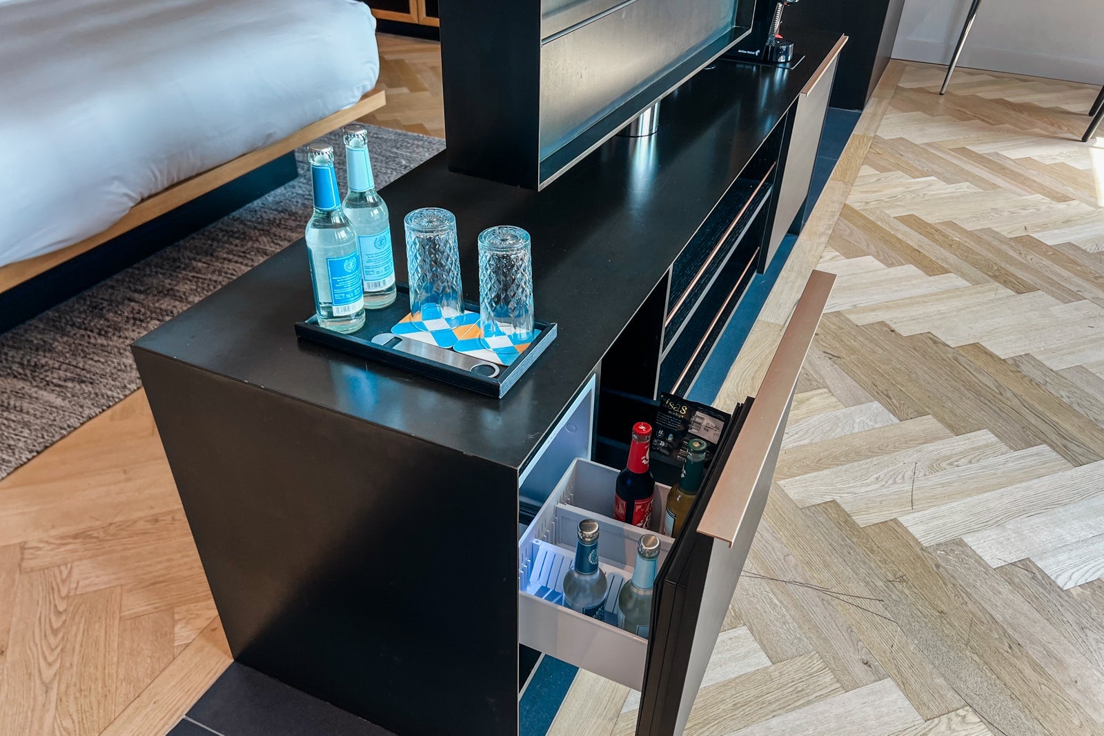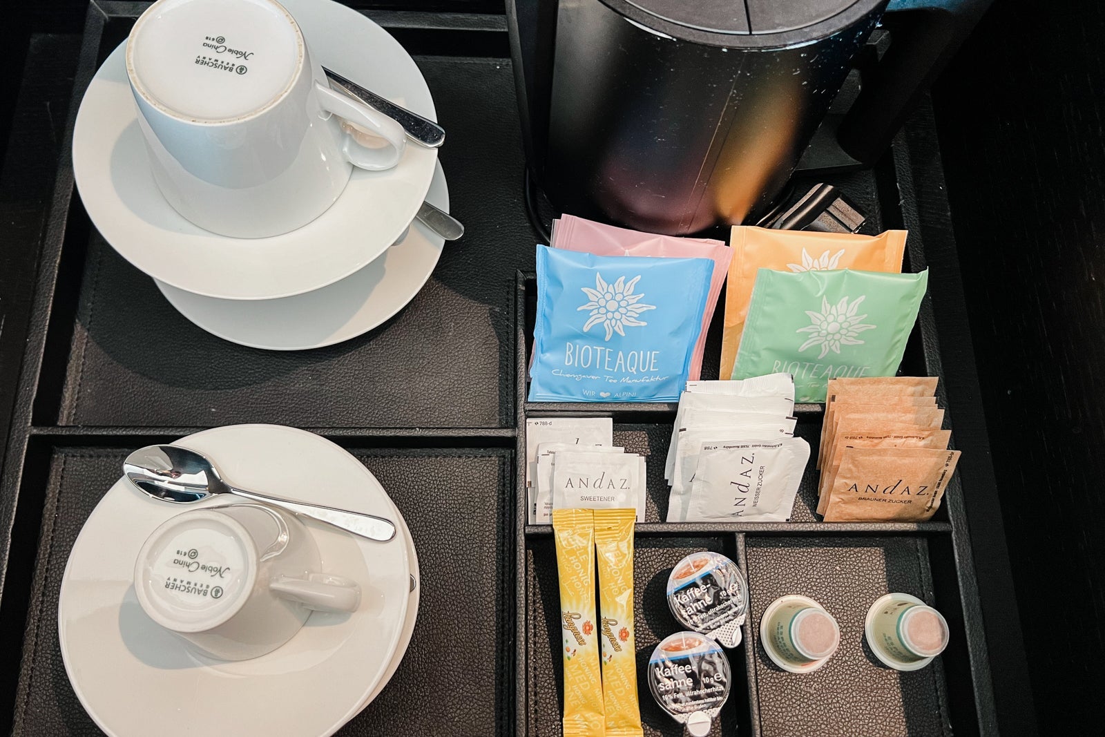 The free minibar items consisted of two still and two bubbly versions of the German-brand mineral water Otto Pachmayr, two varieties of Eizbach sodas and Lisas kettle chips, also a German brand made with organic potatoes. It was, frankly, a bit sad. In my humble opinion, Andaz should either bulk up these offerings or ditch the perk altogether.
