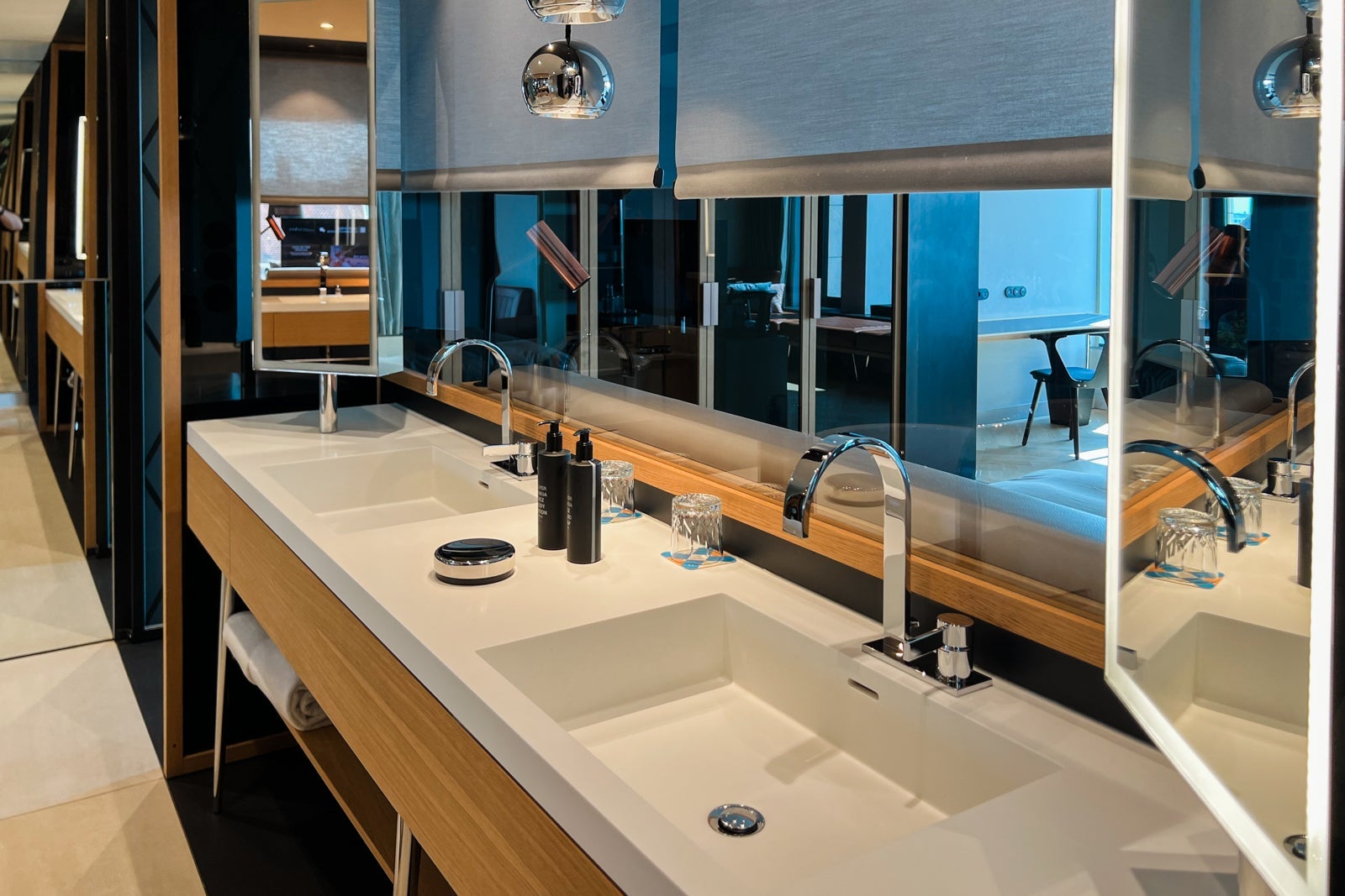 There were also lighted mirrors on either side of the long sink bar. The crystal glasses were a nice touch.