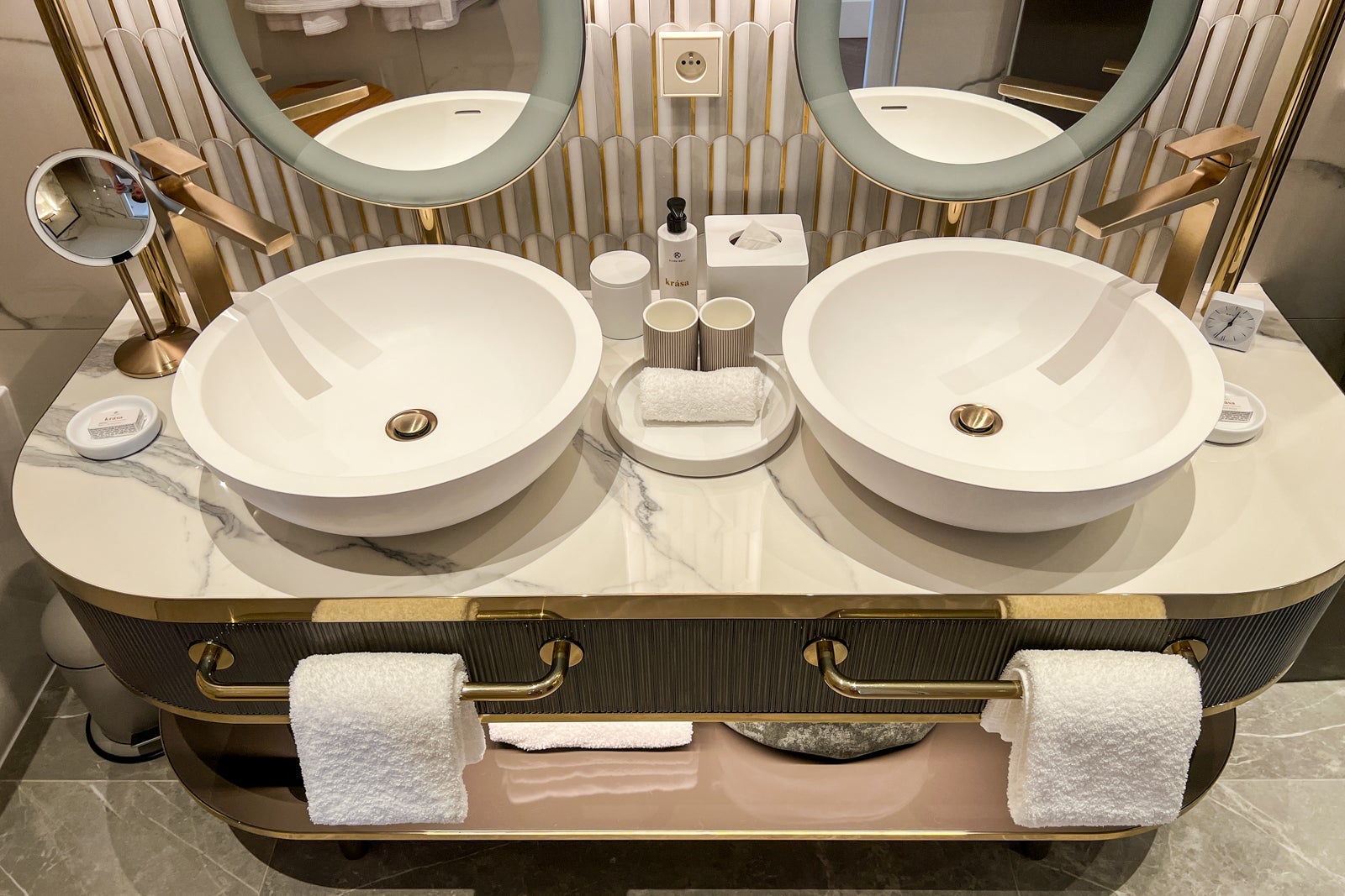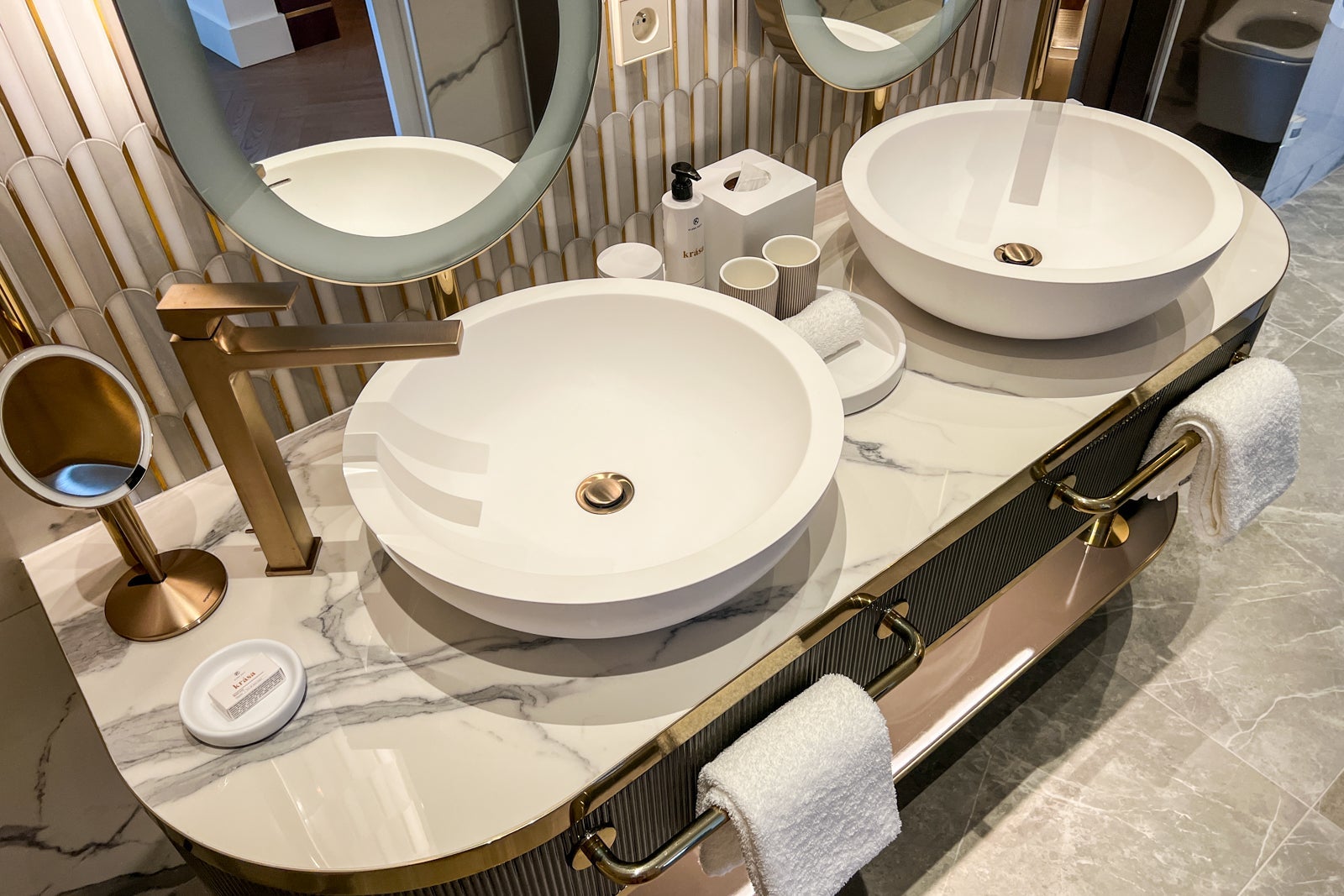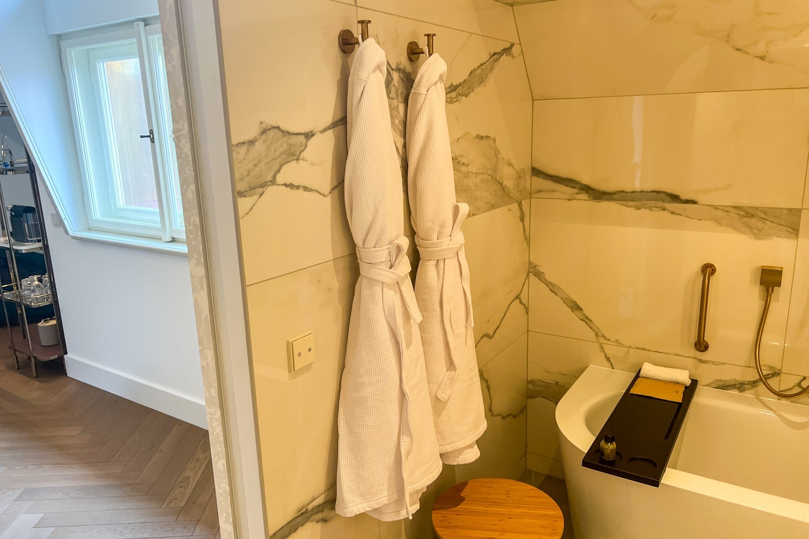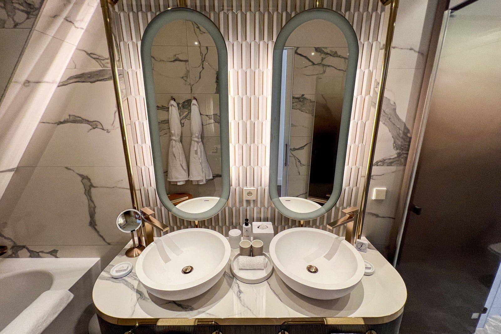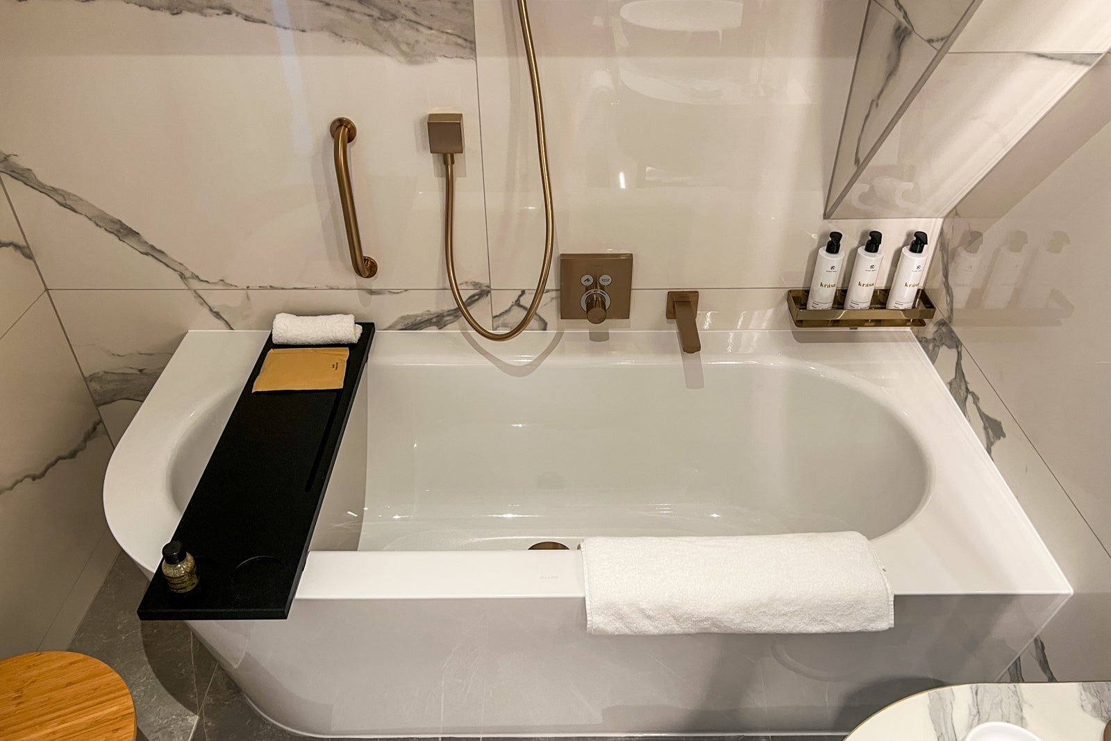 The bathroom was a treat, too. There was a separate shower and bathtub, both outfitted with premium Klara Rott toiletries. The vanity was large and had two sinks. Towels were soft and replenished every day by housekeeping. The design feet sophisticated but unstuffy thanks to high-end materials like deep-veined marble tiling and brushed brass fixtures as well as eye-catching oval mirrors above the sinks.