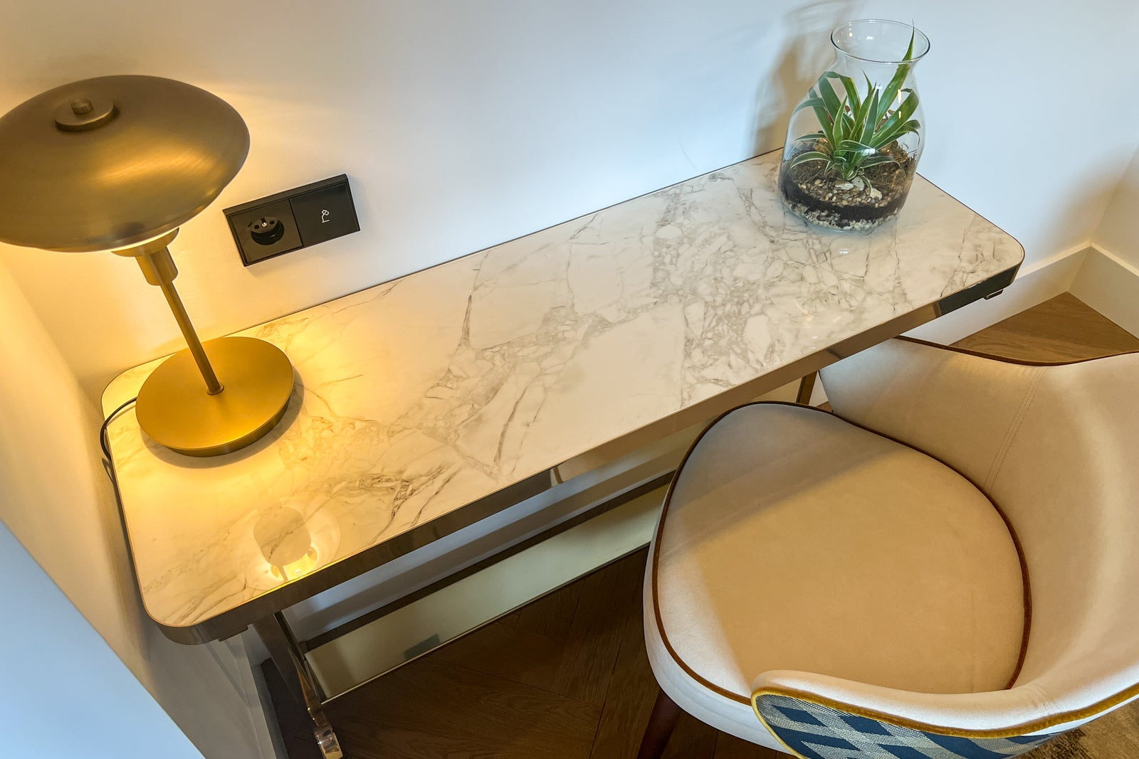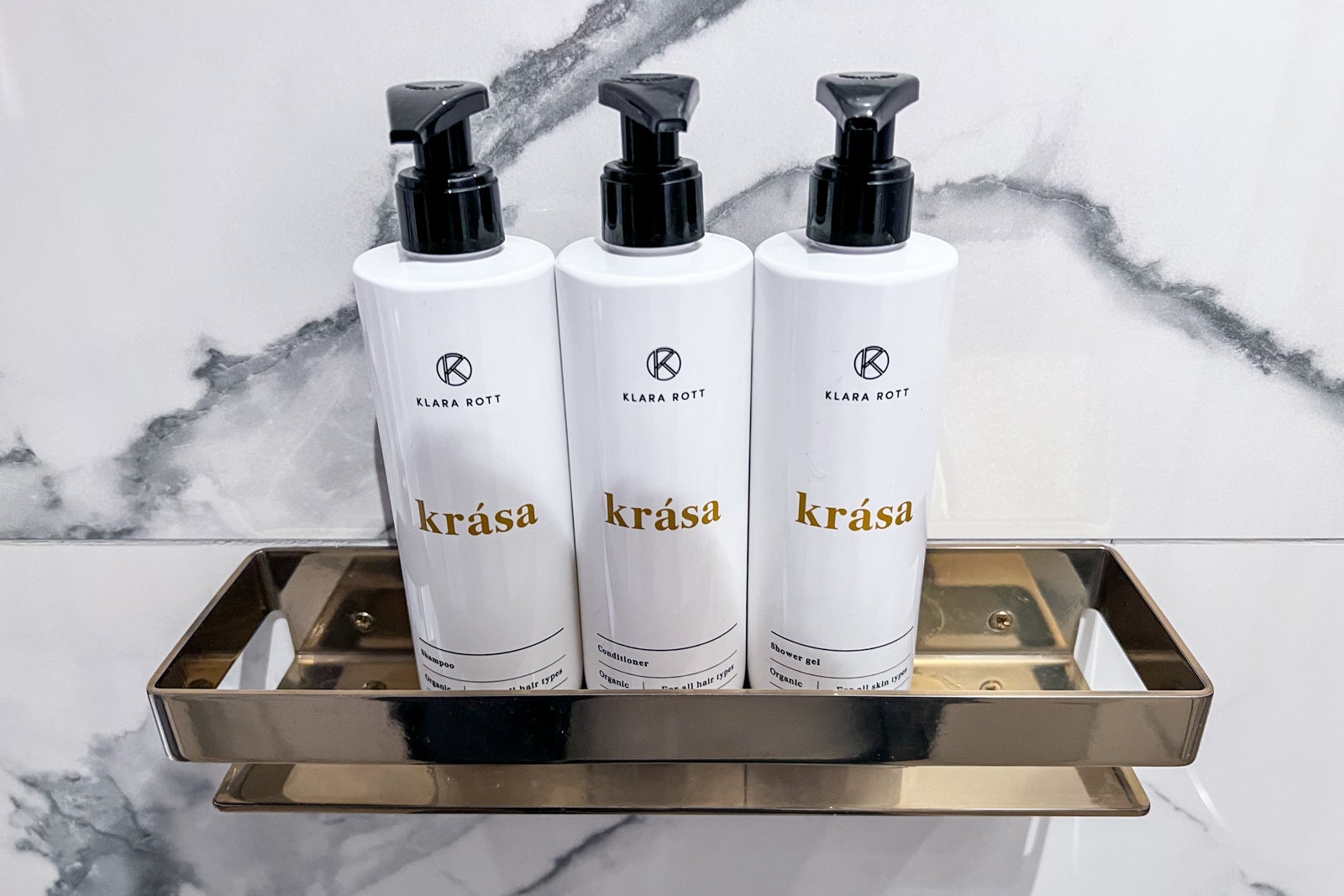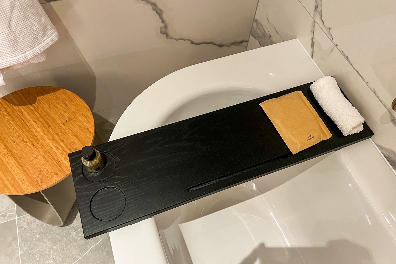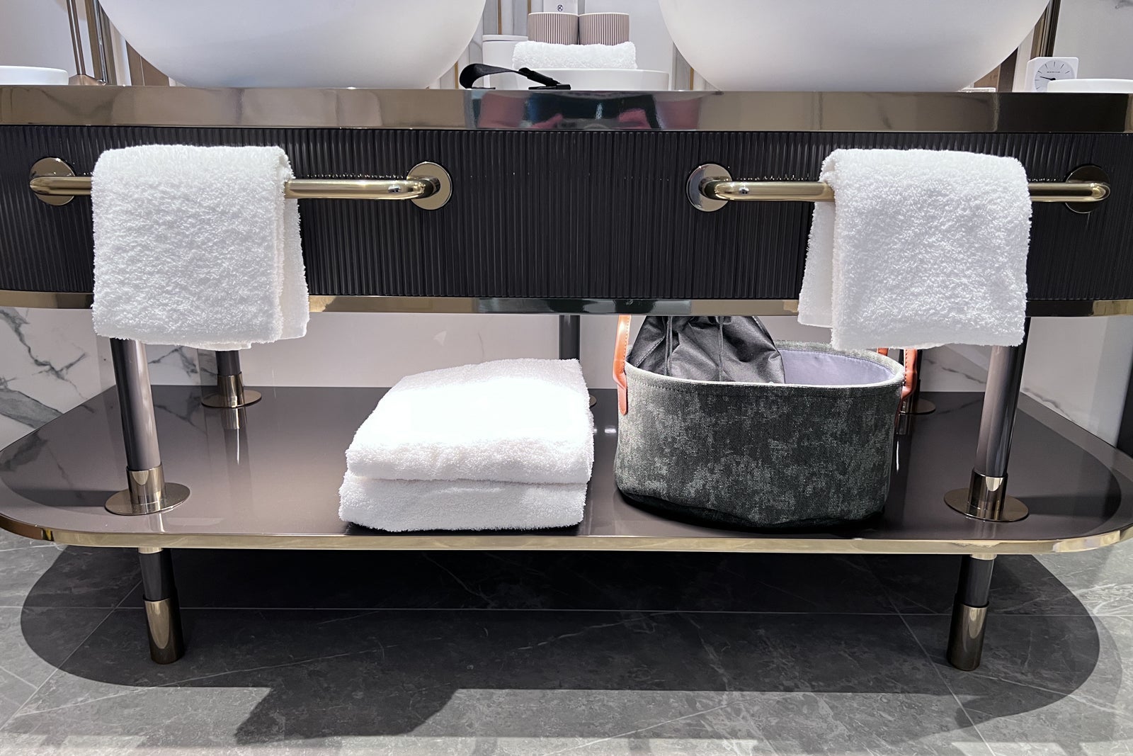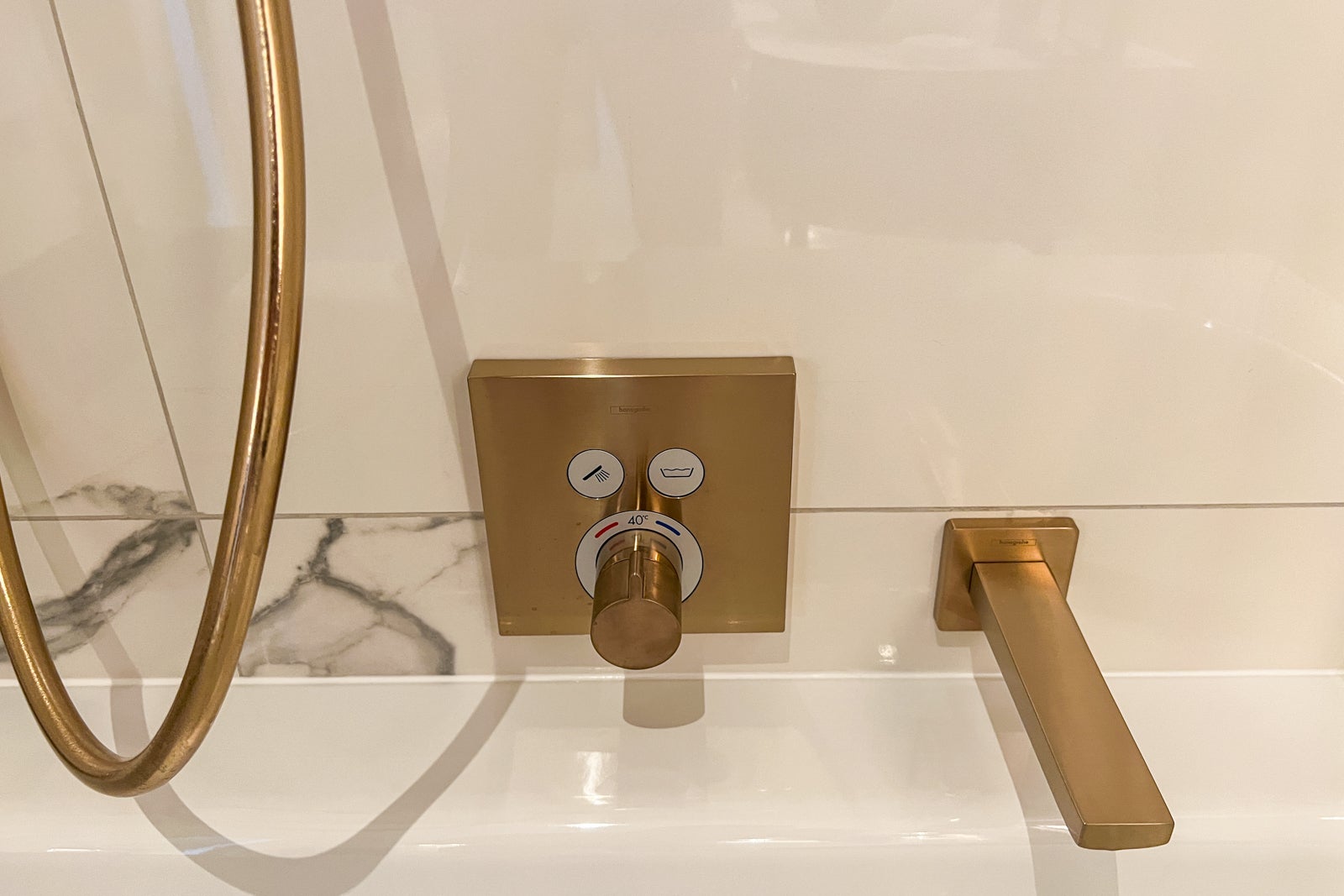 The bathroom was a treat, too. There was a separate shower and bathtub, both outfitted with premium Klara Rott toiletries. The vanity was large and had two sinks. Towels were soft and replenished every day by housekeeping. The design feet sophisticated but unstuffy thanks to high-end materials like deep-veined marble tiling and brushed brass fixtures as well as eye-catching oval mirrors above the sinks.