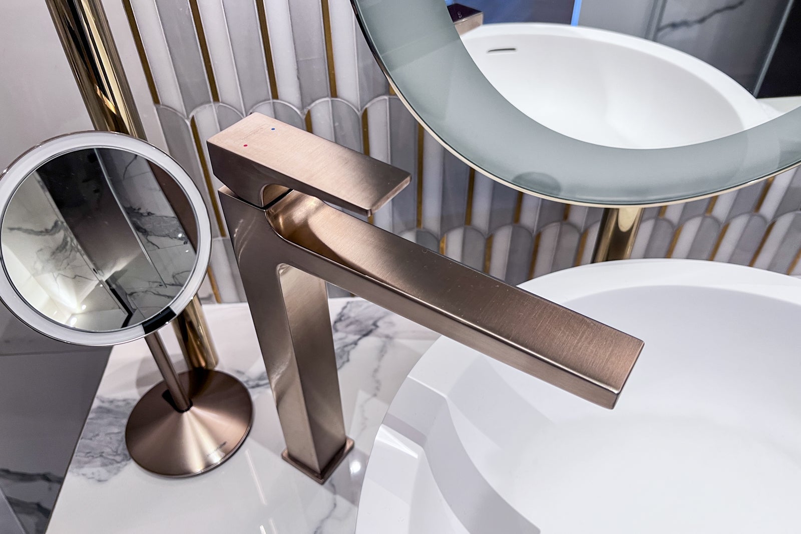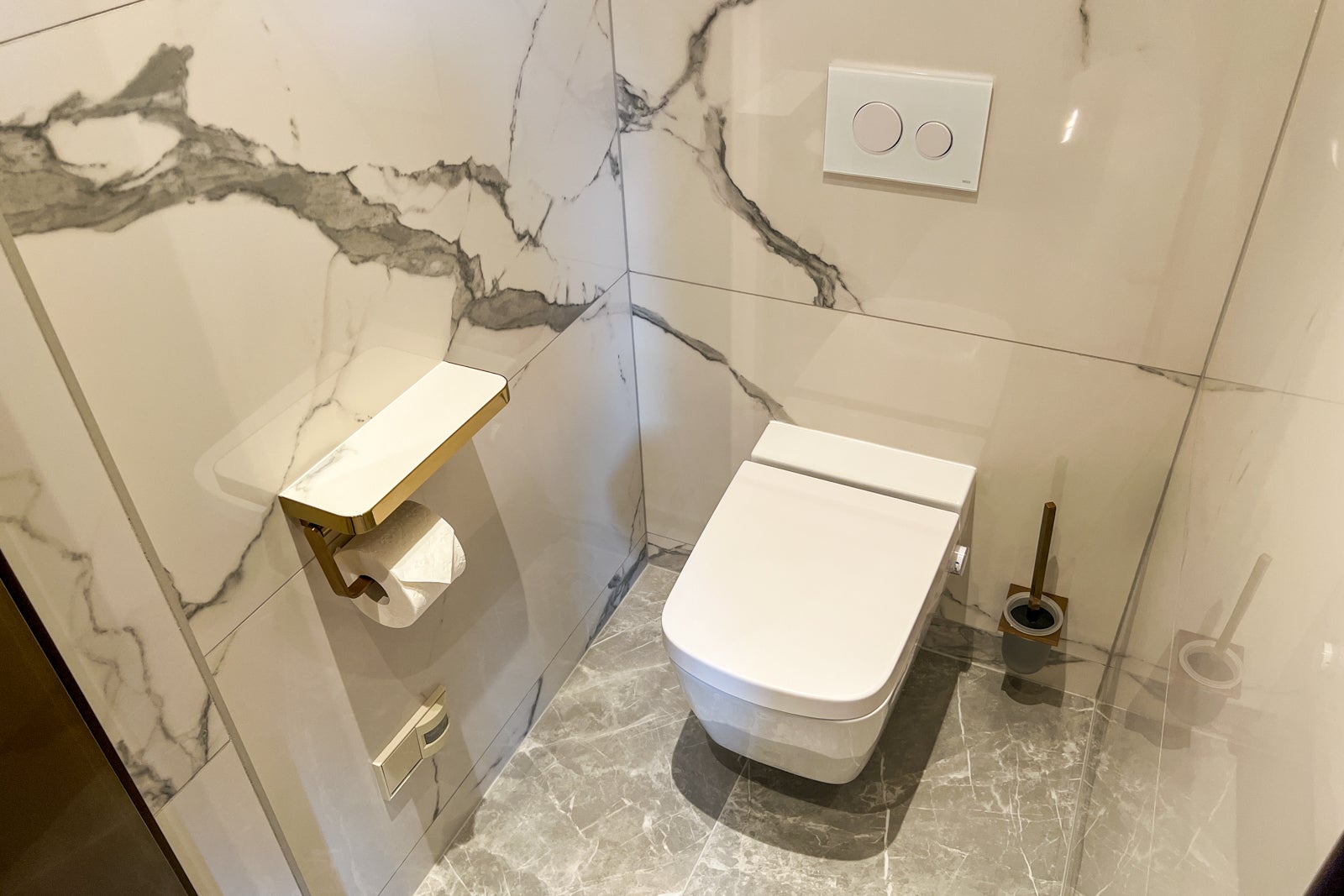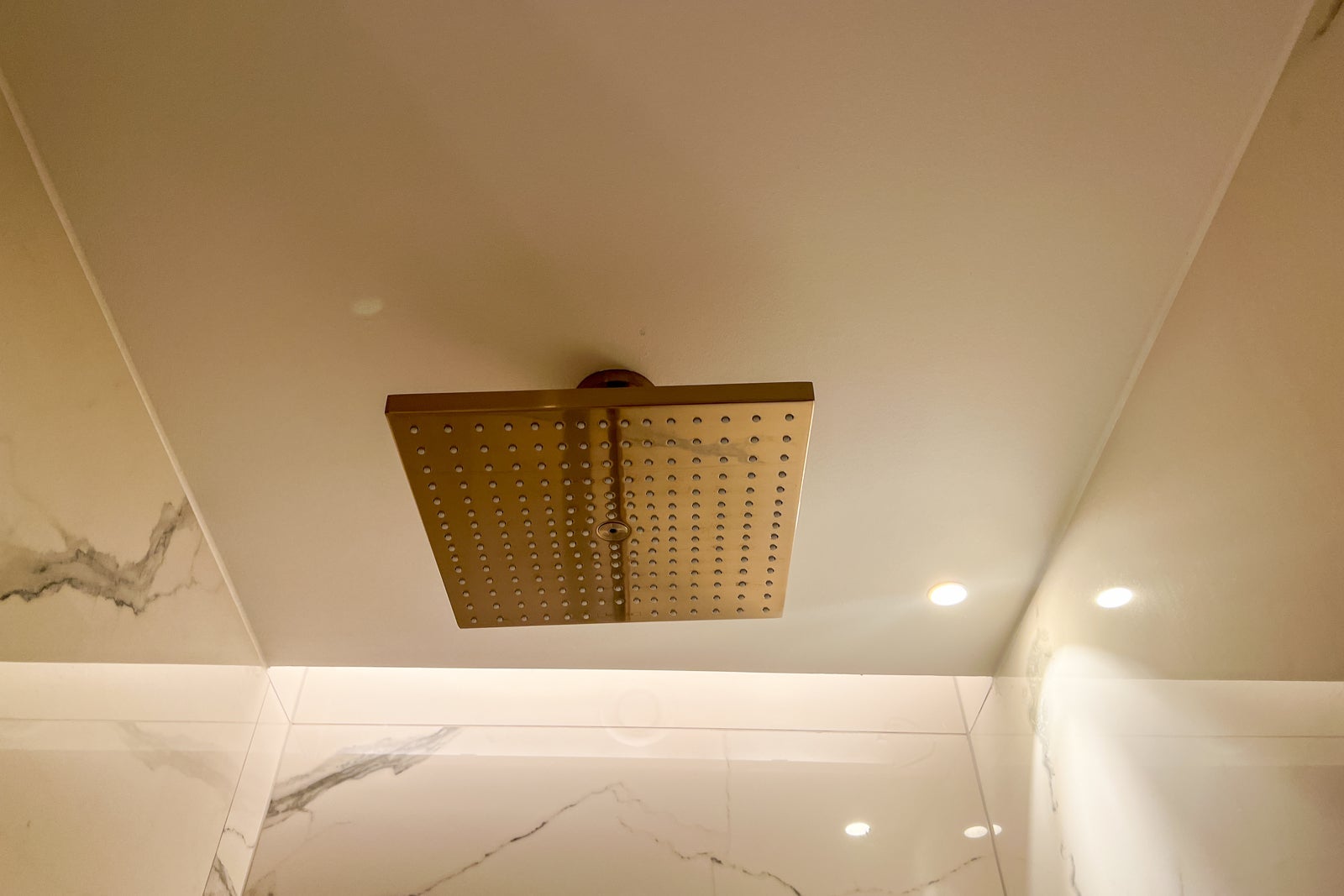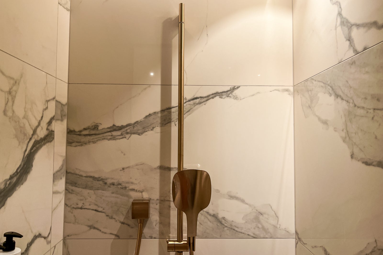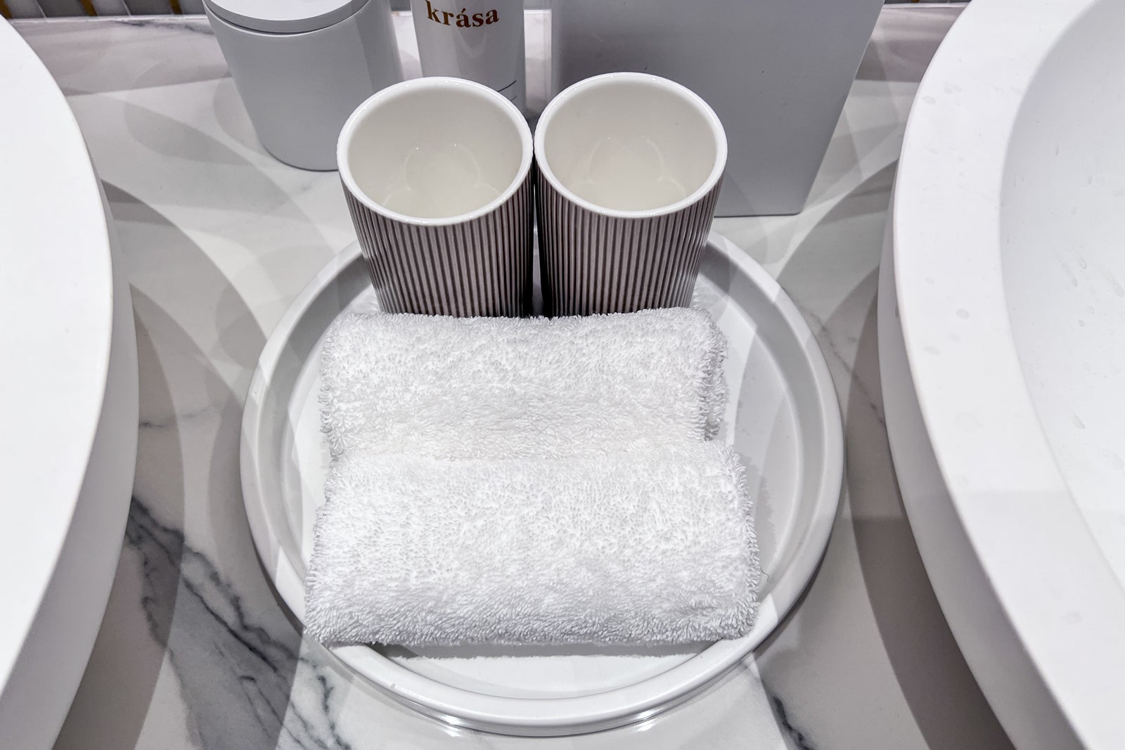 The bathroom was a treat, too. There was a separate shower and bathtub, both outfitted with premium Klara Rott toiletries. The vanity was large and had two sinks. Towels were soft and replenished every day by housekeeping. The design feet sophisticated but unstuffy thanks to high-end materials like deep-veined marble tiling and brushed brass fixtures as well as eye-catching oval mirrors above the sinks.