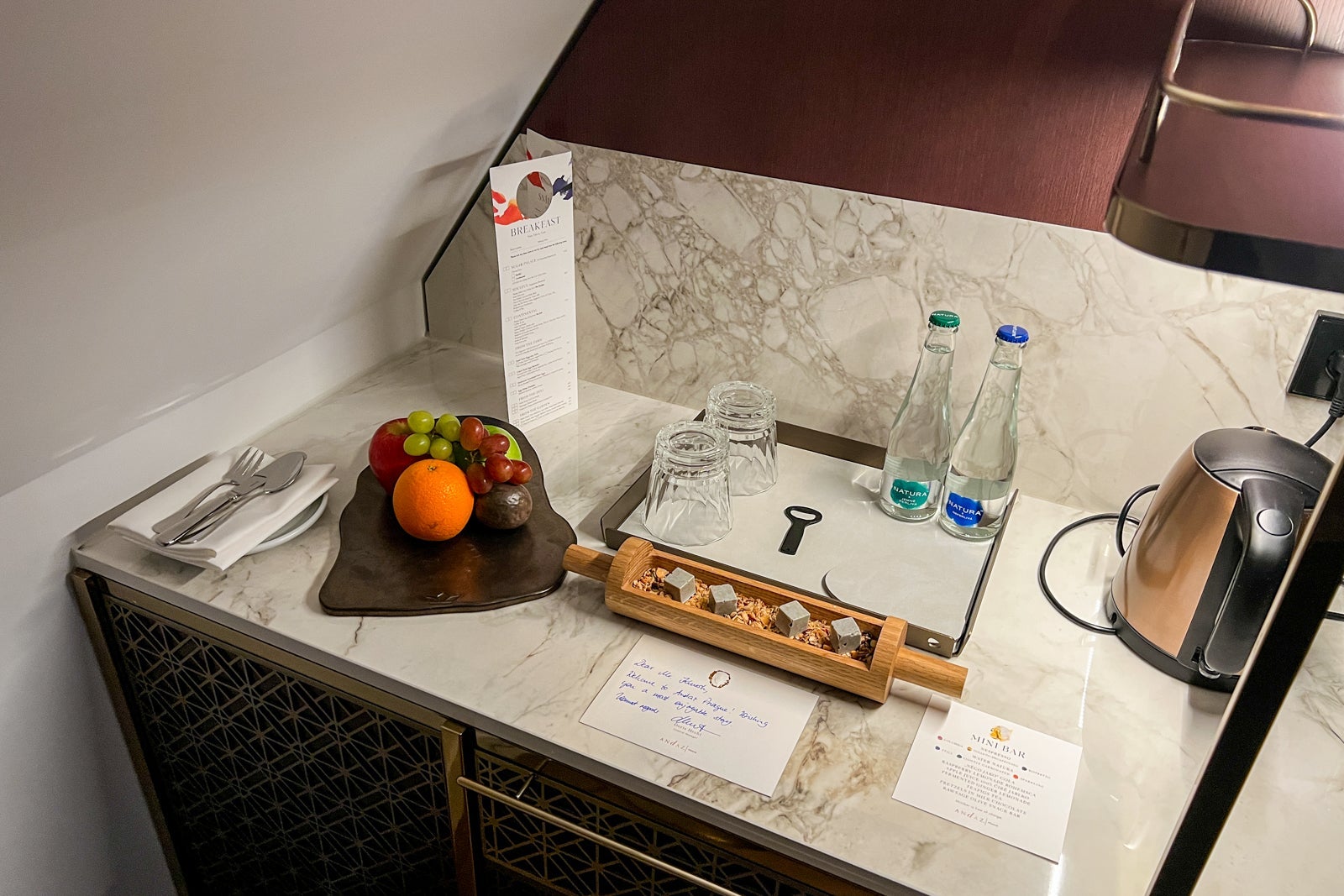 The minibar is stocked with local snacks and soft drinks, all free of charge. I was also left fresh fruit and candies with a note thanking me for my business and loyalty to Hyatt.