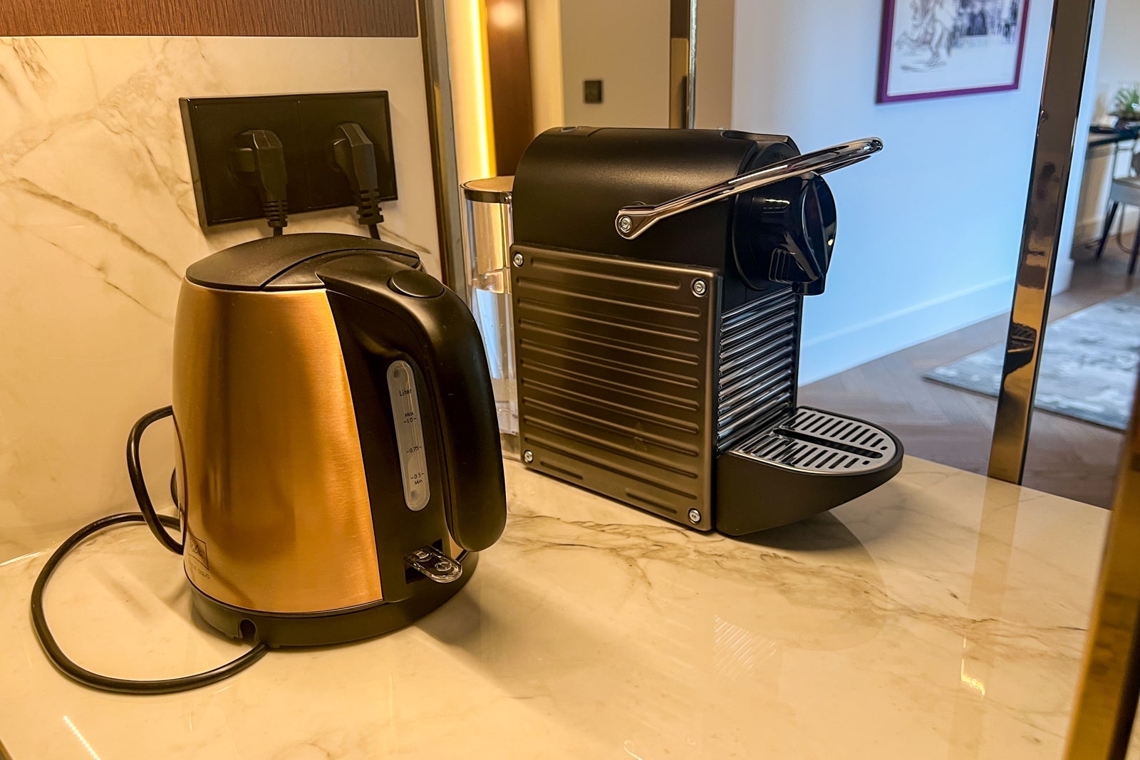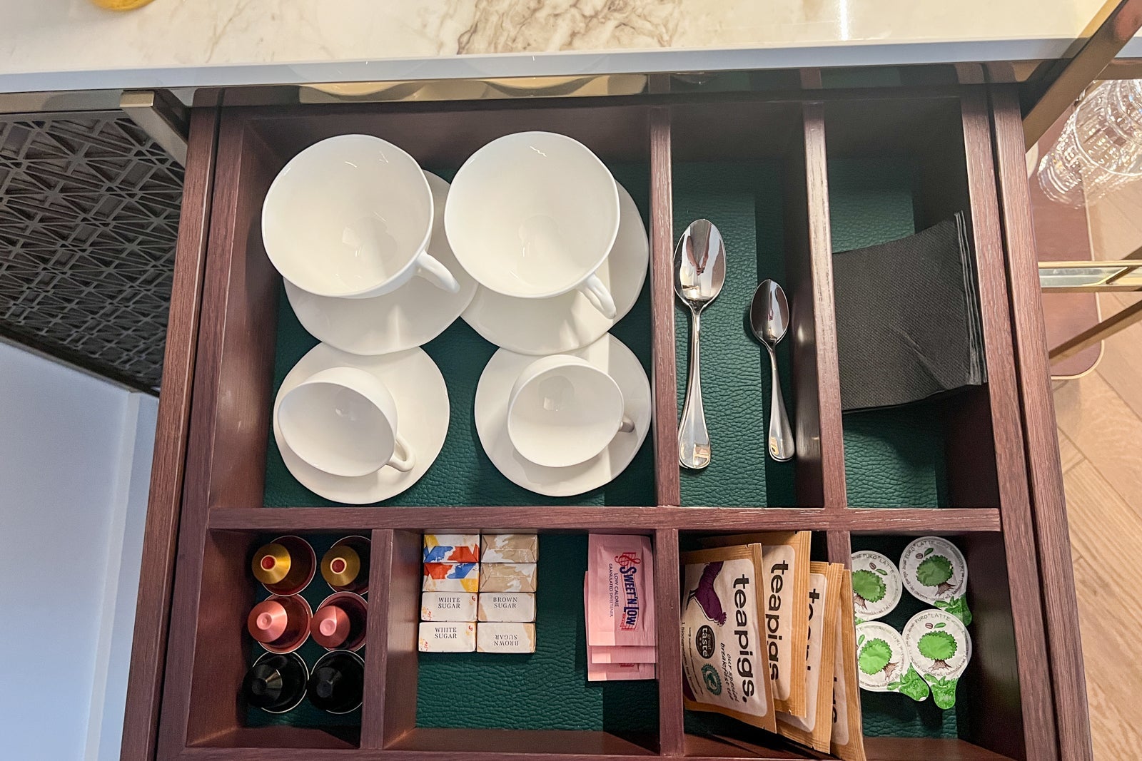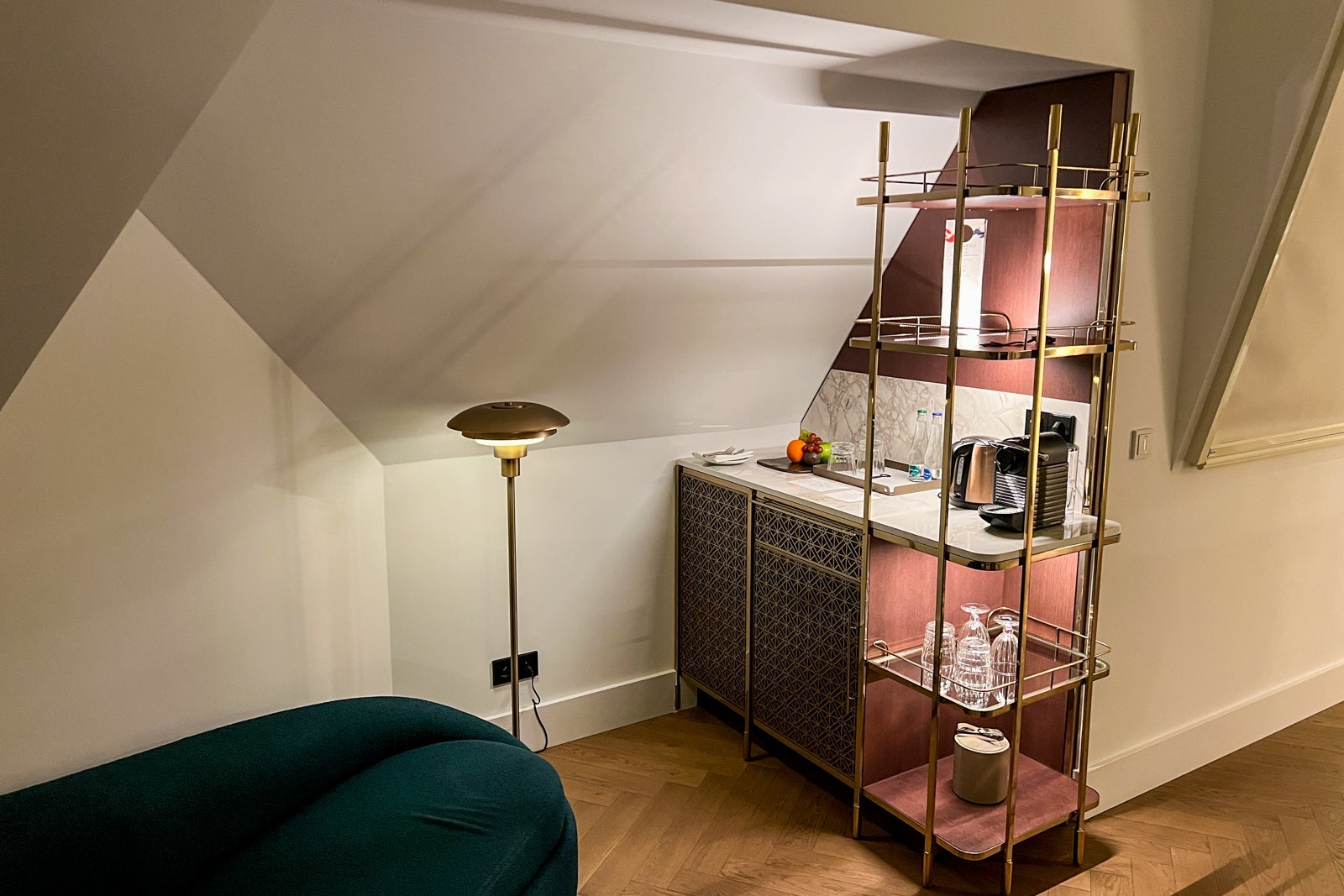 Walking into the main part of the room, you'll see a seating area with a large, curved couch, a chair, a glass-topped coffee table with a decorative tic-tac-toe set and a console with a Nespresso machine and the minibar. I thought all of the furniture was well-proportioned for the room, and appreciated the dark tones and matte brass finishes.