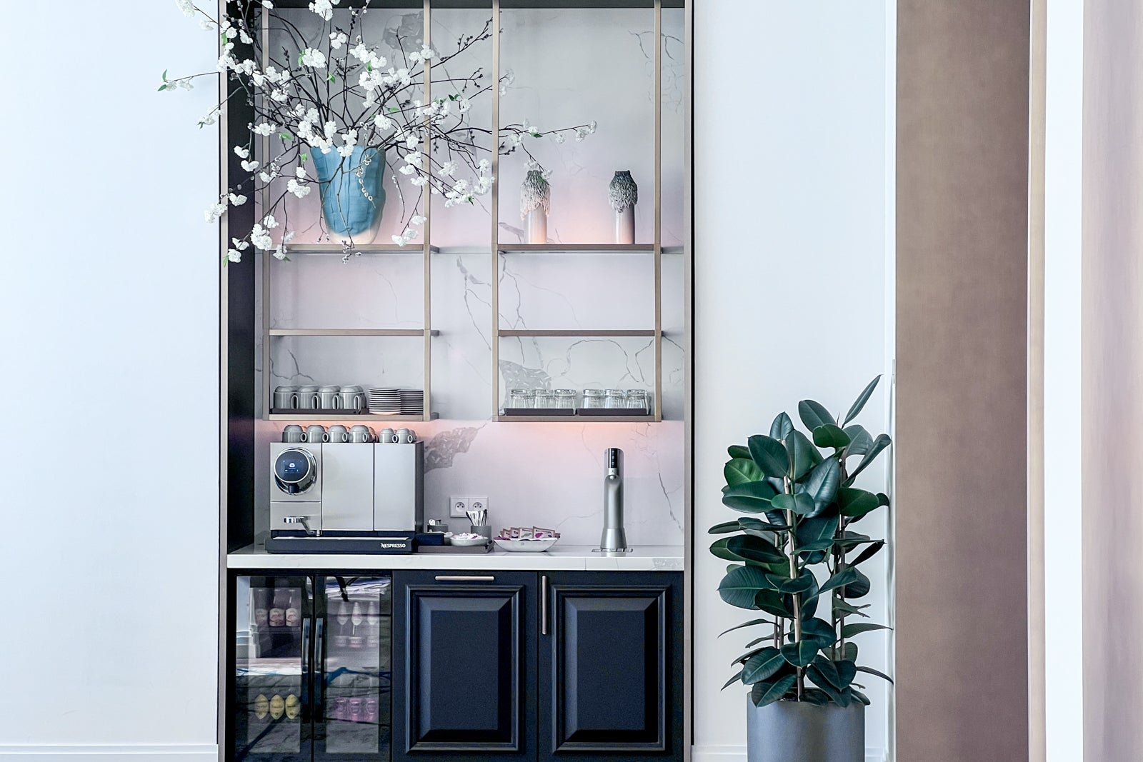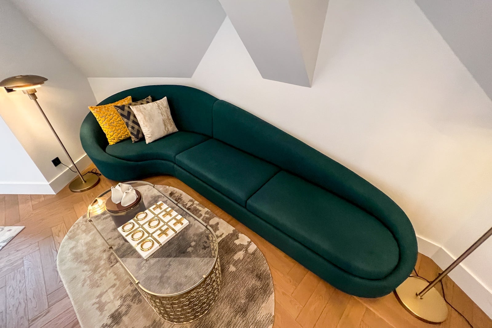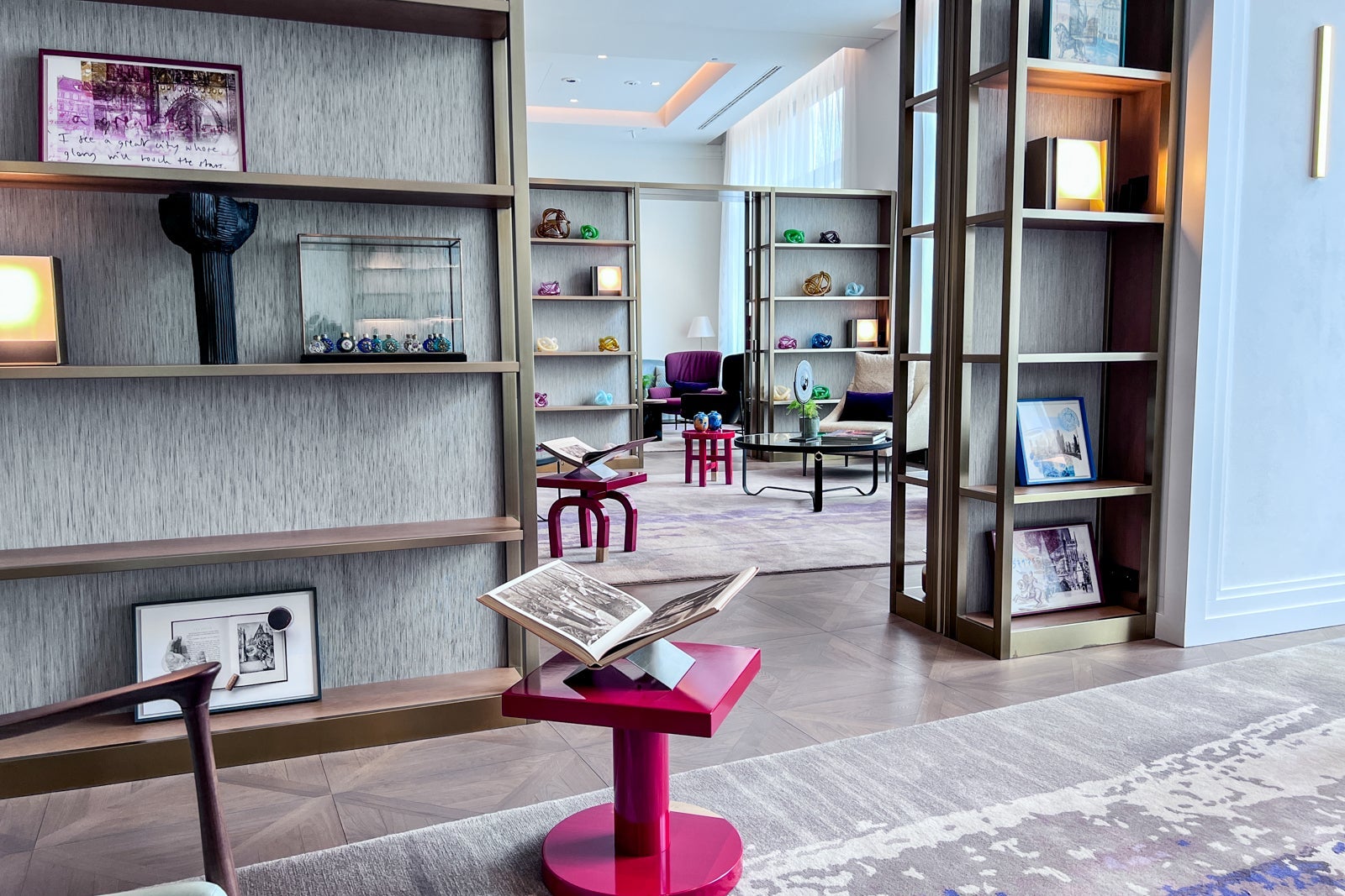 Walking into the main part of the room, you'll see a seating area with a large, curved couch, a chair, a glass-topped coffee table with a decorative tic-tac-toe set and a console with a Nespresso machine and the minibar. I thought all of the furniture was well-proportioned for the room, and appreciated the dark tones and matte brass finishes.