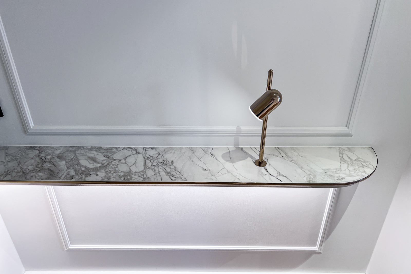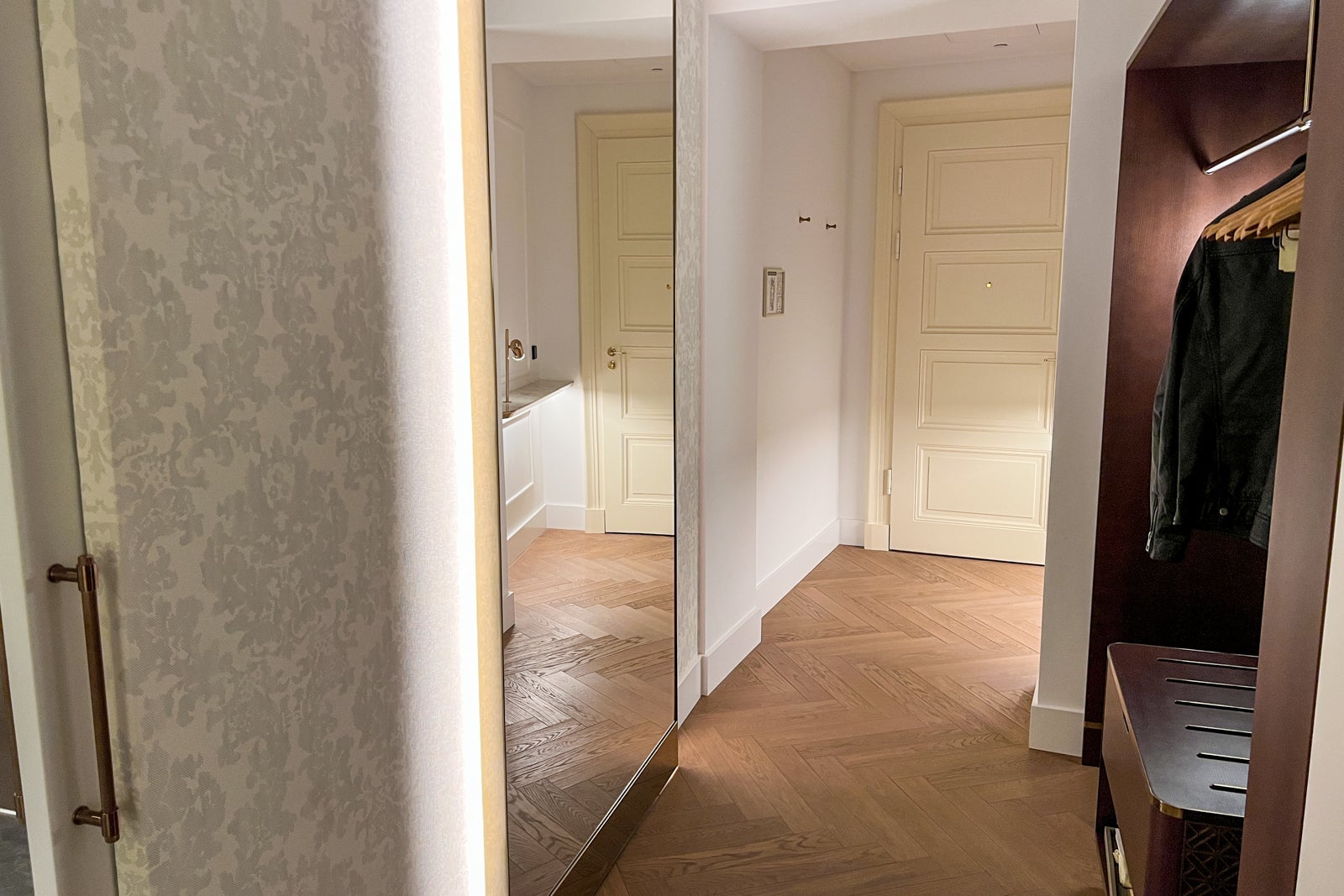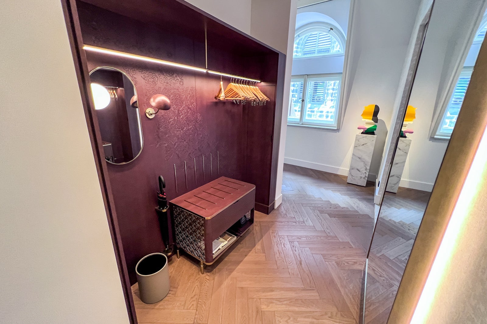You're greeted by a long hallway when you first walk into the room. You can immediately see the intuitive and modern design with the built-in wardrobe in the hallway and small lighted shelf for your keys and other pocket items. There is an open-concept closet with plenty of room for luggage and clothes, not to mention beautifully embossed wooden paneling. You'll also see a colorful bust sculpture at the end of the hallway, which adds a whimsical artistic touch and pulls the room together.