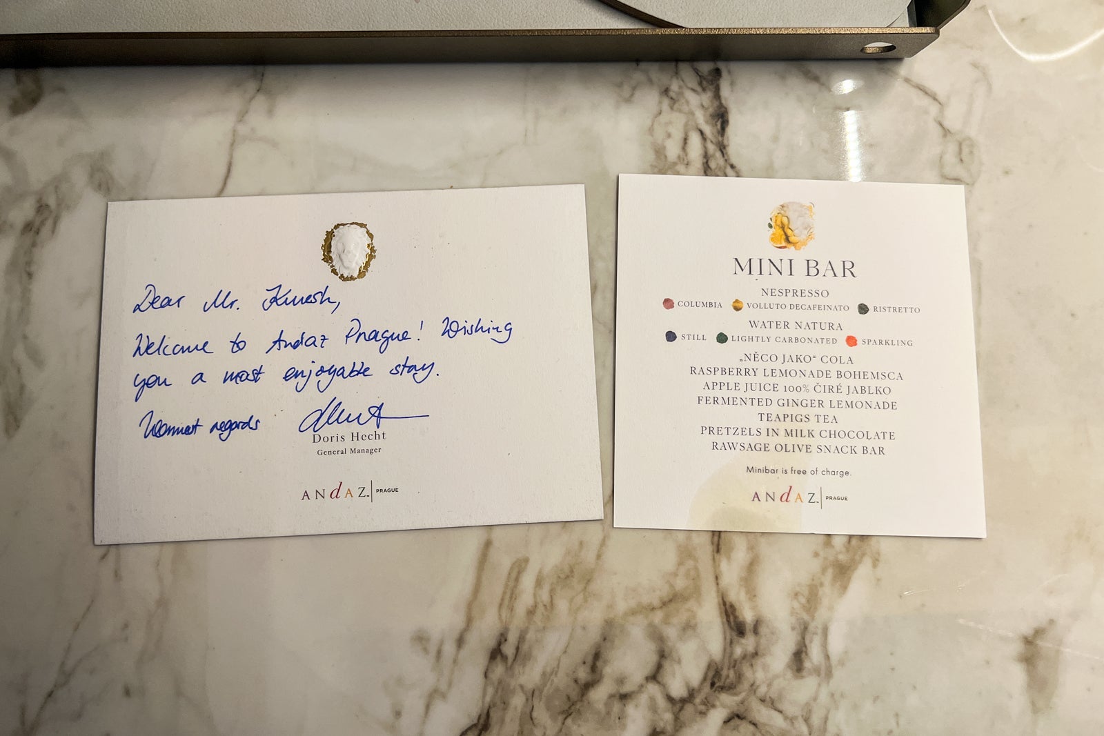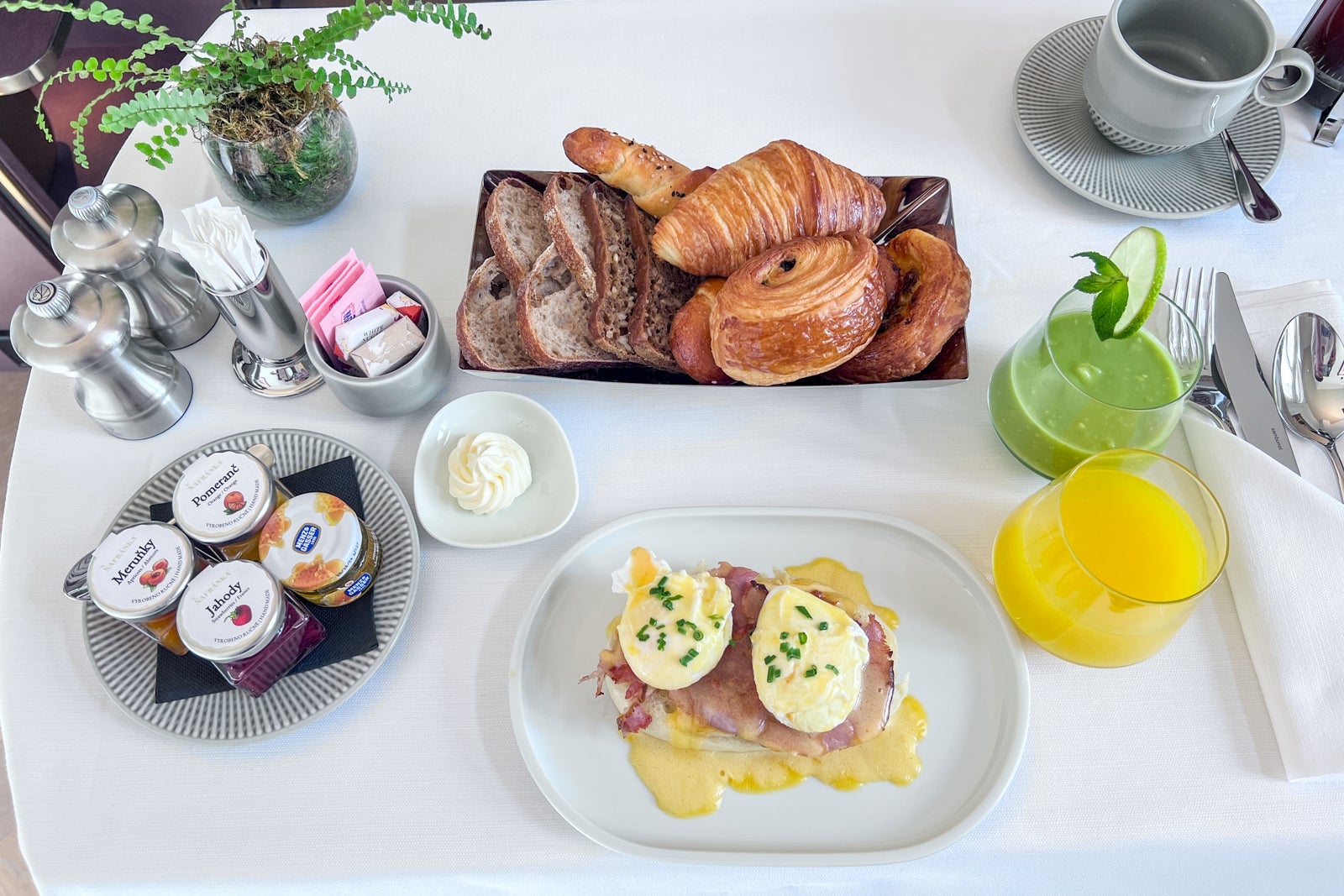 The Andaz Prague has an on-site restaurant and bar which offers sit-down service and room service. I opted to test Globalist breakfast benefits by ordering to the room using the paper card provided by housekeeping that I hung on my door before retiring for the evening.