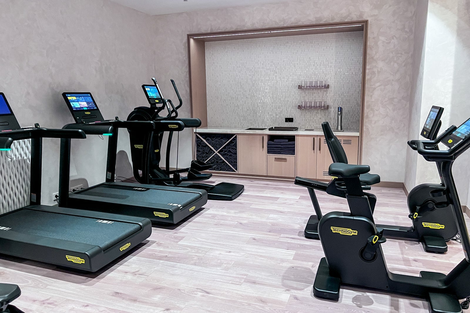 The workout room is basic, with a selection of cardio equipment and weights. There's also a water station and towels readily available.