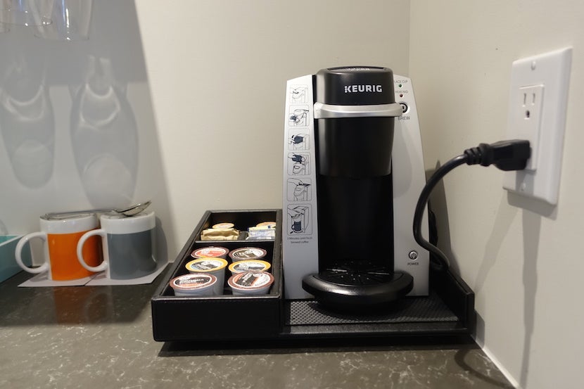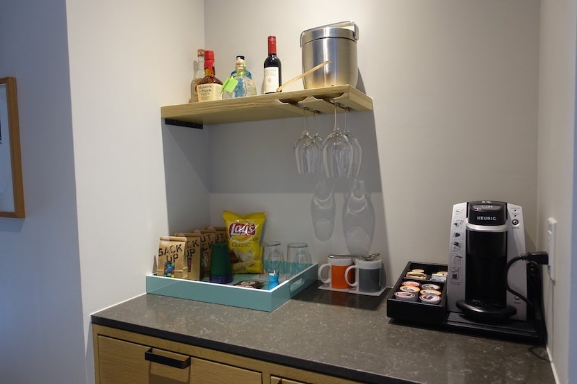 There was a Keurig machine, and below that was the fridge stocked with sodas, juices, water and beer.