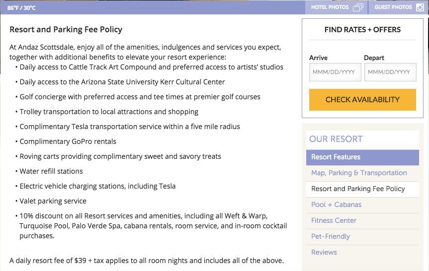 The hotel site broke down the resort fee into a host of conveniences and privileges most guests probably don't use. (You can find the full list in the image below.) If you were going to take advantage of the golf services, the Tesla service or the 10% discount more than I intended to, I'm sure you eke savings out of this, but it did not fit my needs at all.