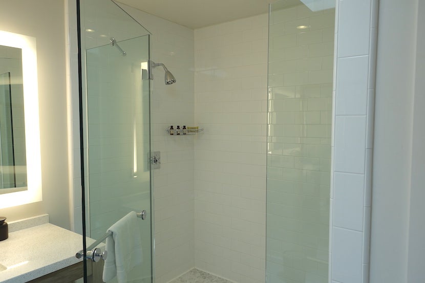 A large glassed-in walk-in shower with a single wall-mounted shower head was nice, but the knob only controlled the temperature, not the pressure, so if you wanted more or less flow you had to adjust the stream on the shower head itself.
