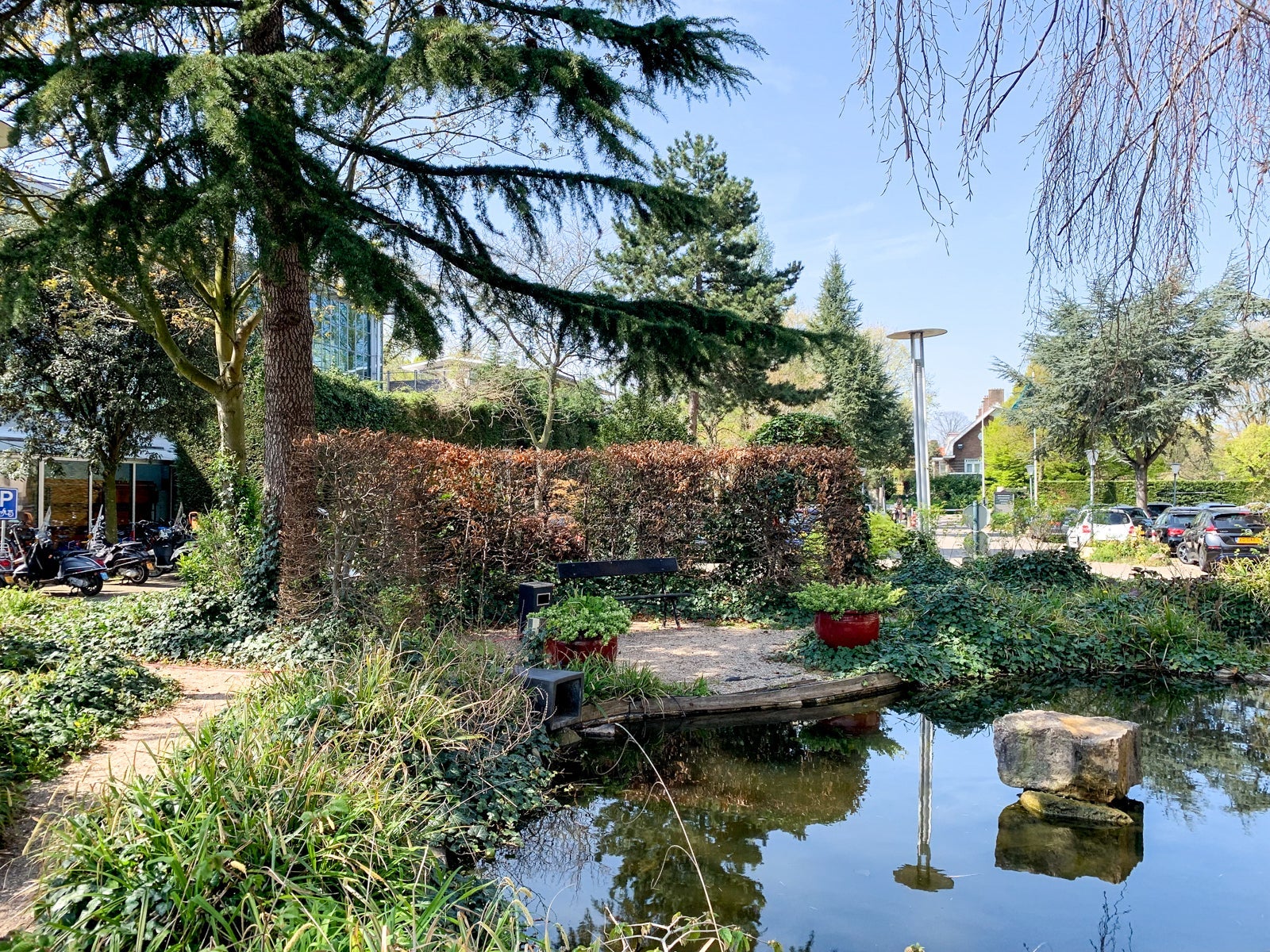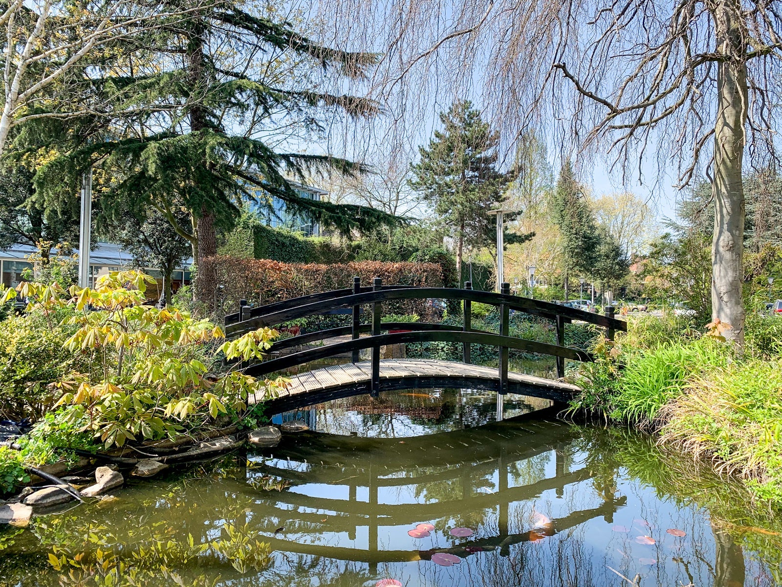 There was a small bridge over a koi pond, and benches to sit on.