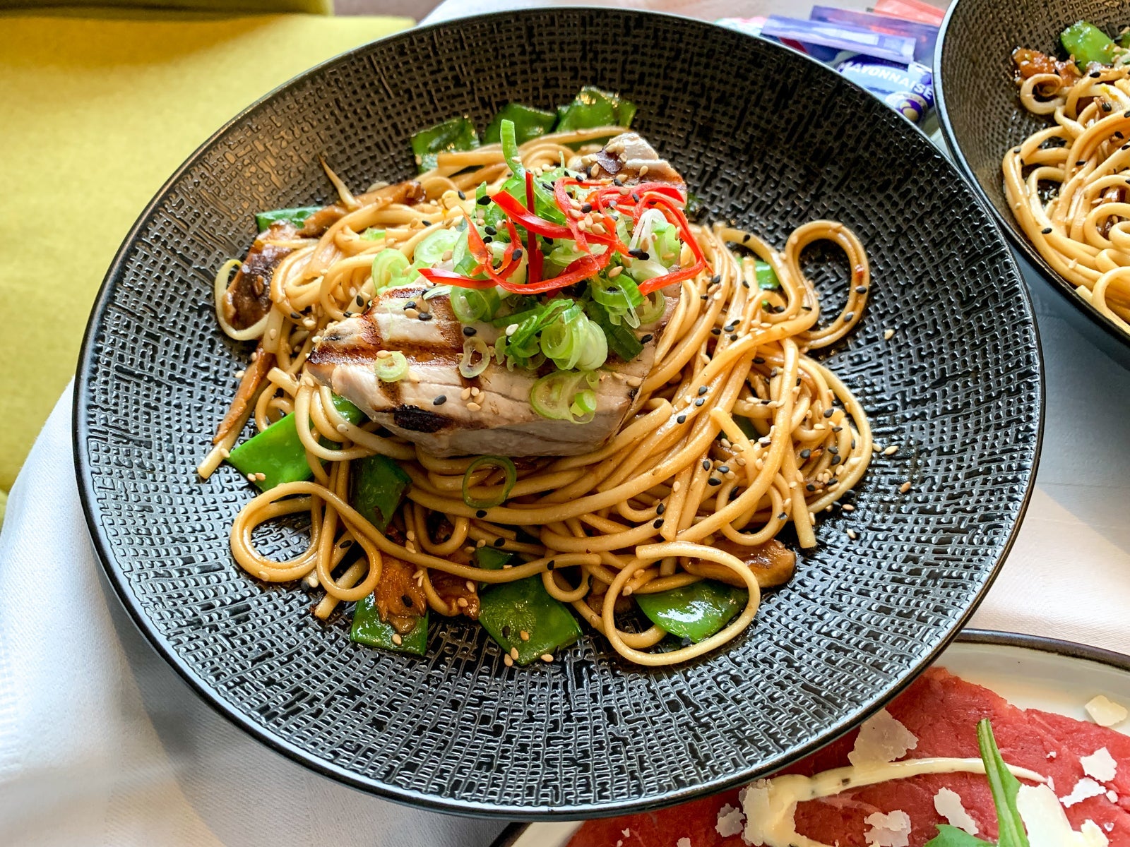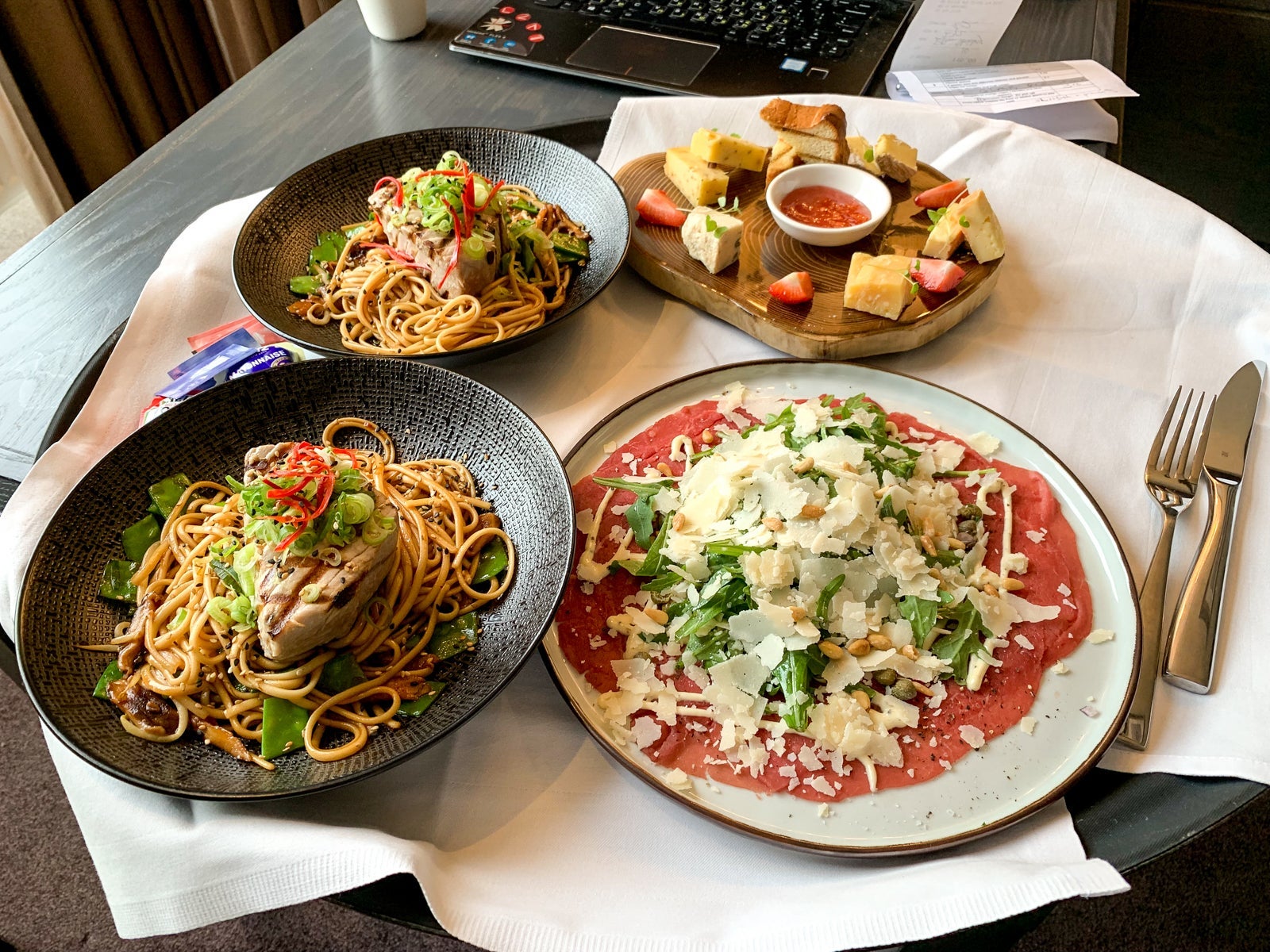 The hotel had two on-site restaurants: Bodon, a French restaurant, and The Harbor Club. Room service was catered directly from The Harbor Club, with a limited menu available, if you could find it hiding on your TV. We decided to order in the first night, splitting a beef tartare and cheese board and each getting a tuna filet on a bed of stir-fried noodles.