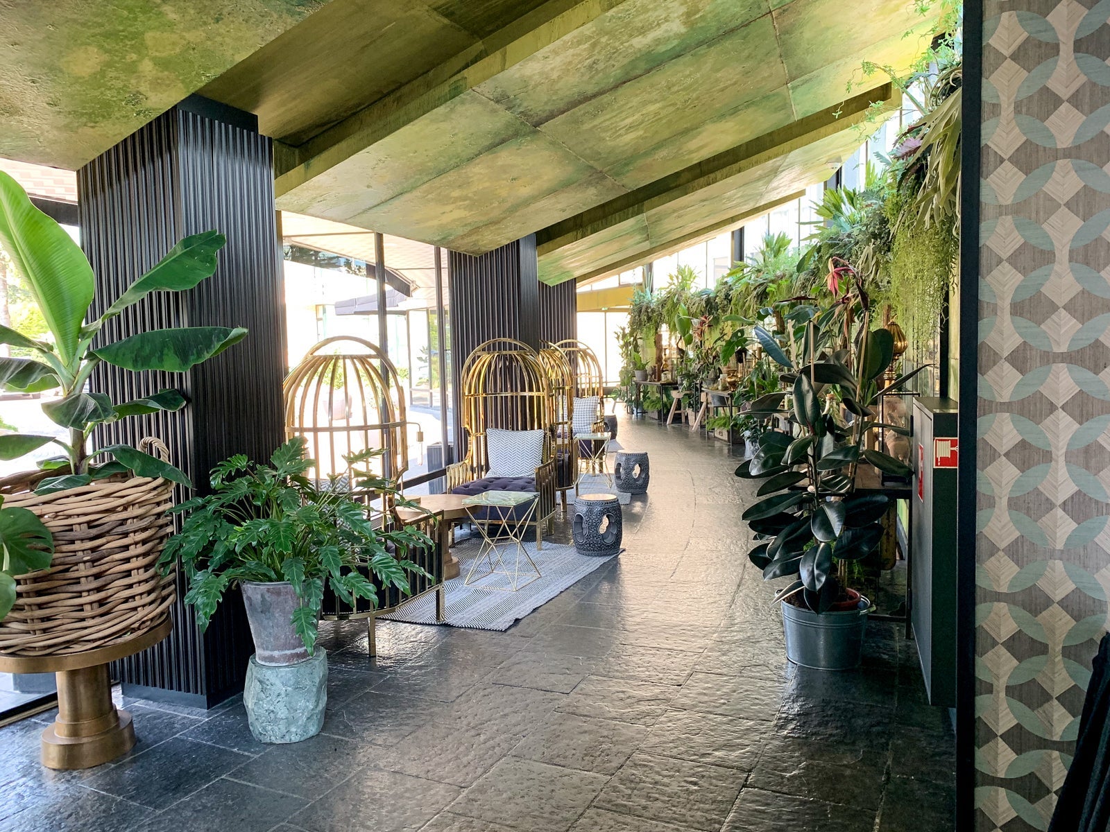 Getting from the lobby to the guest rooms required you to pass through a short greenhouse walkway dotted with golden egg chairs. While I assumed this was mostly decorative, as it was noticeably hotter in this area than in the rest of the lobby despite the same sun-facing windows.