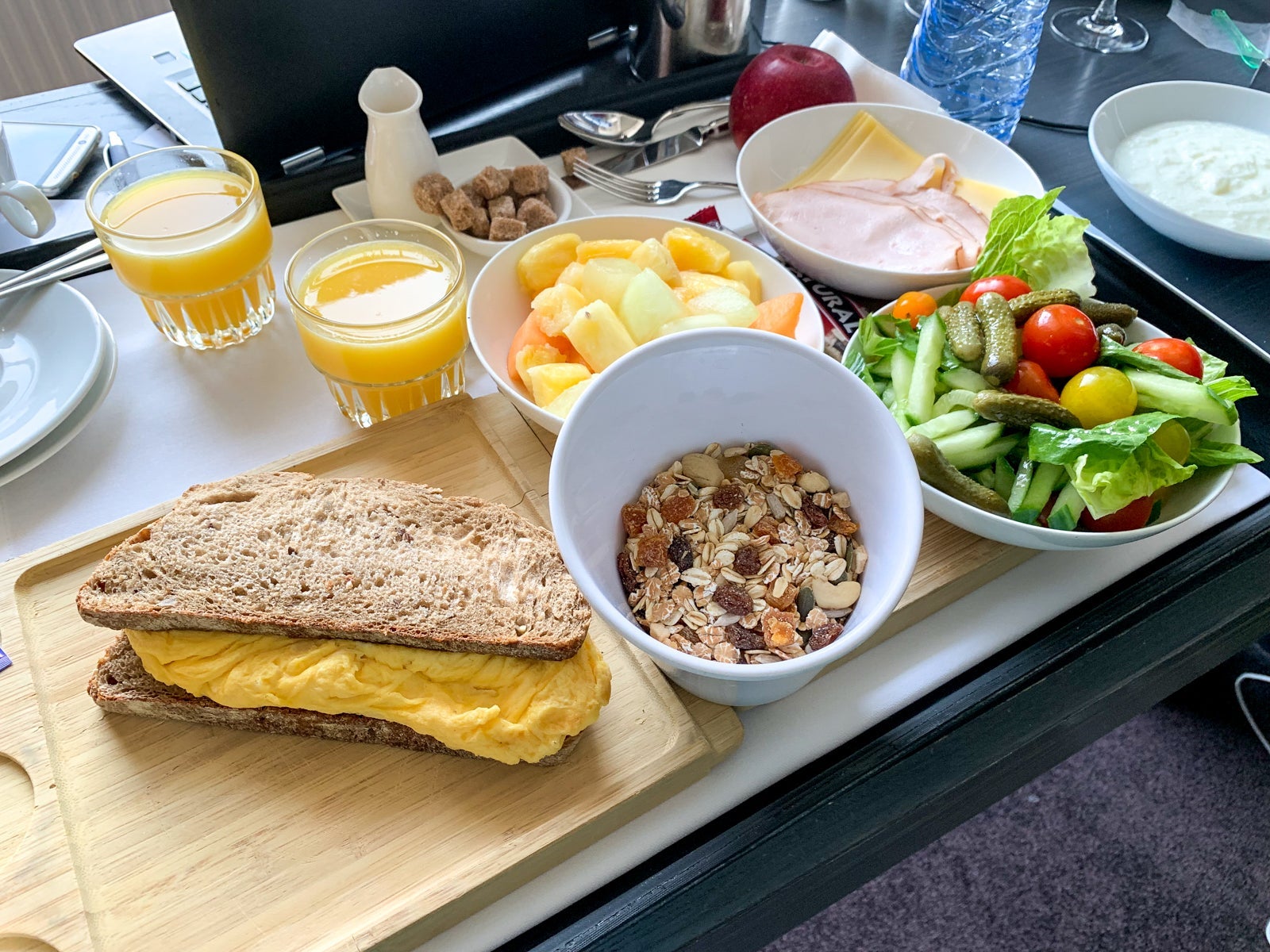 We ended up getting one healthy and one heavy breakfast, and they were accommodating of my friend's nut allergy. He also doesn't eat pork, so we asked if we could swap out the side of bacon, and they happily obliged and sent up turkey and cheese instead. Normally room-service charges are the most egregious part of a hotel stay, but breakfast was just 9.99 euros ($11) each and a single 5-euro ($5.50) delivery charge, which was not bad at all.