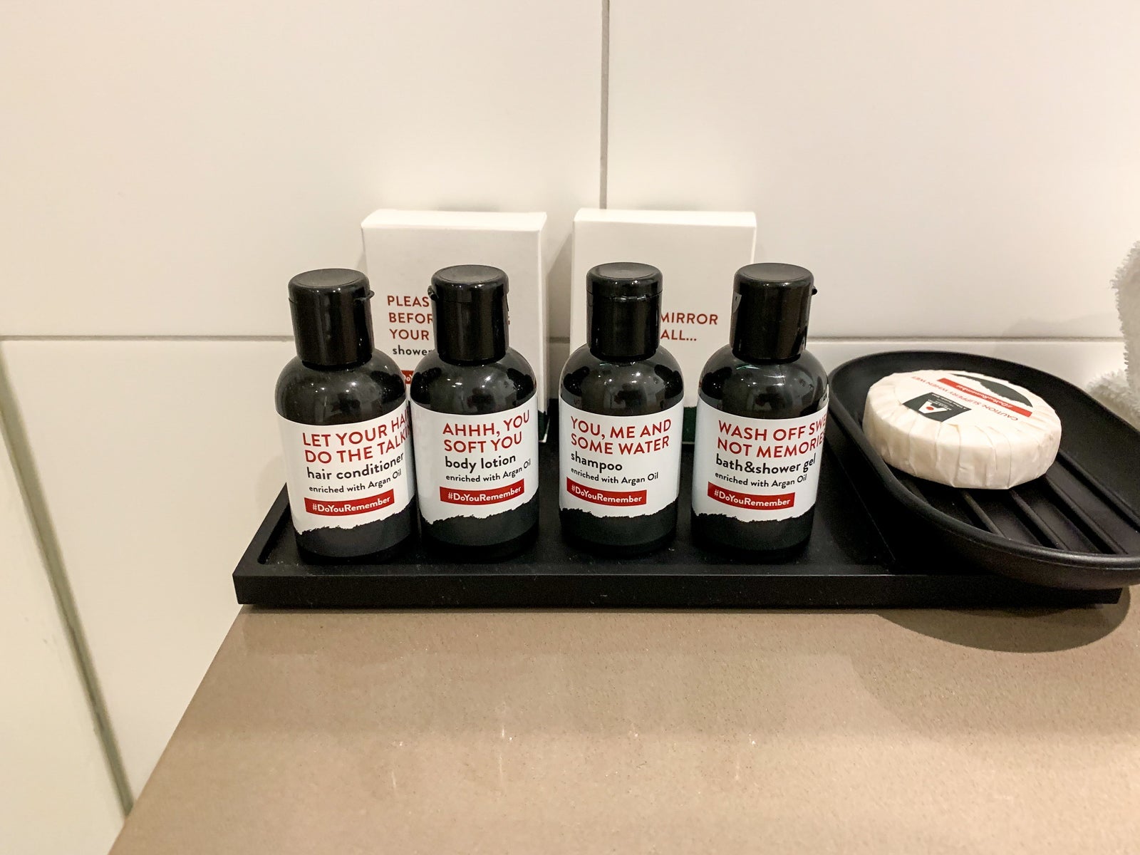 The toiletries weren't branded but had cute motivational phrases on them.