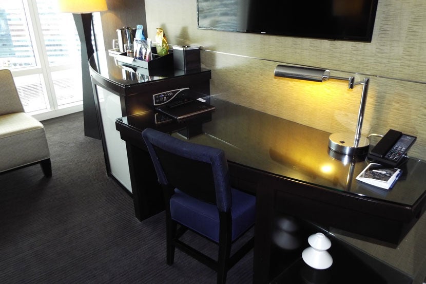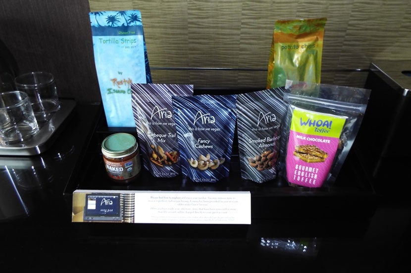 Adjacent to the desk was the mini-bar and snack area. Non-refrigerated snacks included potato chips and Aria-branded nuts.