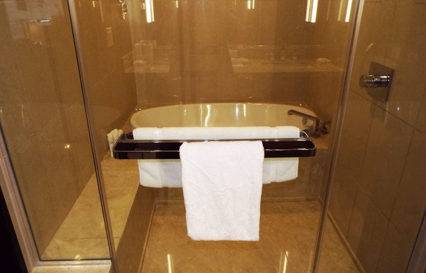 There was a walk-in shower with a large soaking tub next to it. I would have liked to see the frosted-glass theme continue in this area as well, though.