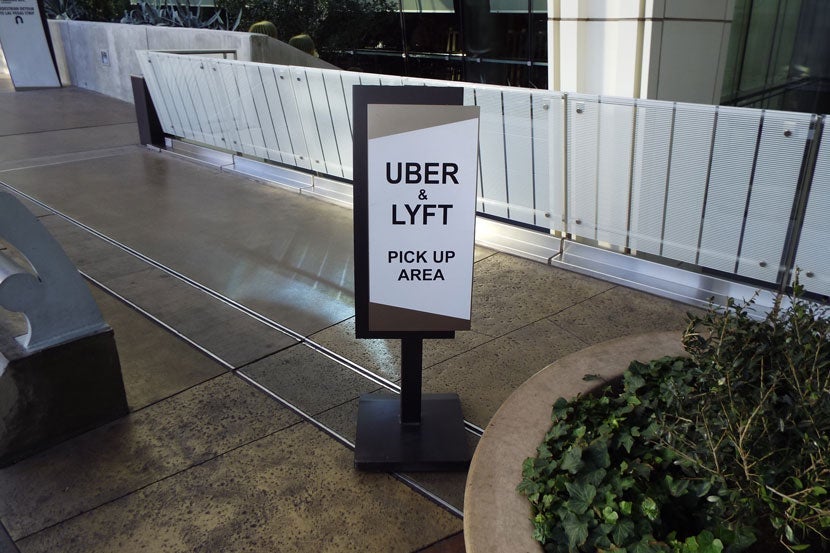 The Uber and Lyft stand was located at the north lobby entrance, which was more convenient to the guest elevators. (For some reason, this entrance was sometimes referred to as the "back lobby.") There was a walkway bridge here that connected the Aria with the Vdara.