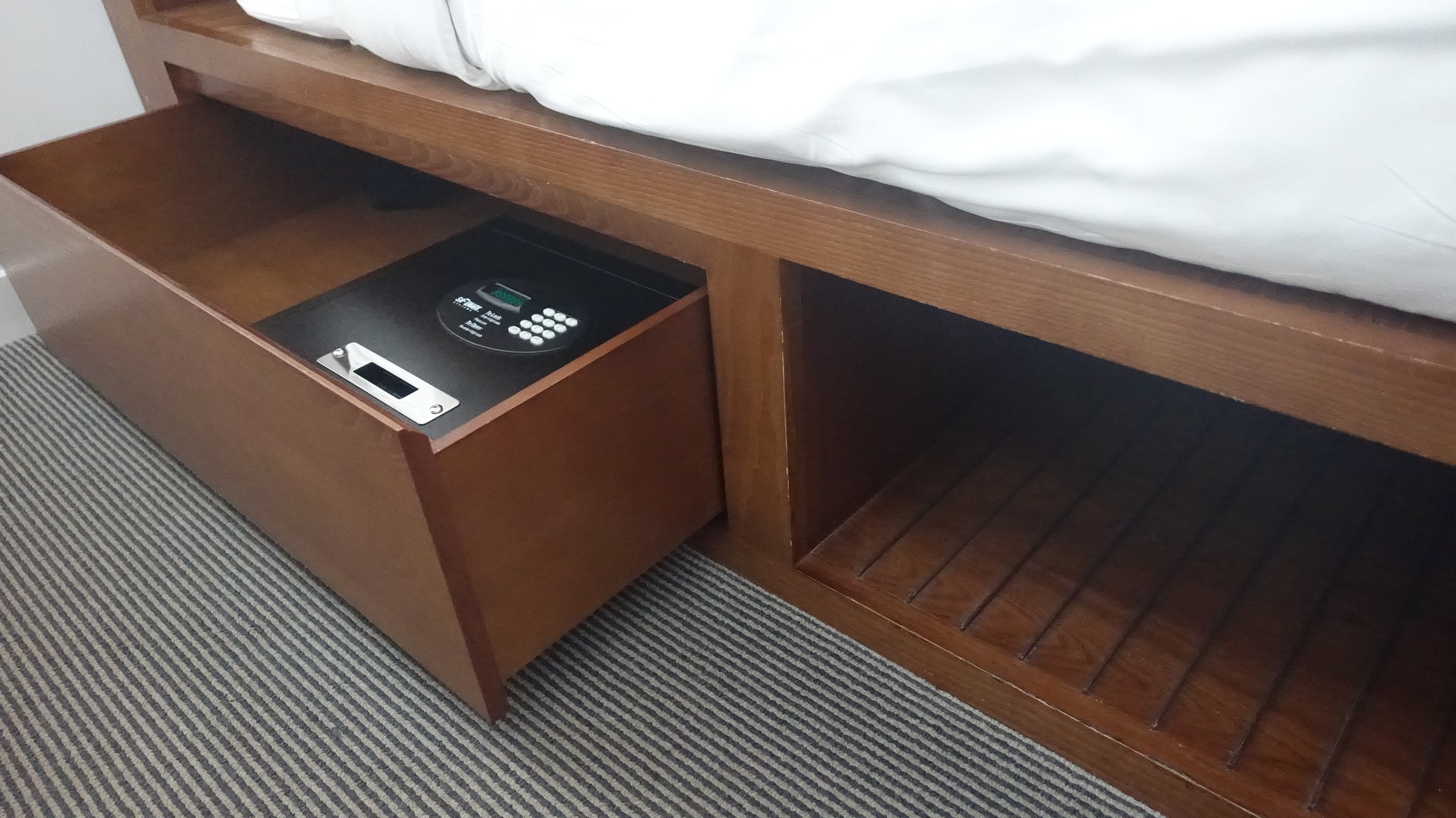 The hanging space was above a mini-fridge with two more complimentary cartons of water. The safe could be found in a drawer that pulled out from under the bed.